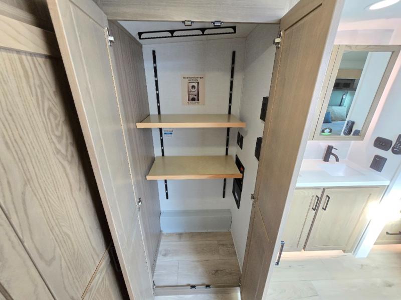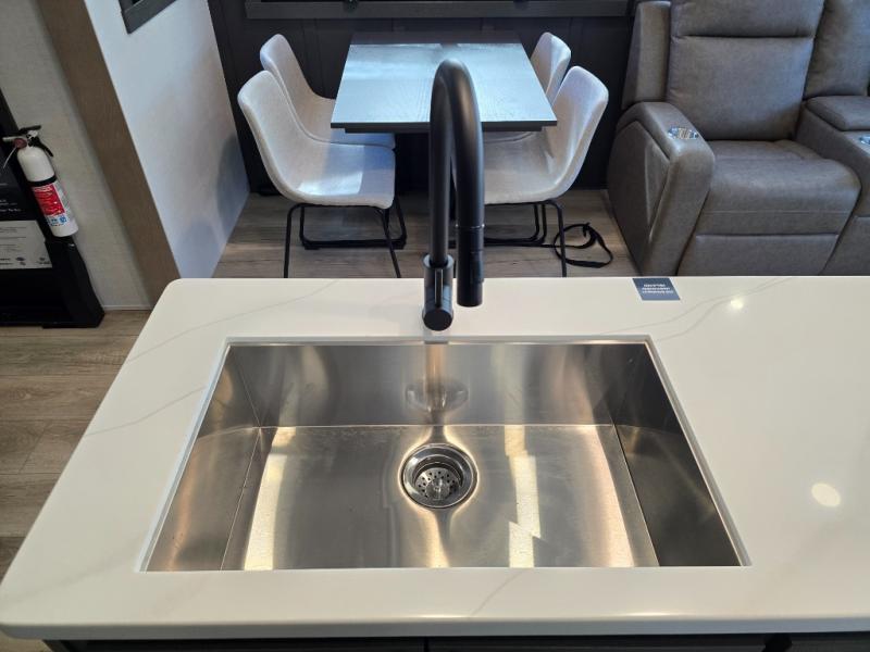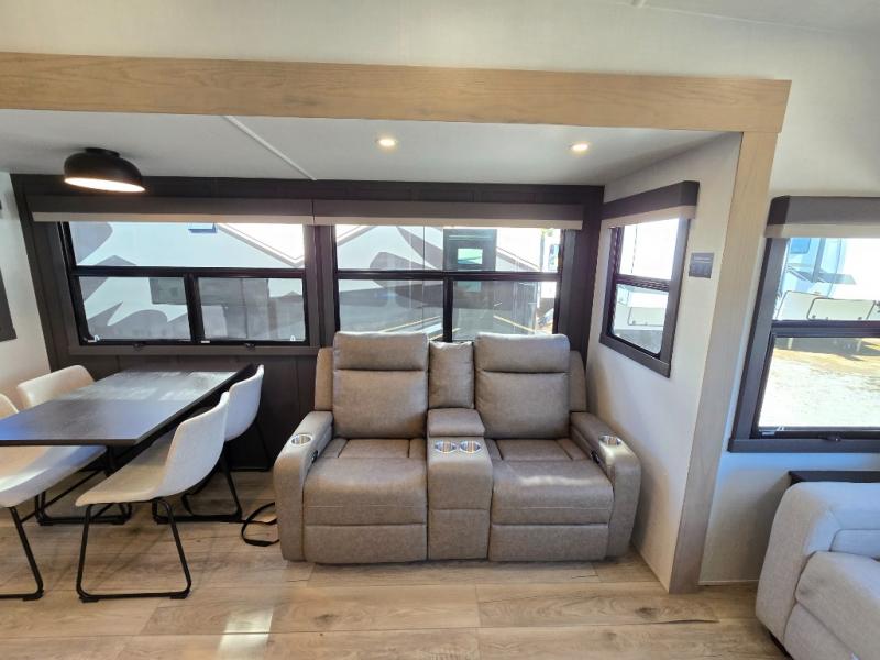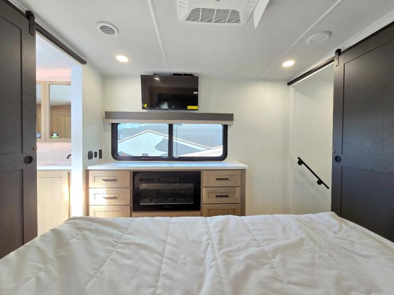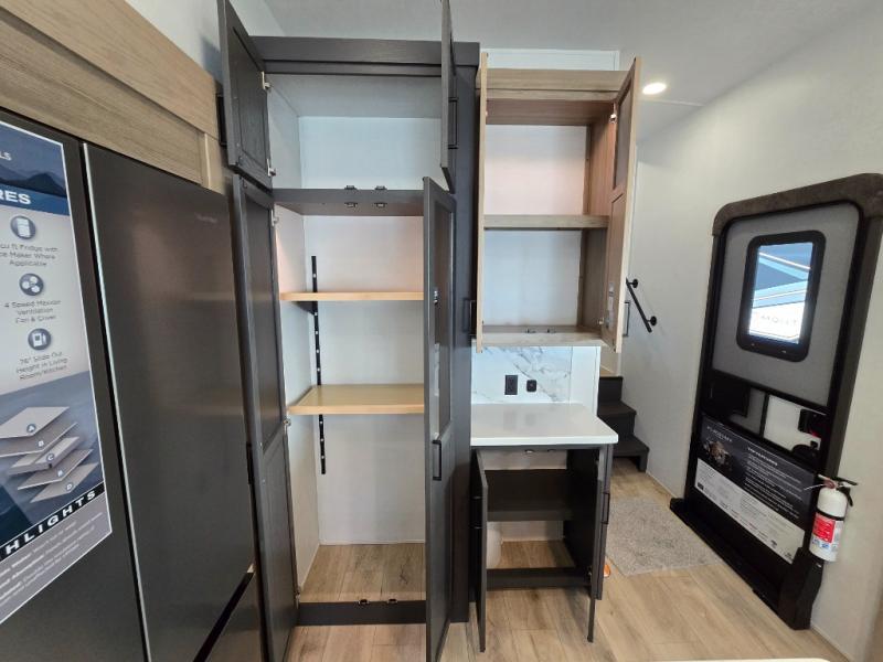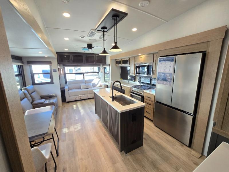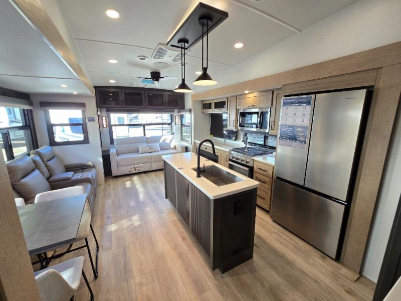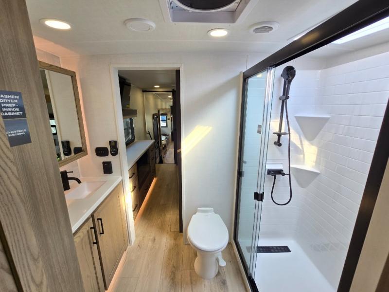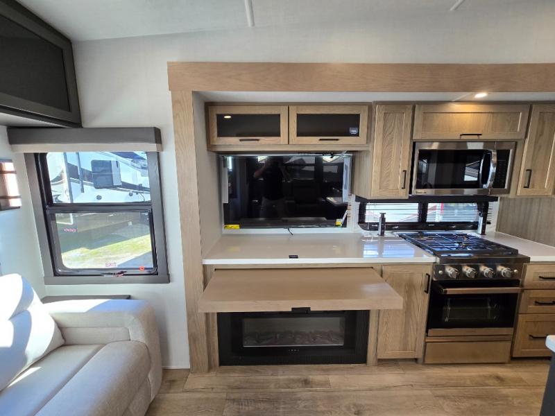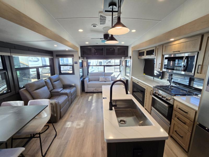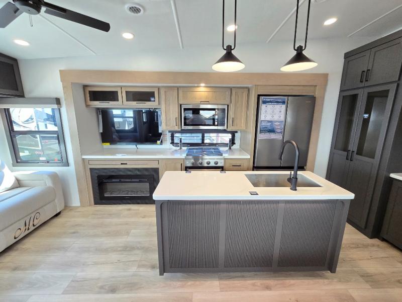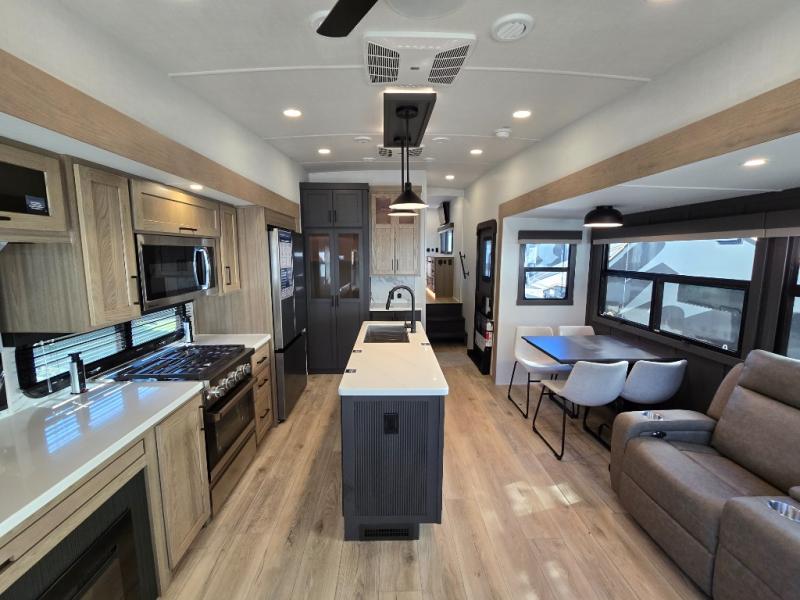 You can't go wrong when choosing this spacious fifth wheel! The master bedroom features a king bed slide out, wardrobe, and a dresser with a fireplace, and the full front bath is sure to bring comfort. There are dual bath sinks here, tons of storage, and even washer and dryer prep if you choose to add these appliances. The mid-coach half bath will come in handy if you have guests staying over on the rear hide-a-bed sofa. You'll also find a theater seat and a rotating table and chairs where you can dine and relax each day, plus there is a large kitchen island so the chef of your group has plenty of prep space. A Smart TV and fireplace will make your space feel more like home, and there is a pull-out desk here if you need to get some work done!