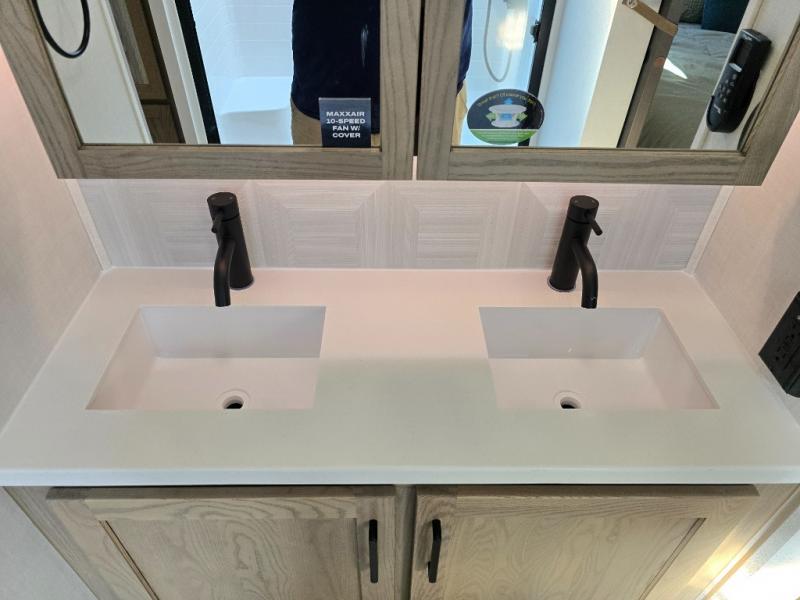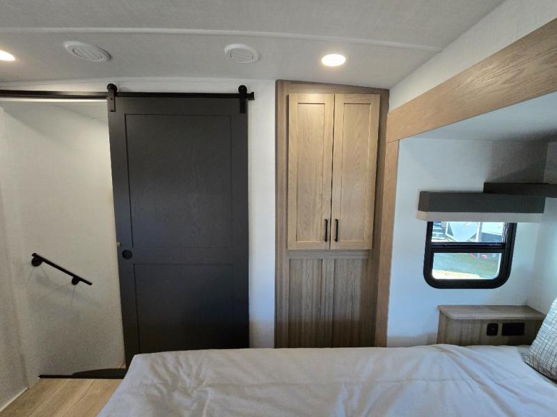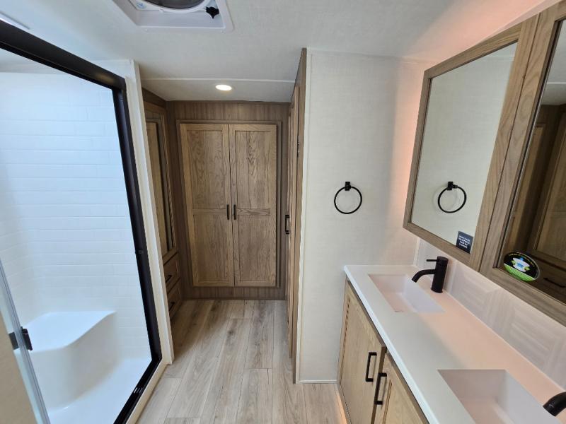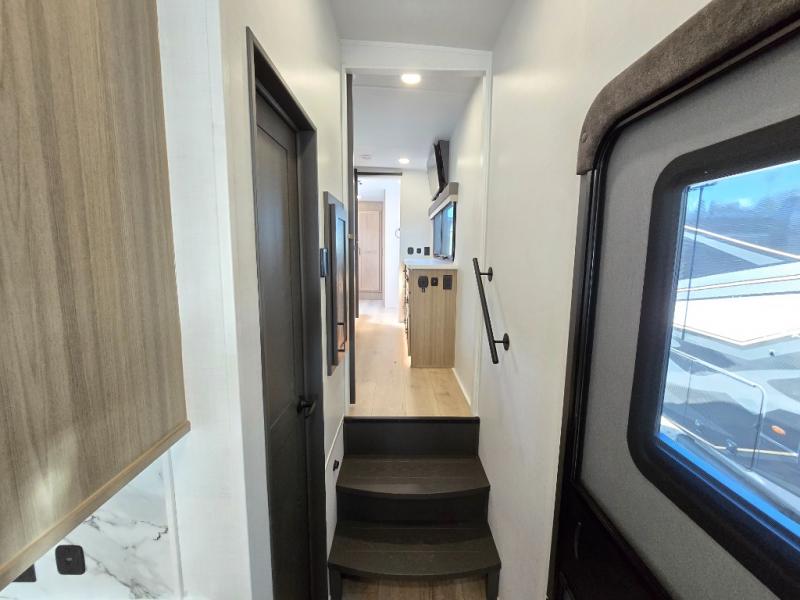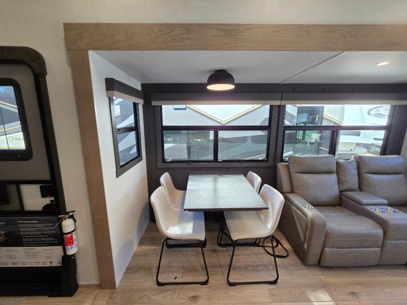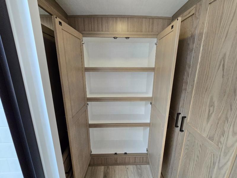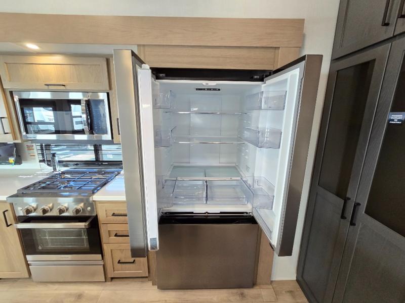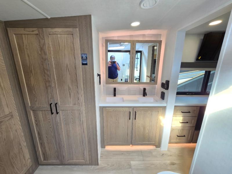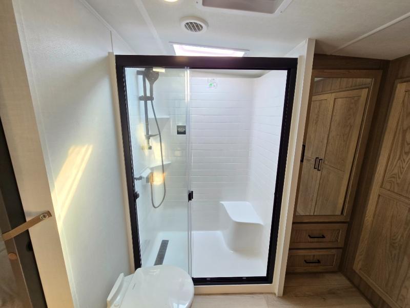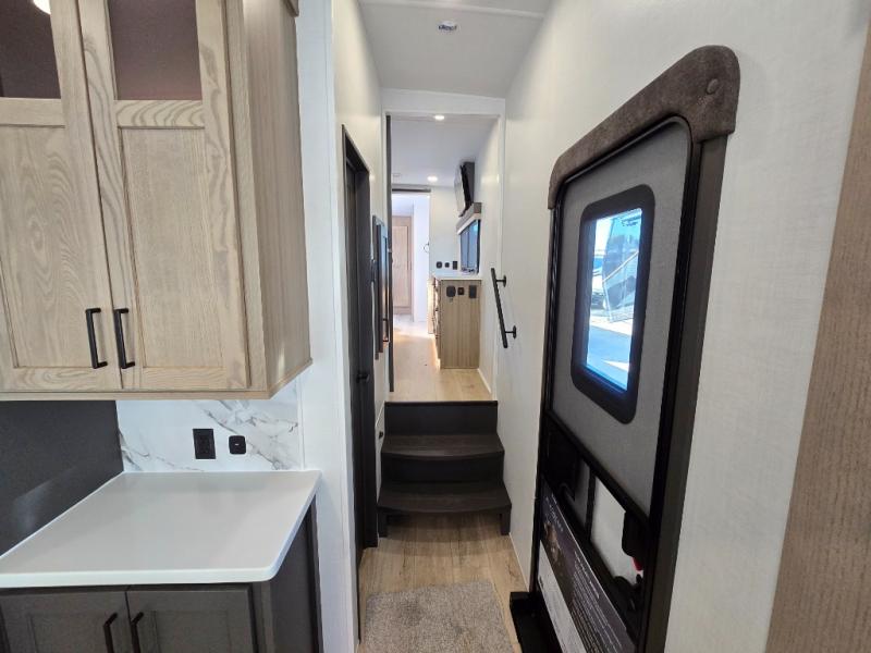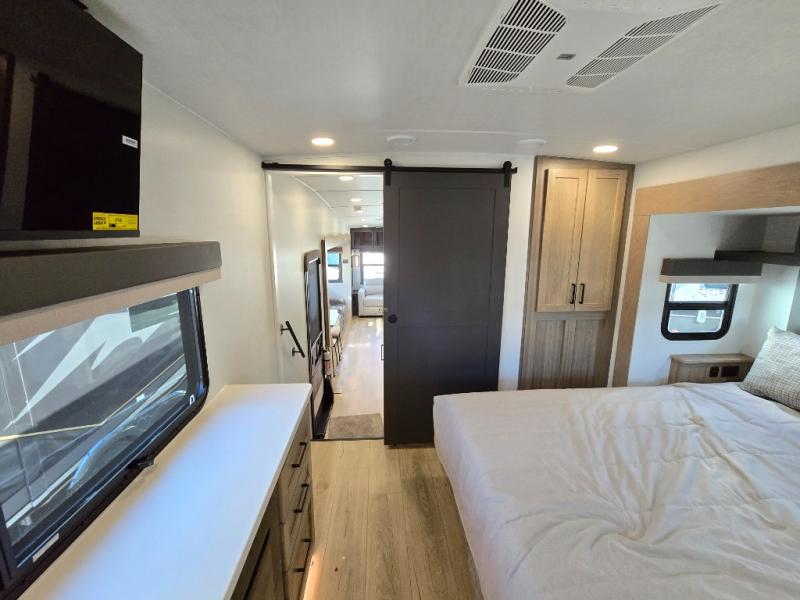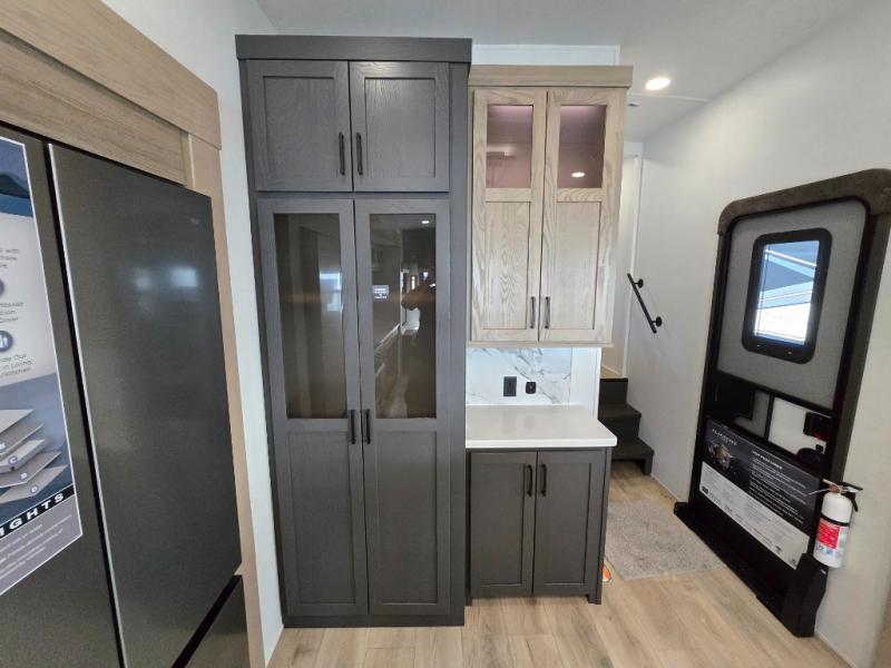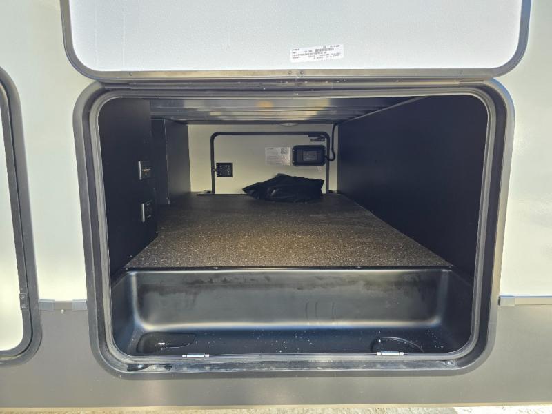 You can't go wrong when choosing this spacious fifth wheel! The master bedroom features a king bed slide out, wardrobe, and a dresser with a fireplace, and the full front bath is sure to bring comfort. There are dual bath sinks here, tons of storage, and even washer and dryer prep if you choose to add these appliances. The mid-coach half bath will come in handy if you have guests staying over on the rear hide-a-bed sofa. You'll also find a theater seat and a rotating table and chairs where you can dine and relax each day, plus there is a large kitchen island so the chef of your group has plenty of prep space. A Smart TV and fireplace will make your space feel more like home, and there is a pull-out desk here if you need to get some work done!
