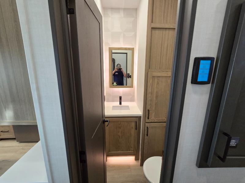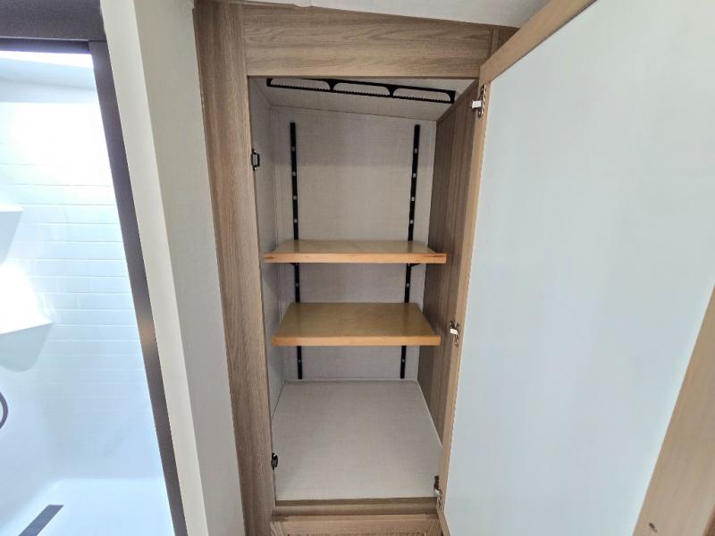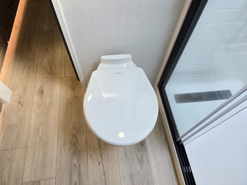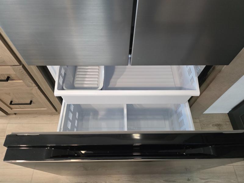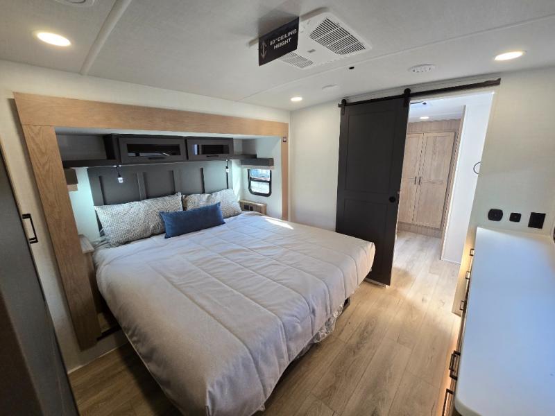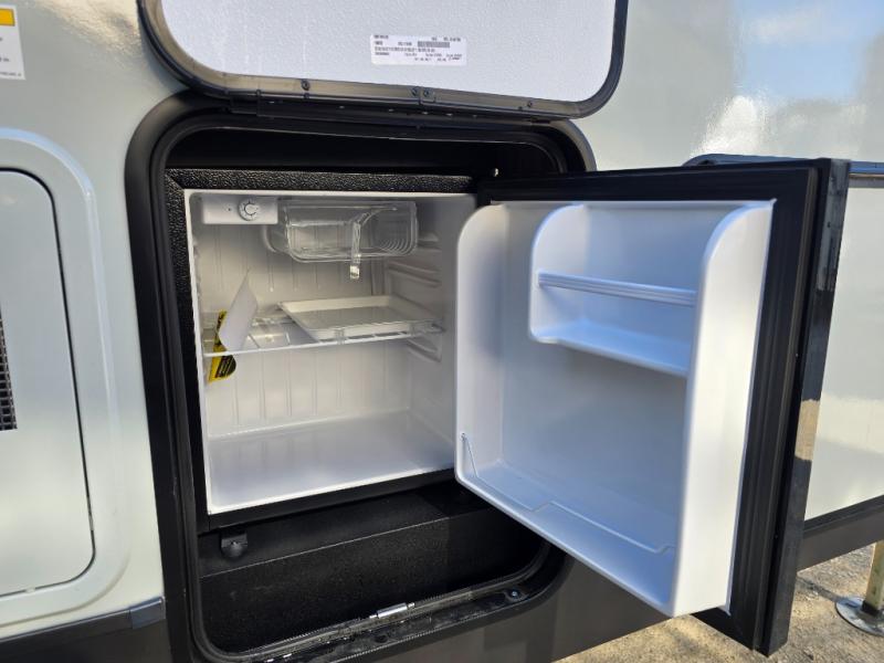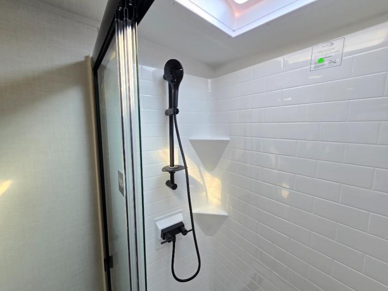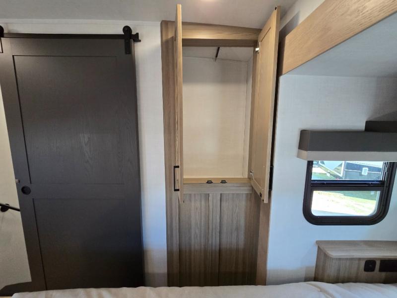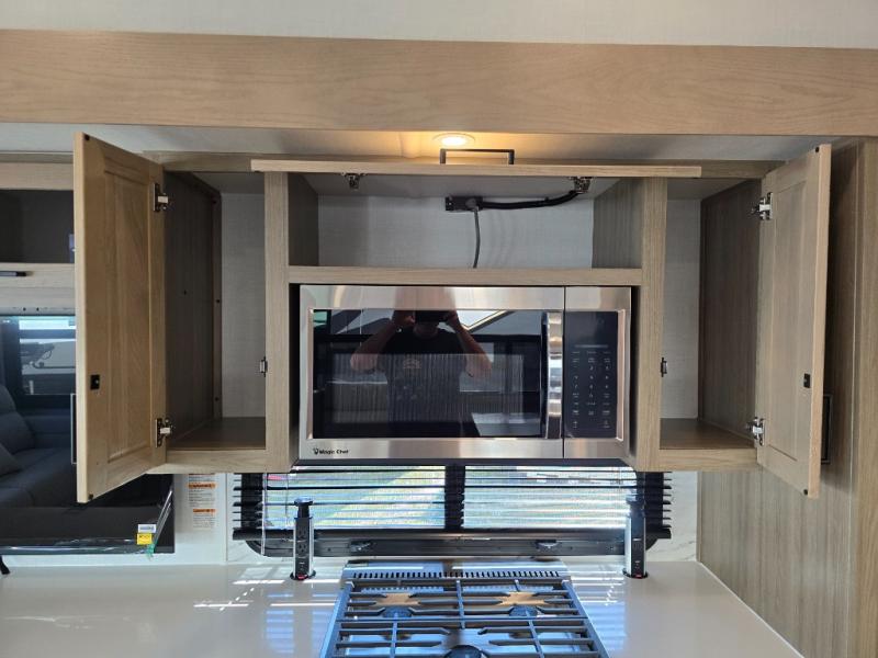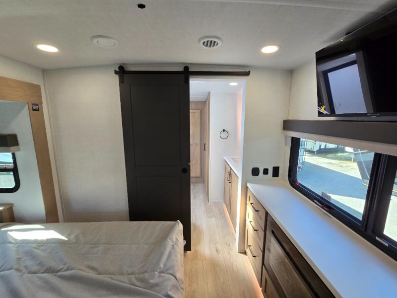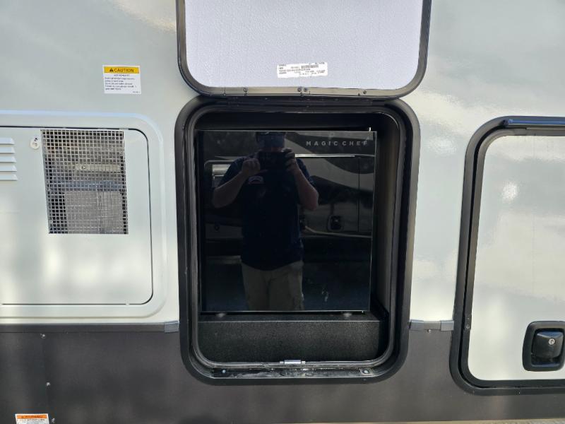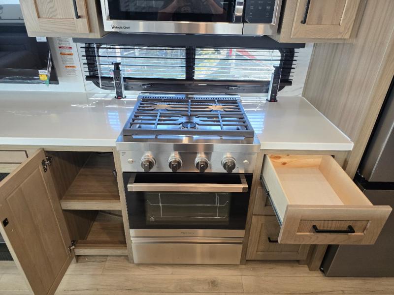 You can't go wrong when choosing this spacious fifth wheel! The master bedroom features a king bed slide out, wardrobe, and a dresser with a fireplace, and the full front bath is sure to bring comfort. There are dual bath sinks here, tons of storage, and even washer and dryer prep if you choose to add these appliances. The mid-coach half bath will come in handy if you have guests staying over on the rear hide-a-bed sofa. You'll also find a theater seat and a rotating table and chairs where you can dine and relax each day, plus there is a large kitchen island so the chef of your group has plenty of prep space. A Smart TV and fireplace will make your space feel more like home, and there is a pull-out desk here if you need to get some work done!