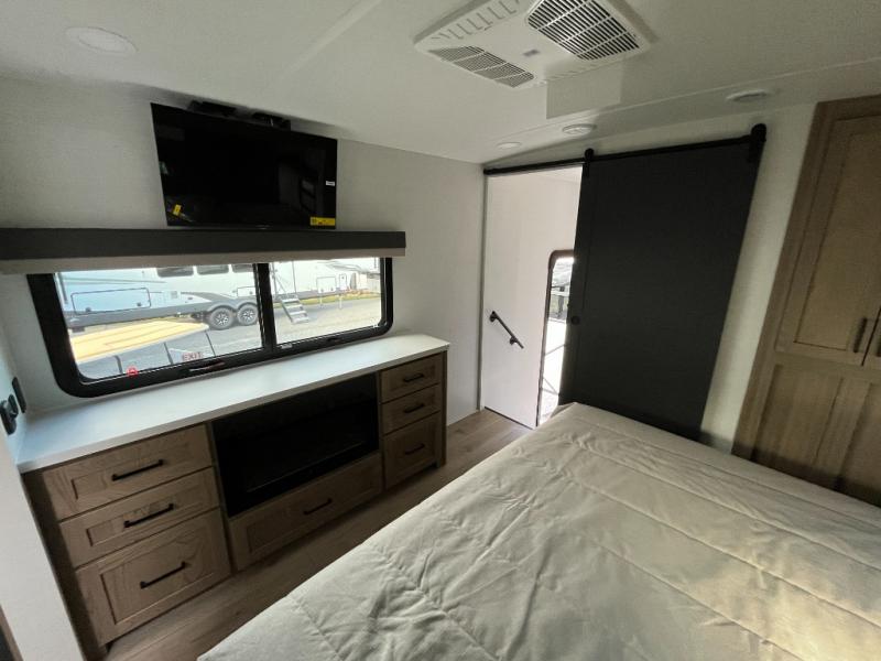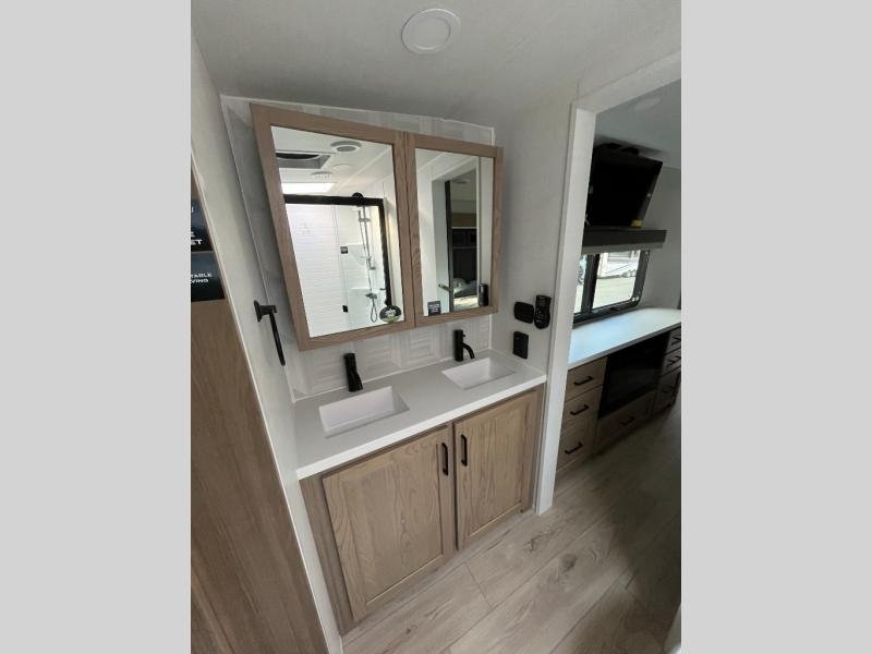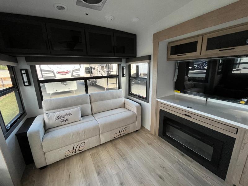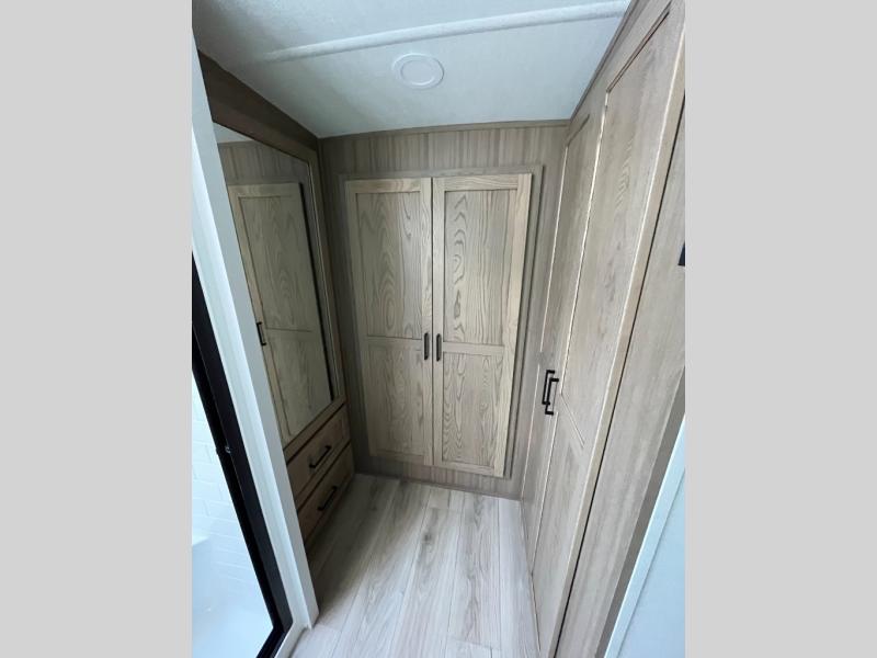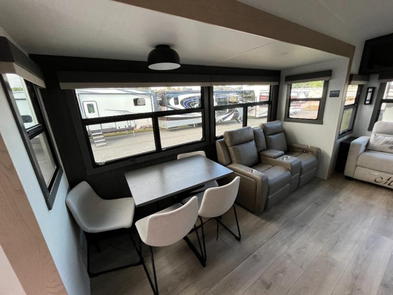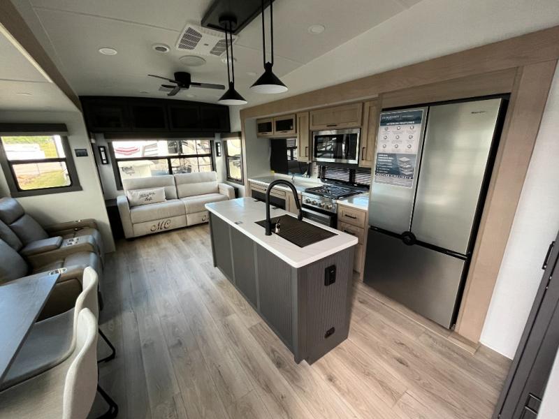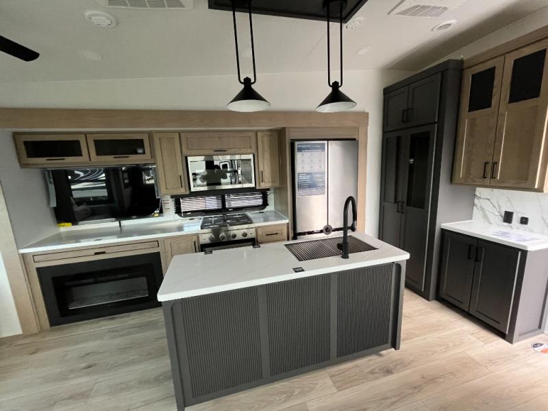 You can't go wrong when choosing this spacious fifth wheel! The master bedroom features a king bed slide out, wardrobe, and a dresser with a fireplace, and the full front bath is sure to bring comfort. There are dual bath sinks here, tons of storage, and even washer and dryer prep if you choose to add these appliances. The mid-coach half bath will come in handy if you have guests staying over on the rear hide-a-bed sofa. You'll also find a theater seat and a rotating table and chairs where you can dine and relax each day, plus there is a large kitchen island so the chef of your group has plenty of prep space. A Smart TV and fireplace will make your space feel more like home, and there is a pull-out desk here if you need to get some work done!