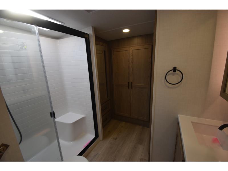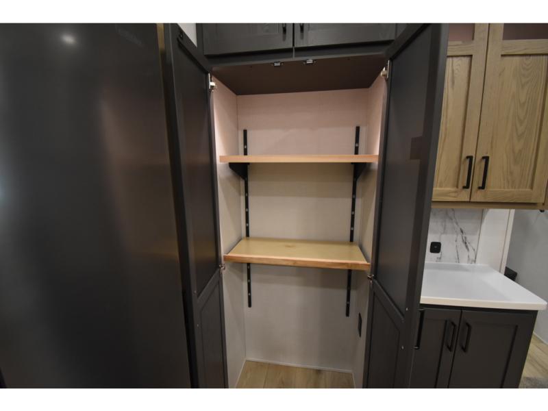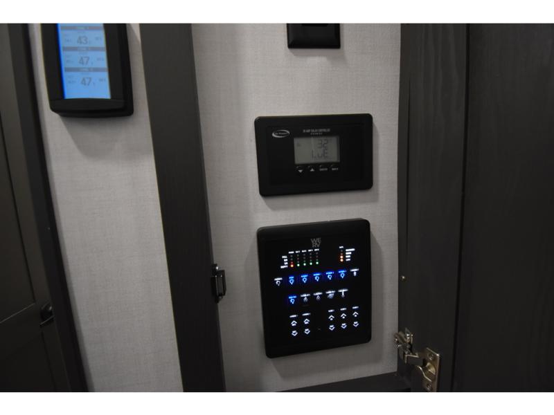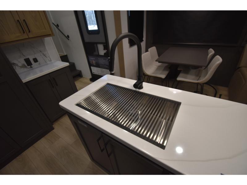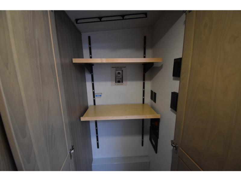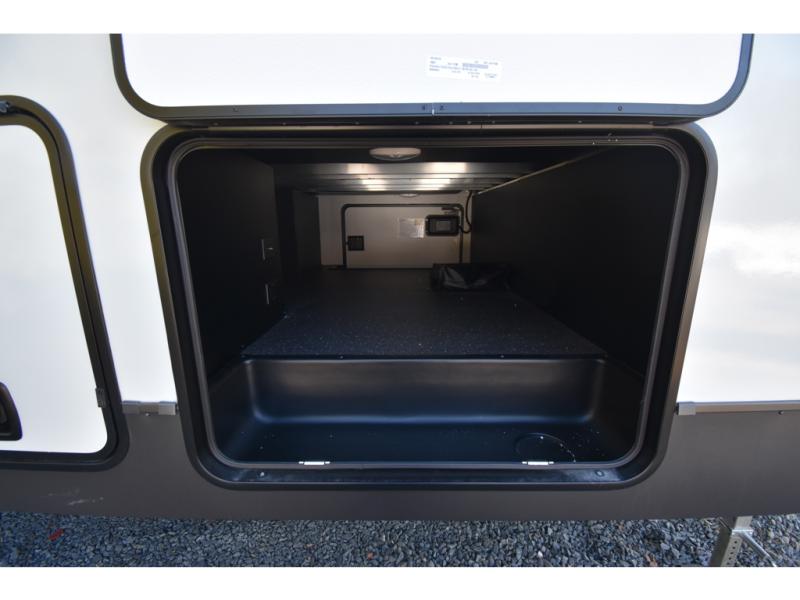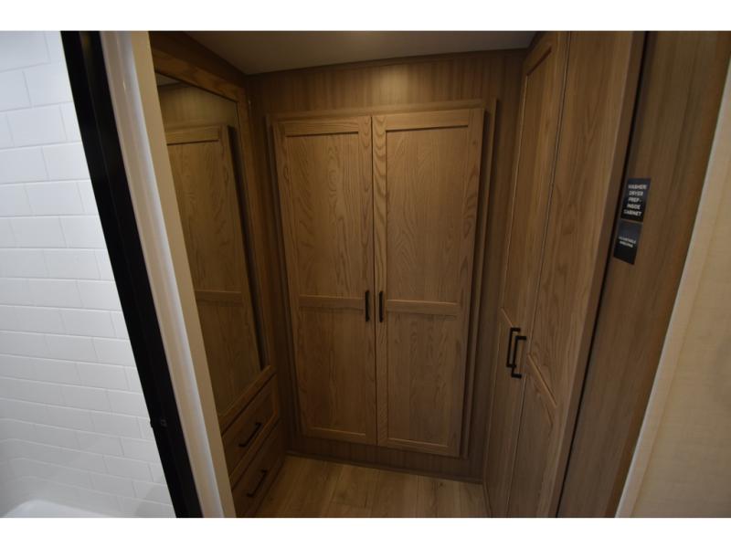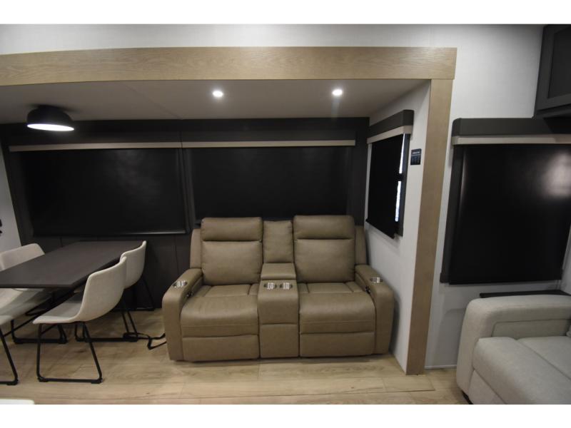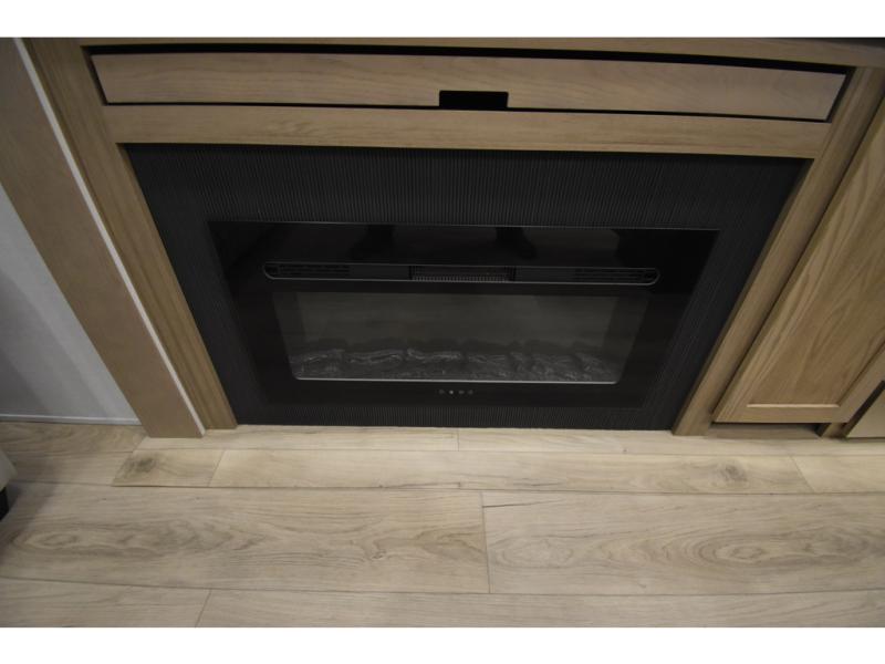 You can't go wrong when choosing this spacious fifth wheel! The master bedroom features a king bed slide out, wardrobe, and a dresser with a fireplace, and the full front bath is sure to bring comfort. There are dual bath sinks here, tons of storage, and even washer and dryer prep if you choose to add these appliances. The mid-coach half bath will come in handy if you have guests staying over on the rear hide-a-bed sofa. You'll also find a theater seat and a rotating table and chairs where you can dine and relax each day, plus there is a large kitchen island so the chef of your group has plenty of prep space. A Smart TV and fireplace will make your space feel more like home, and there is a pull-out desk here if you need to get some work done!