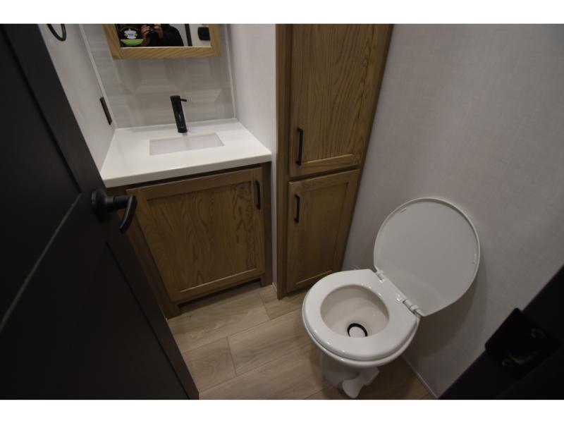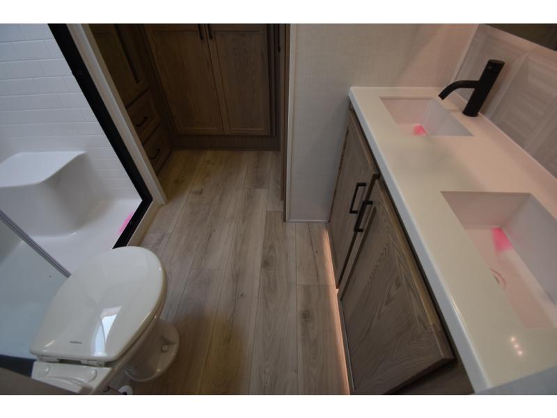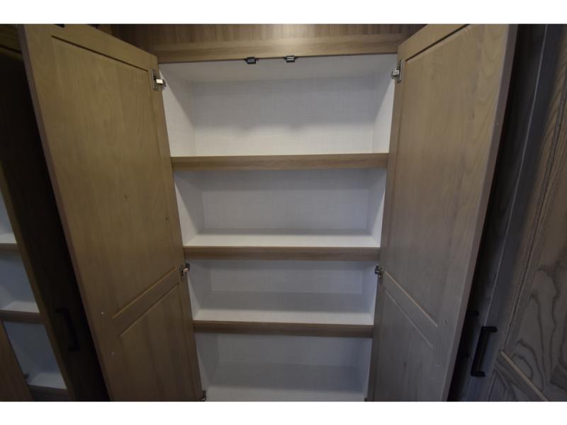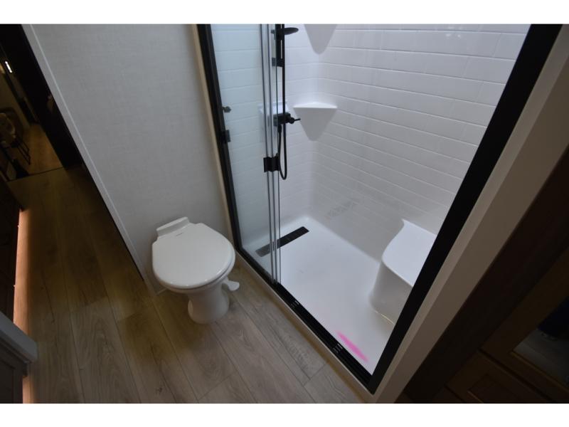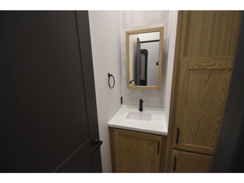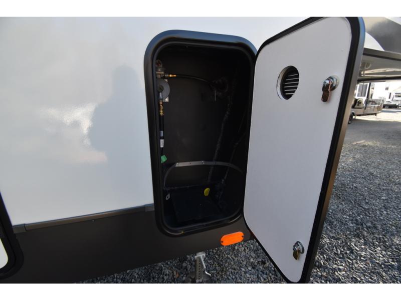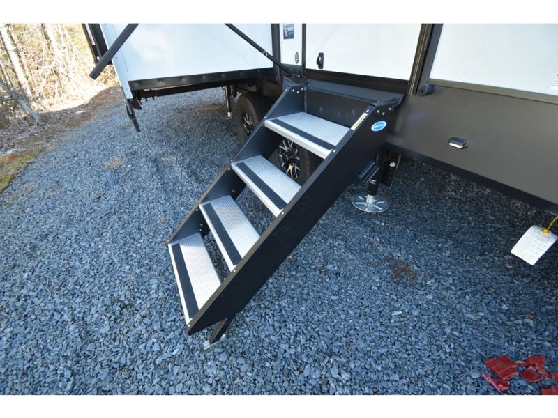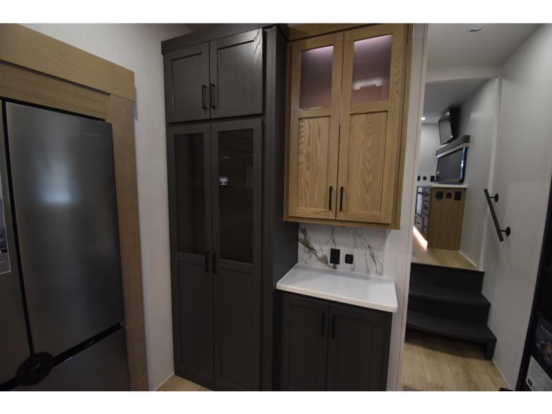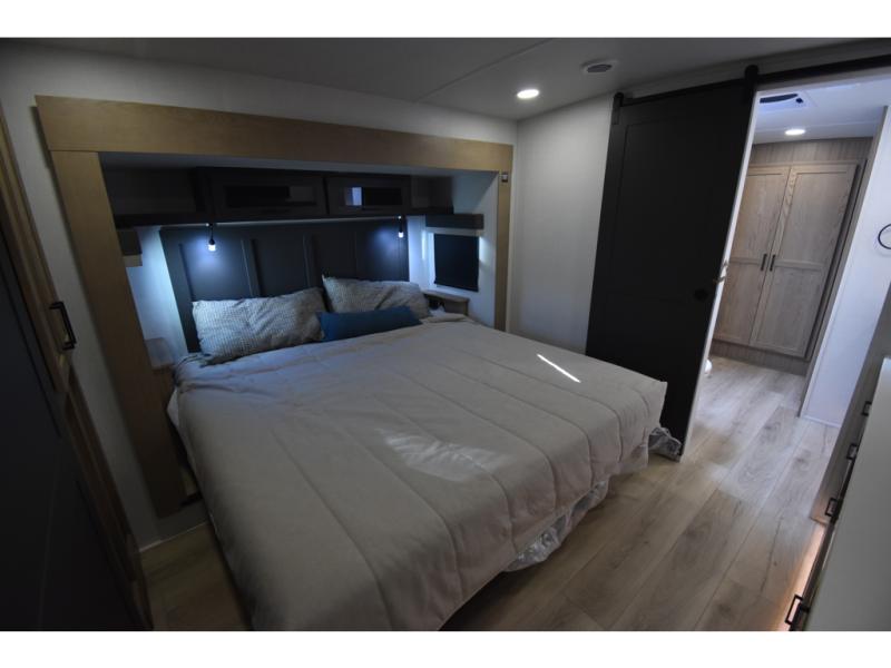 You can't go wrong when choosing this spacious fifth wheel! The master bedroom features a king bed slide out, wardrobe, and a dresser with a fireplace, and the full front bath is sure to bring comfort. There are dual bath sinks here, tons of storage, and even washer and dryer prep if you choose to add these appliances. The mid-coach half bath will come in handy if you have guests staying over on the rear hide-a-bed sofa. You'll also find a theater seat and a rotating table and chairs where you can dine and relax each day, plus there is a large kitchen island so the chef of your group has plenty of prep space. A Smart TV and fireplace will make your space feel more like home, and there is a pull-out desk here if you need to get some work done!