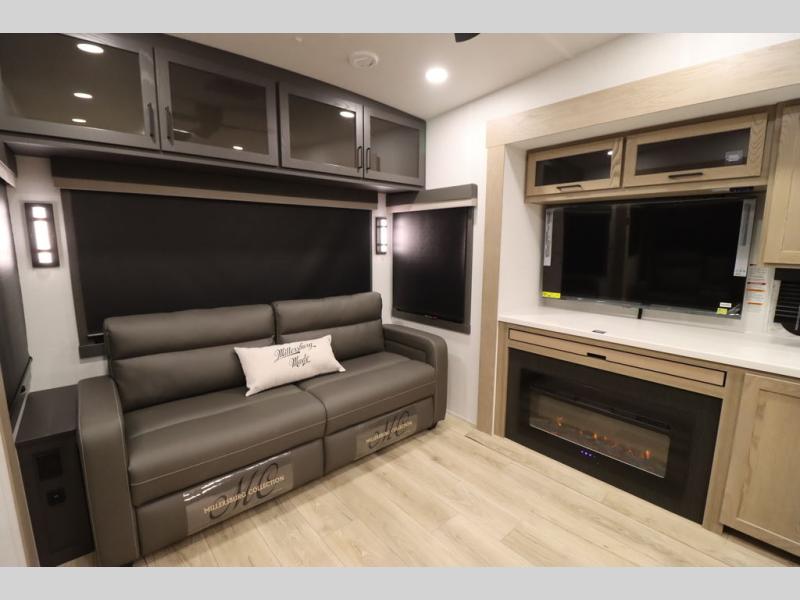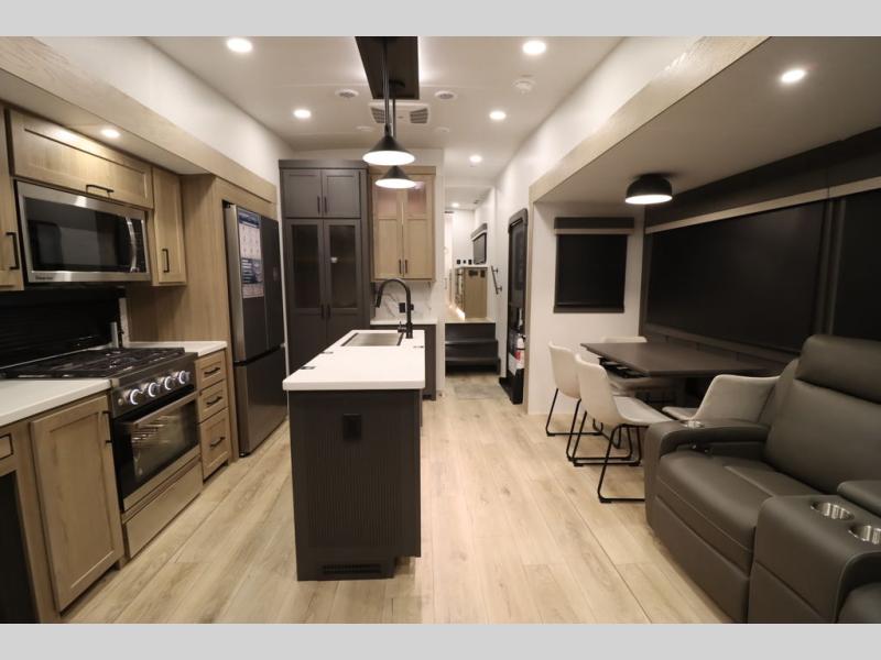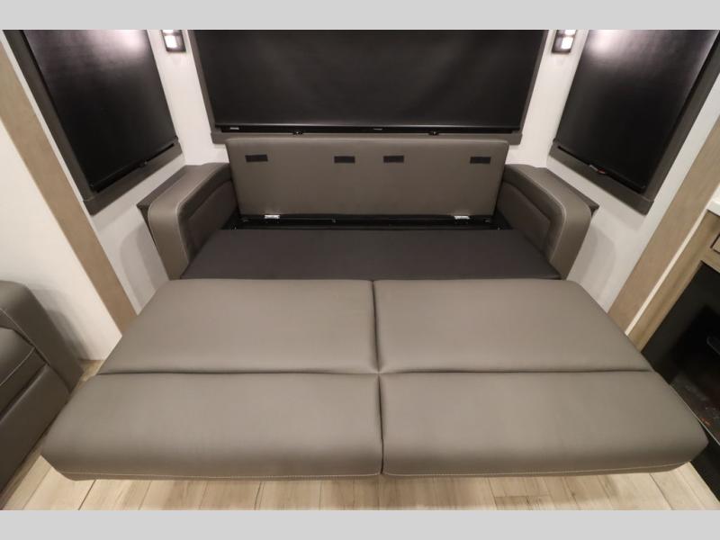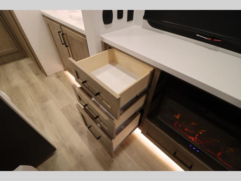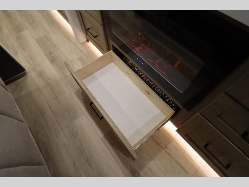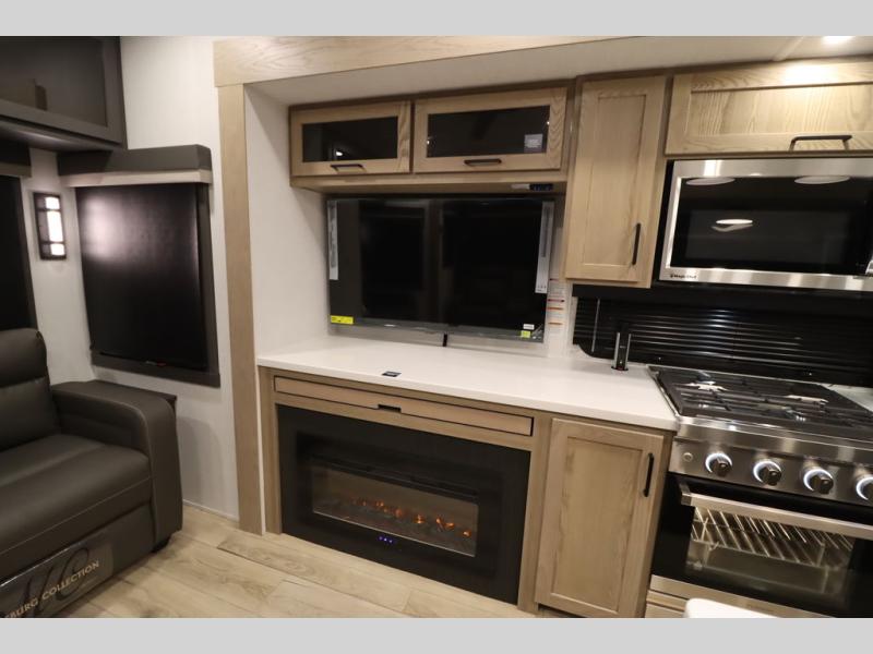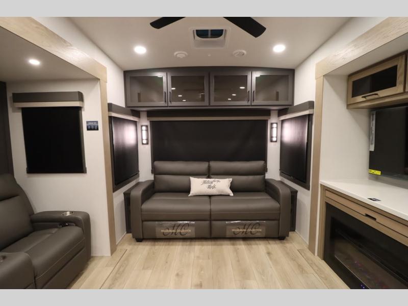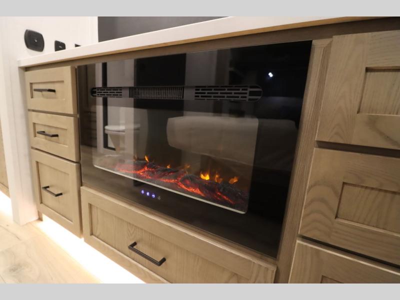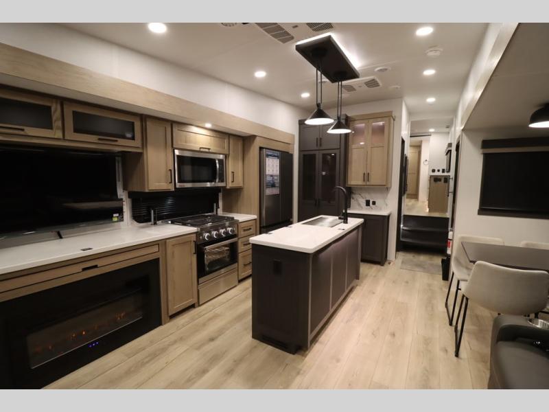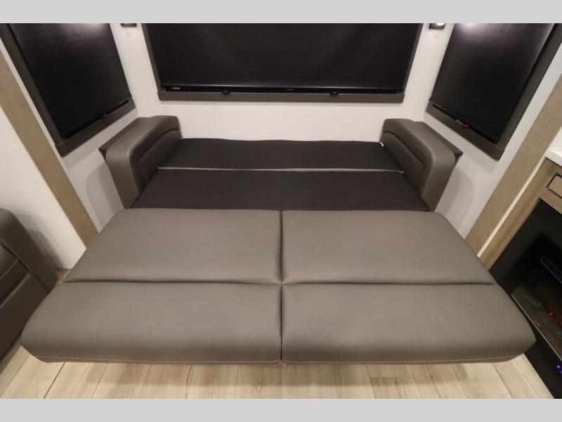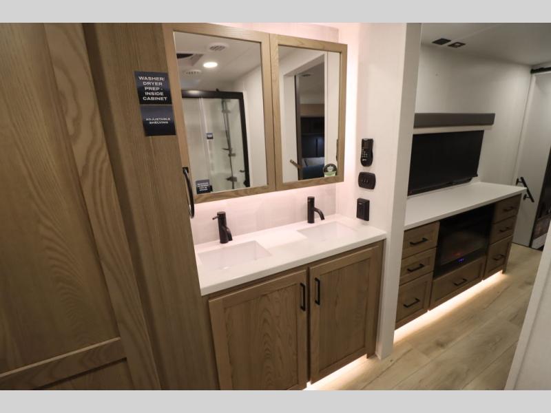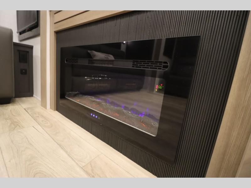You can't go wrong when choosing this spacious fifth wheel! The master bedroom features a king bed slide out, wardrobe, and a dresser with a fireplace, and the full front bath is sure to bring comfort. There are dual bath sinks here, tons of storage, and even washer and dryer prep if you choose to add these appliances. The mid-coach half bath will come in handy if you have guests staying over on the rear hide-a-bed sofa. You'll also find a theater seat and a rotating table and chairs where you can dine and relax each day, plus there is a large kitchen island so the chef of your group has plenty of prep space. A Smart TV and fireplace will make your space feel more like home, and there is a pull-out desk here if you need to get some work done!