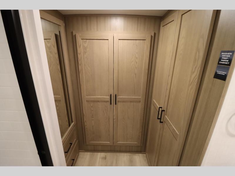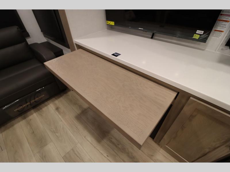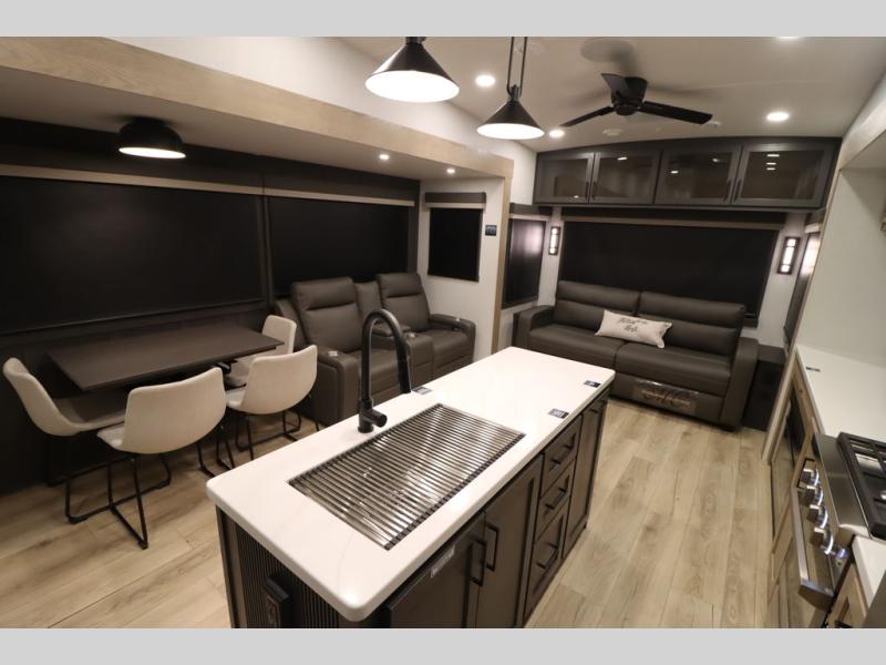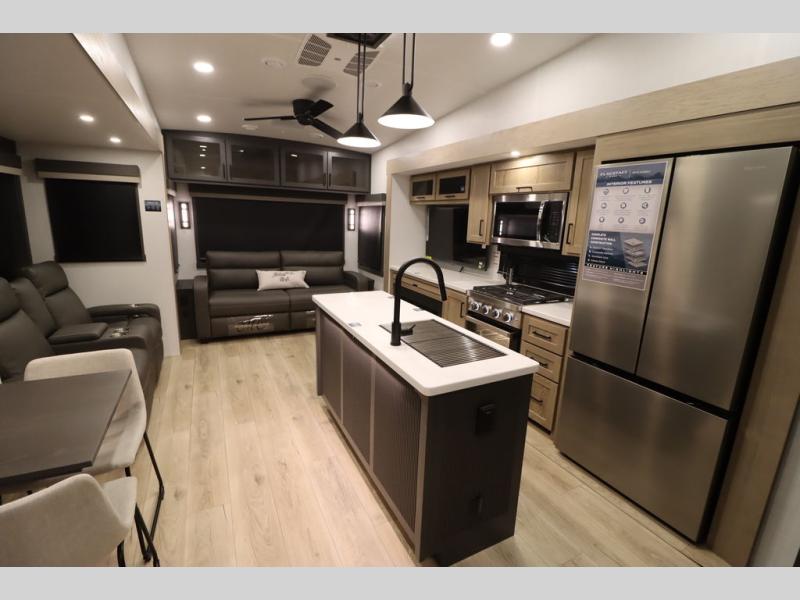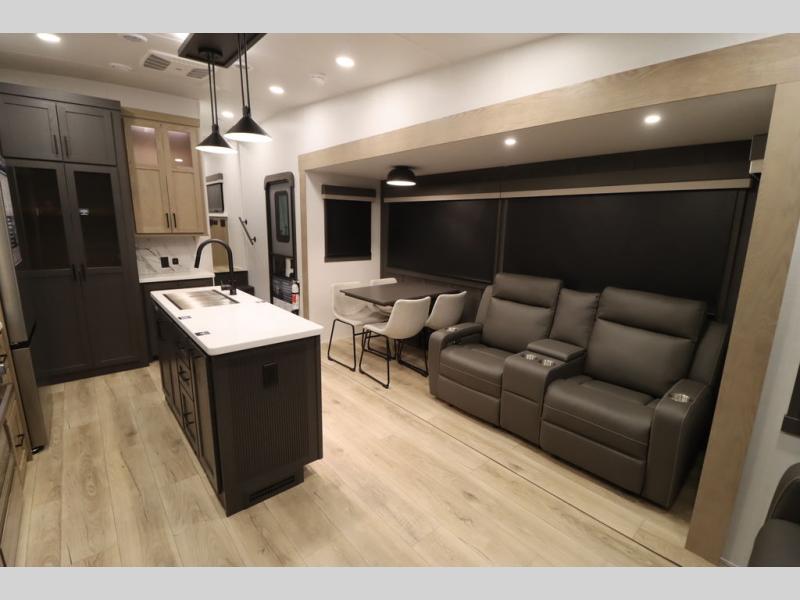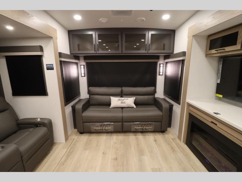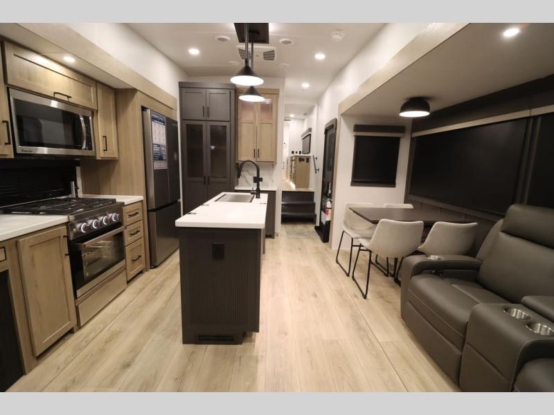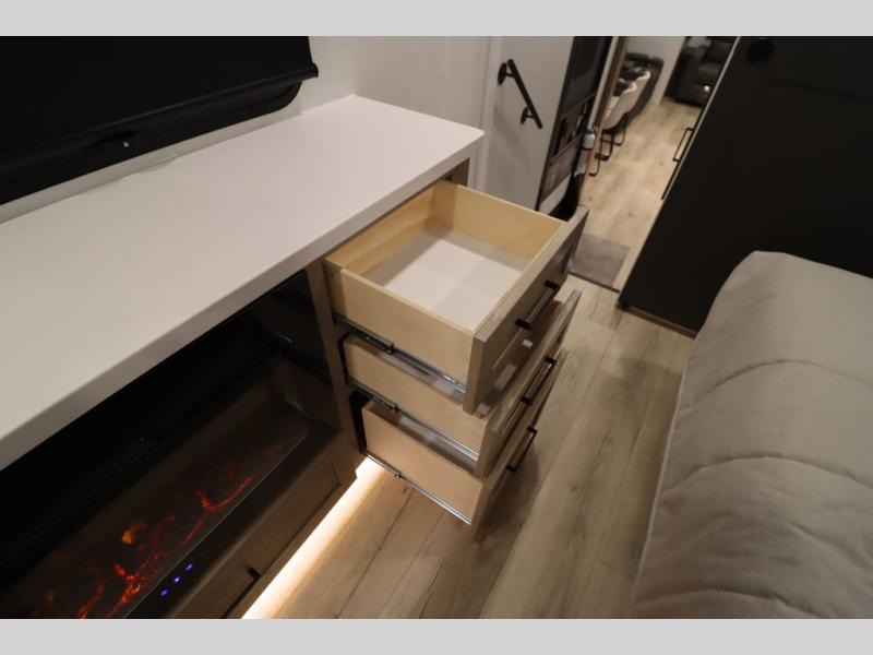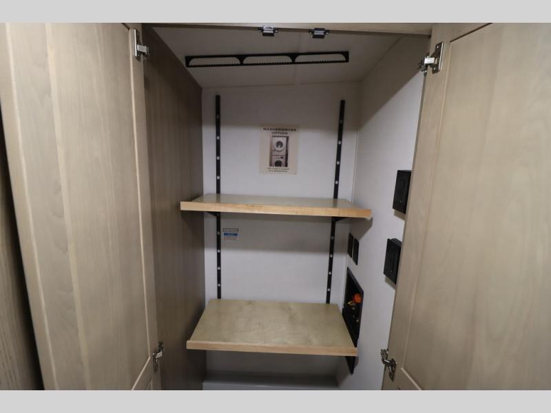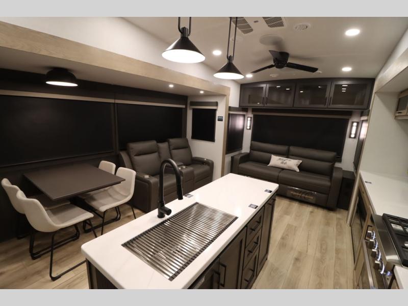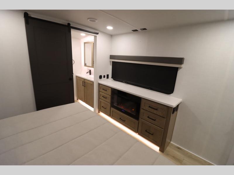 You can't go wrong when choosing this spacious fifth wheel! The master bedroom features a king bed slide out, wardrobe, and a dresser with a fireplace, and the full front bath is sure to bring comfort. There are dual bath sinks here, tons of storage, and even washer and dryer prep if you choose to add these appliances. The mid-coach half bath will come in handy if you have guests staying over on the rear hide-a-bed sofa. You'll also find a theater seat and a rotating table and chairs where you can dine and relax each day, plus there is a large kitchen island so the chef of your group has plenty of prep space. A Smart TV and fireplace will make your space feel more like home, and there is a pull-out desk here if you need to get some work done!