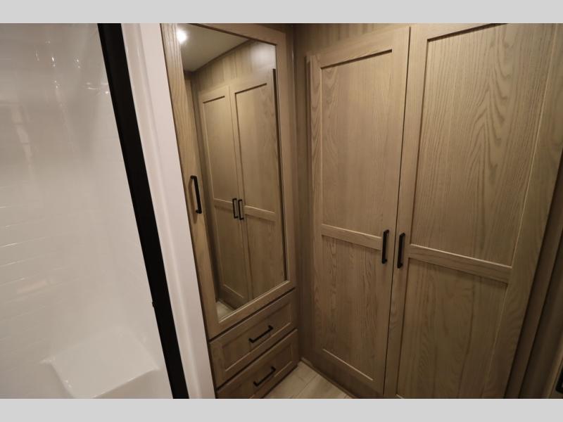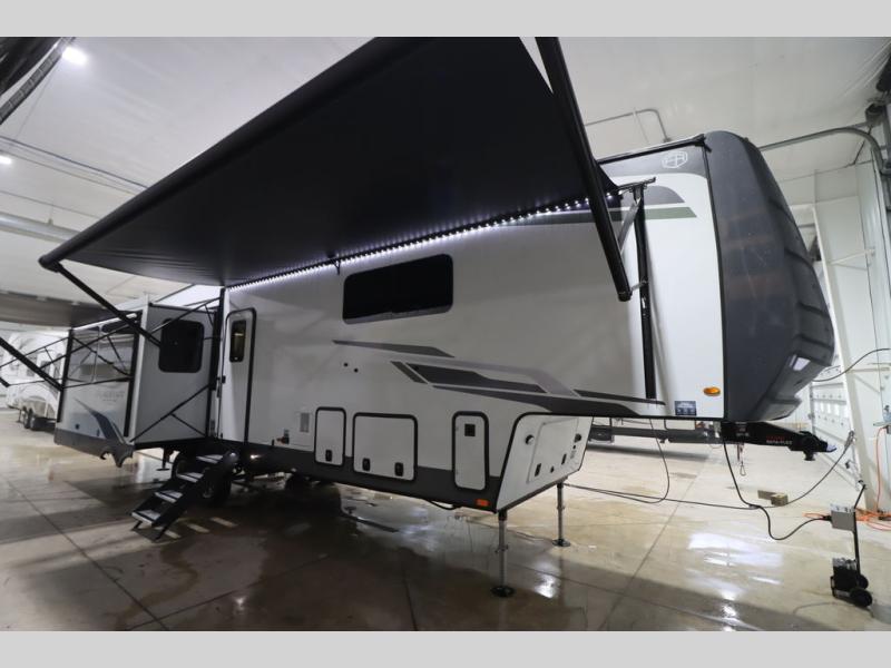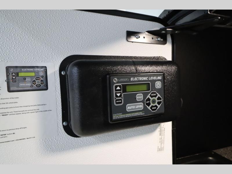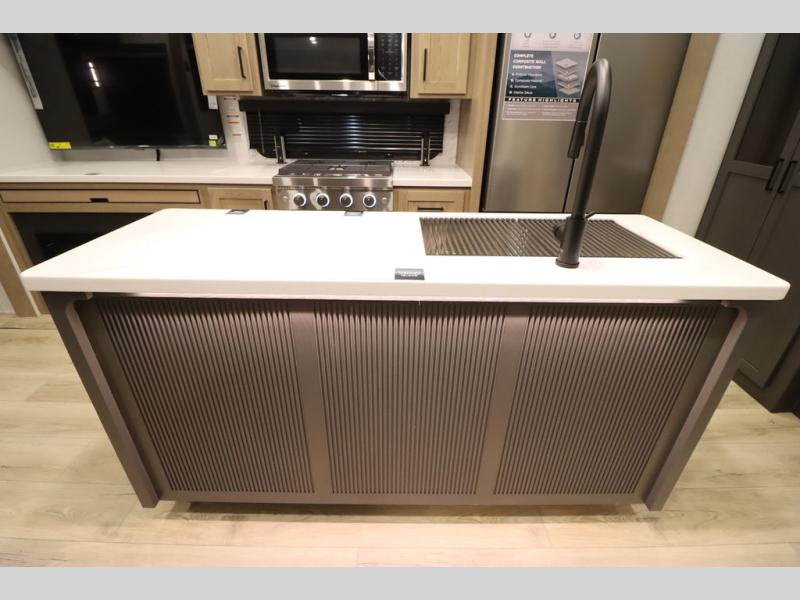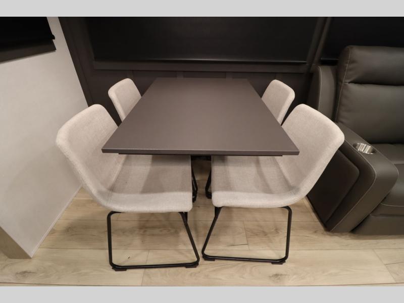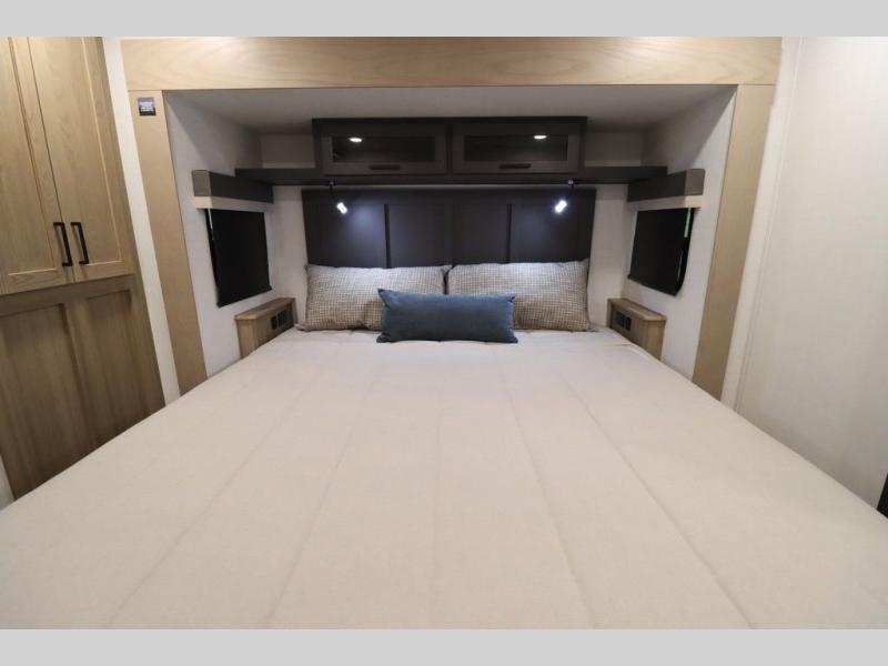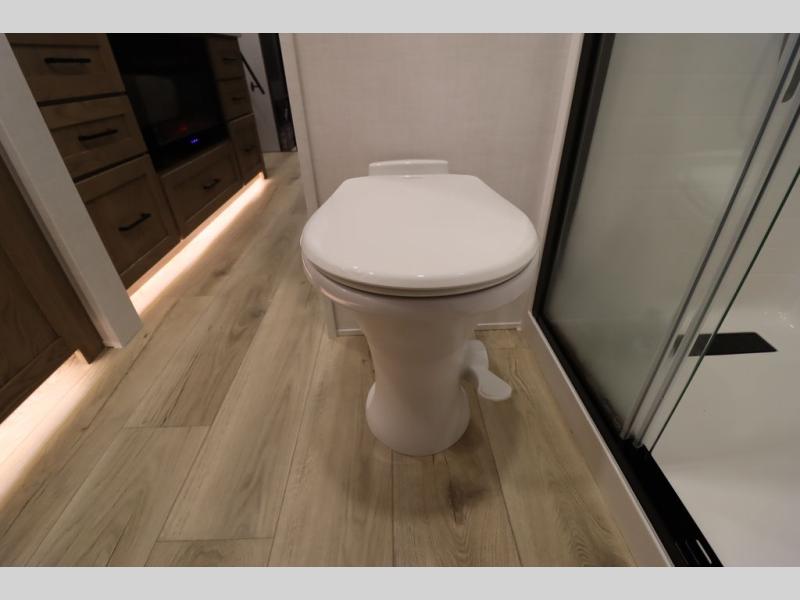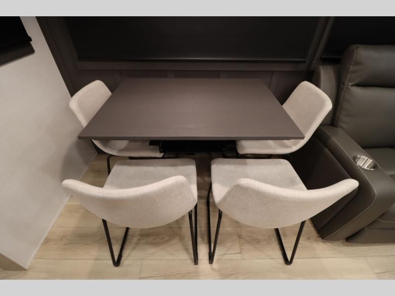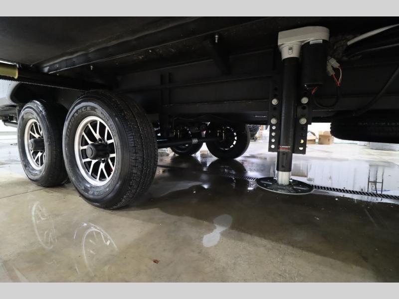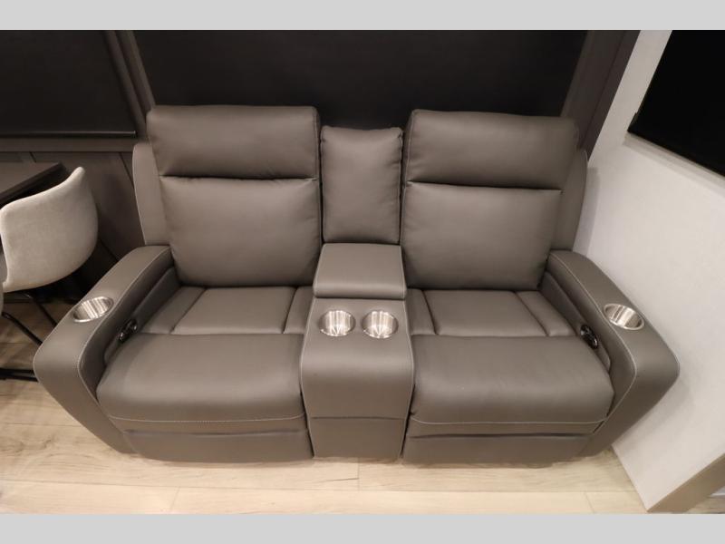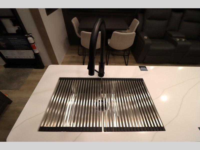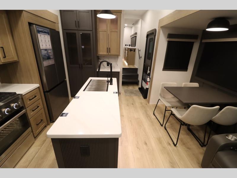 You can't go wrong when choosing this spacious fifth wheel! The master bedroom features a king bed slide out, wardrobe, and a dresser with a fireplace, and the full front bath is sure to bring comfort. There are dual bath sinks here, tons of storage, and even washer and dryer prep if you choose to add these appliances. The mid-coach half bath will come in handy if you have guests staying over on the rear hide-a-bed sofa. You'll also find a theater seat and a rotating table and chairs where you can dine and relax each day, plus there is a large kitchen island so the chef of your group has plenty of prep space. A Smart TV and fireplace will make your space feel more like home, and there is a pull-out desk here if you need to get some work done!