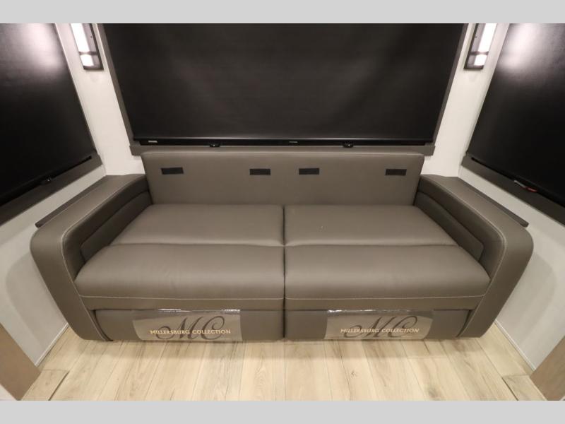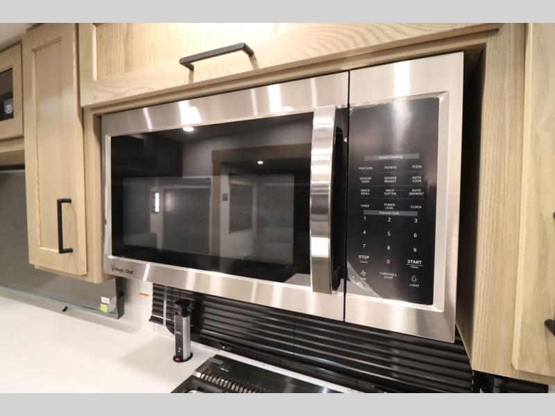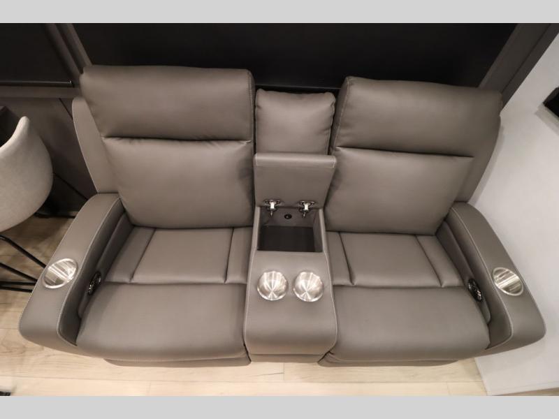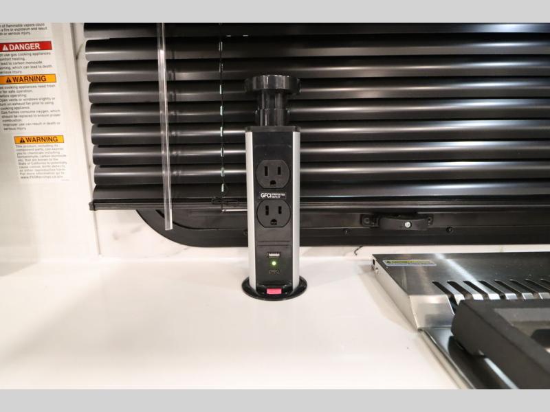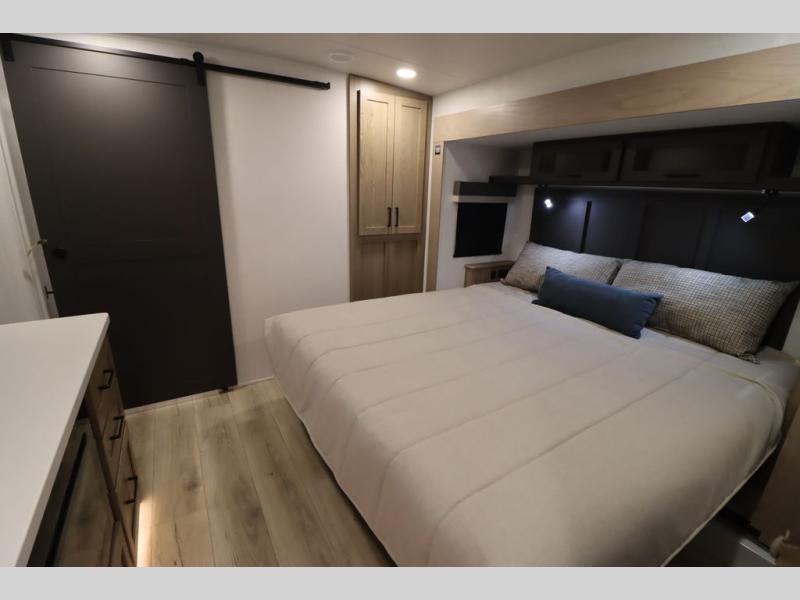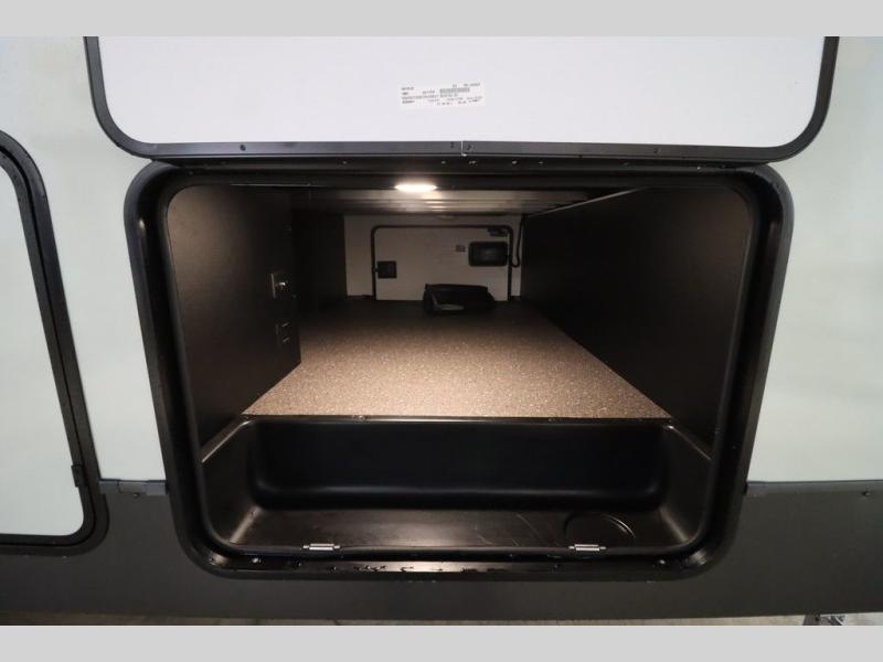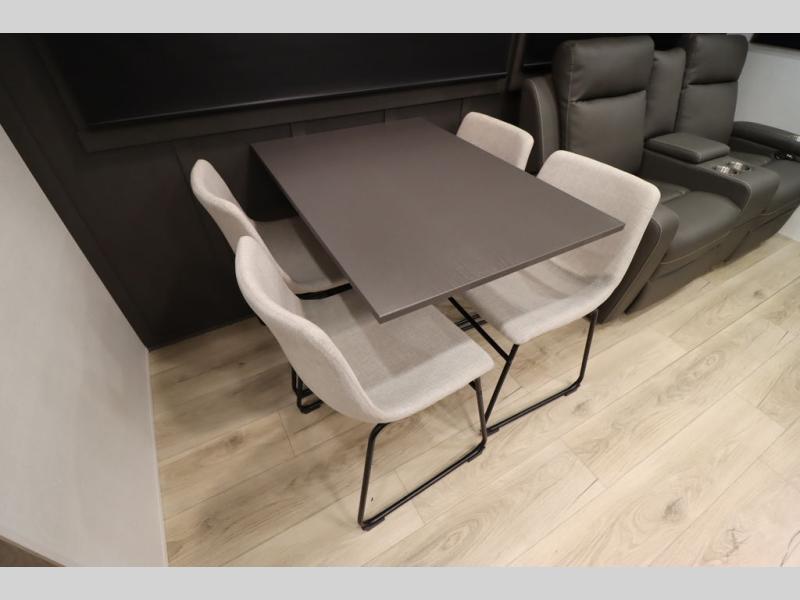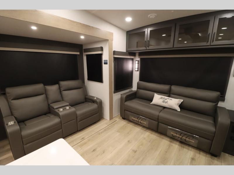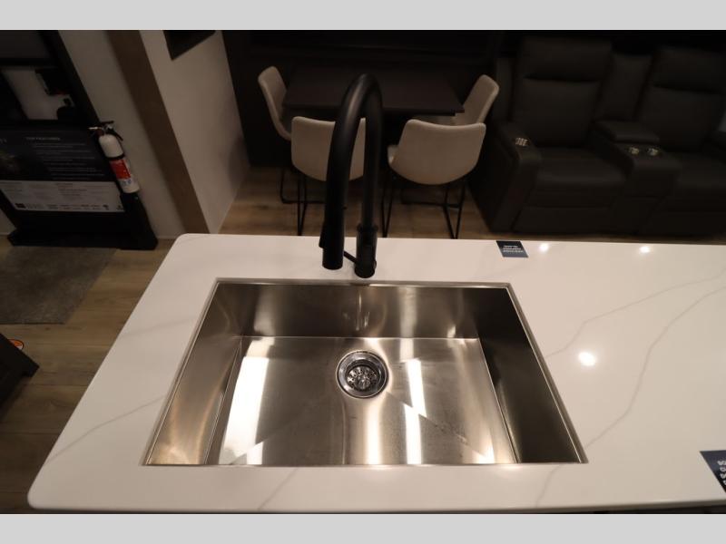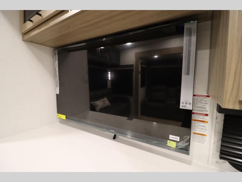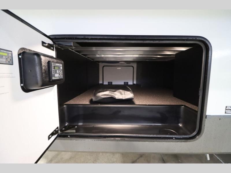 You can't go wrong when choosing this spacious fifth wheel! The master bedroom features a king bed slide out, wardrobe, and a dresser with a fireplace, and the full front bath is sure to bring comfort. There are dual bath sinks here, tons of storage, and even washer and dryer prep if you choose to add these appliances. The mid-coach half bath will come in handy if you have guests staying over on the rear hide-a-bed sofa. You'll also find a theater seat and a rotating table and chairs where you can dine and relax each day, plus there is a large kitchen island so the chef of your group has plenty of prep space. A Smart TV and fireplace will make your space feel more like home, and there is a pull-out desk here if you need to get some work done!