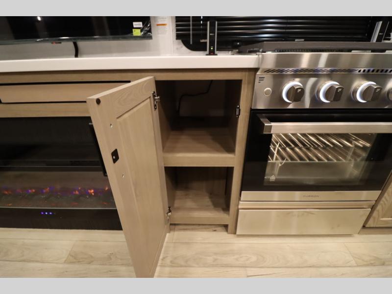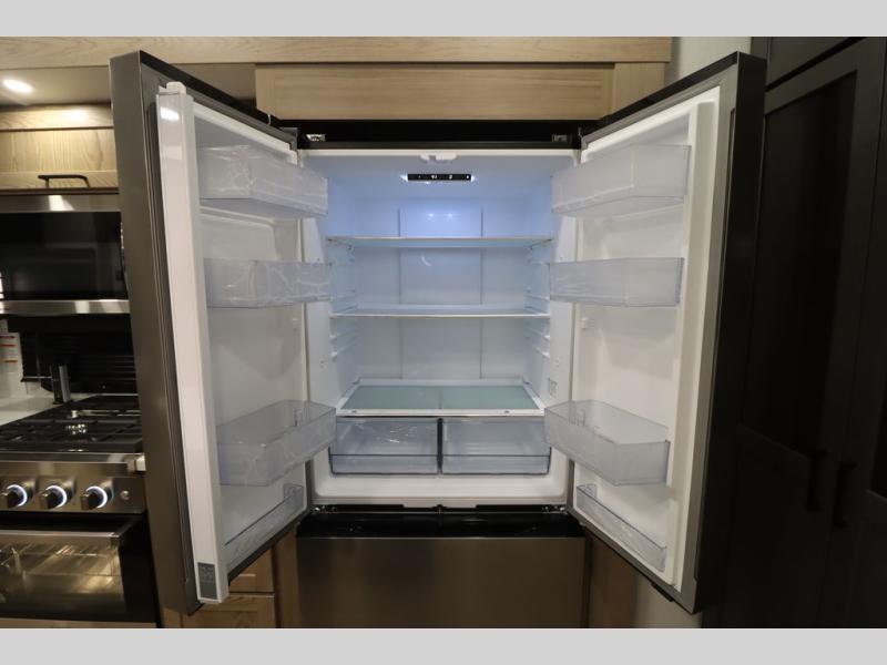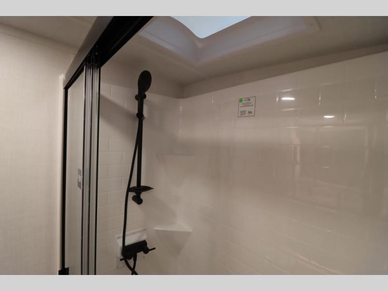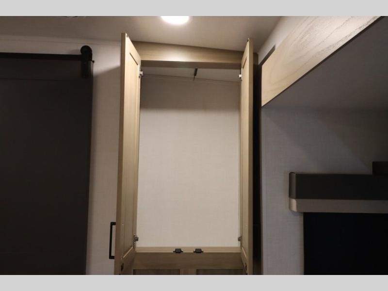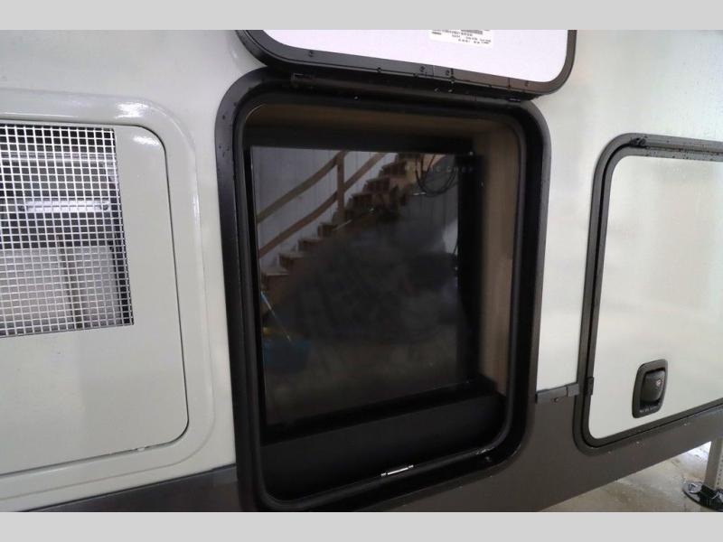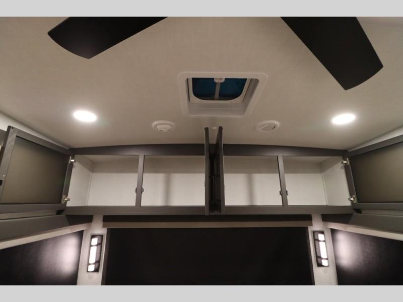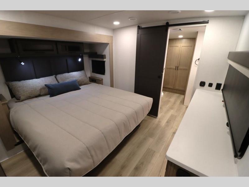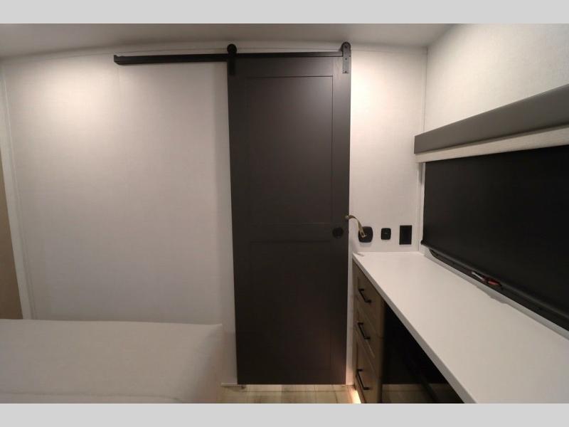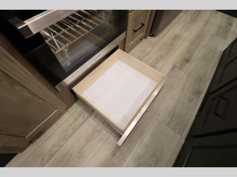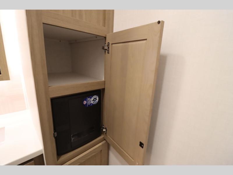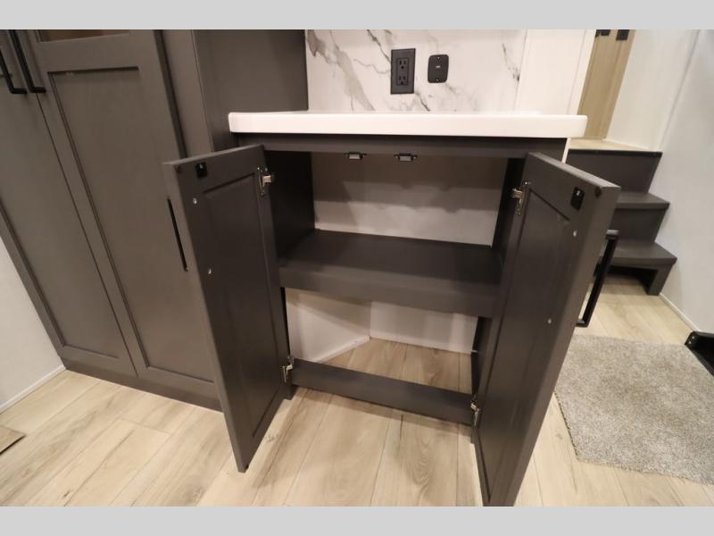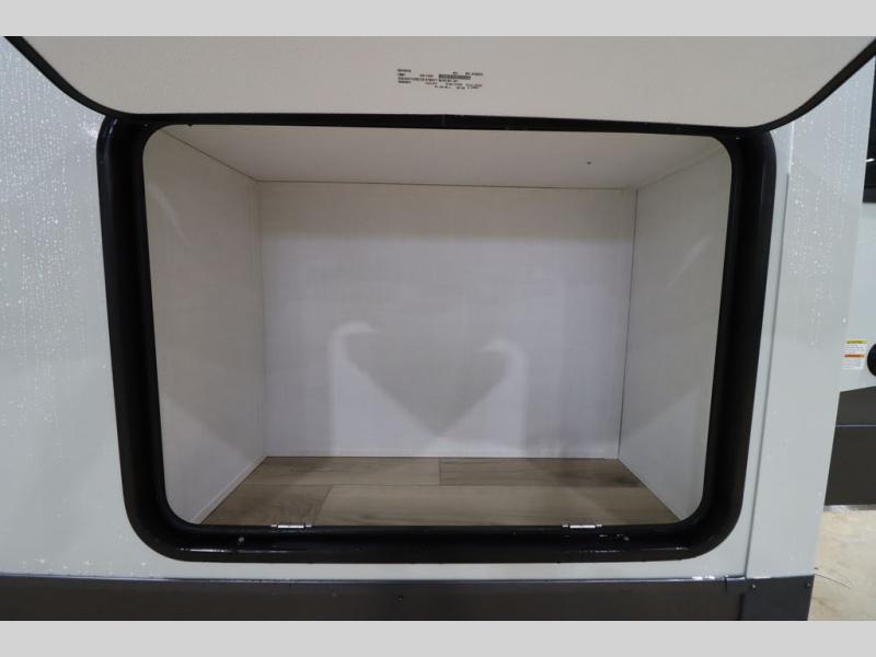 You can't go wrong when choosing this spacious fifth wheel! The master bedroom features a king bed slide out, wardrobe, and a dresser with a fireplace, and the full front bath is sure to bring comfort. There are dual bath sinks here, tons of storage, and even washer and dryer prep if you choose to add these appliances. The mid-coach half bath will come in handy if you have guests staying over on the rear hide-a-bed sofa. You'll also find a theater seat and a rotating table and chairs where you can dine and relax each day, plus there is a large kitchen island so the chef of your group has plenty of prep space. A Smart TV and fireplace will make your space feel more like home, and there is a pull-out desk here if you need to get some work done!