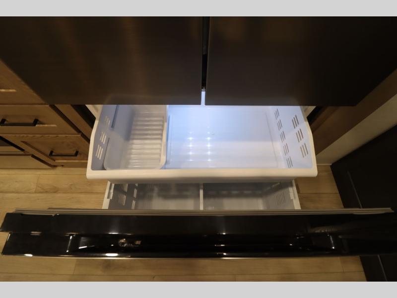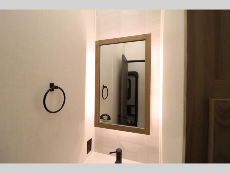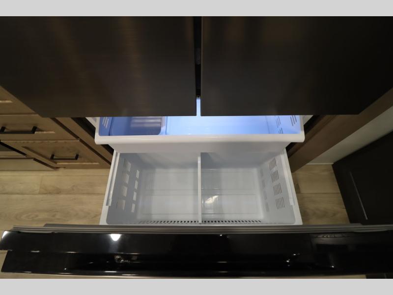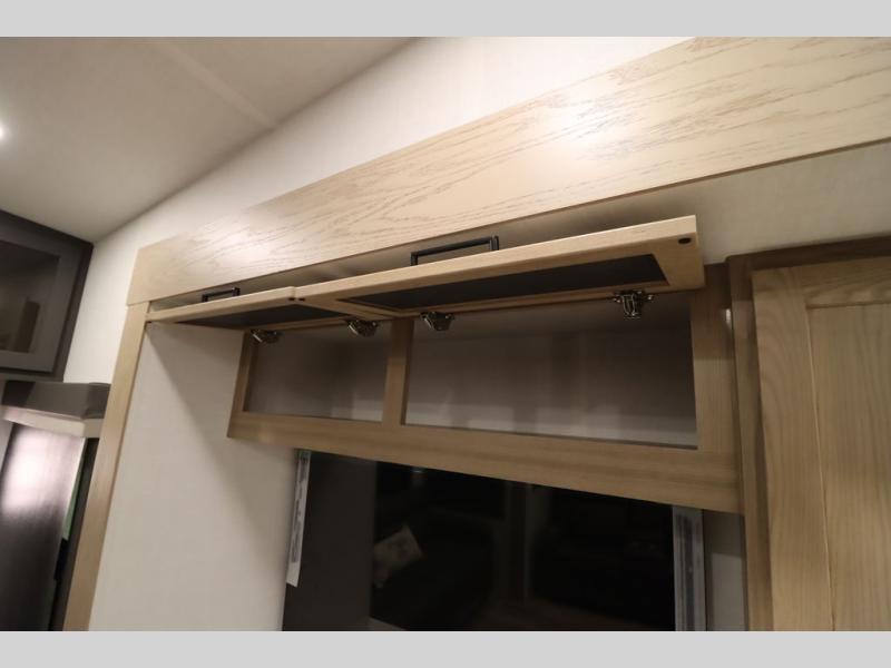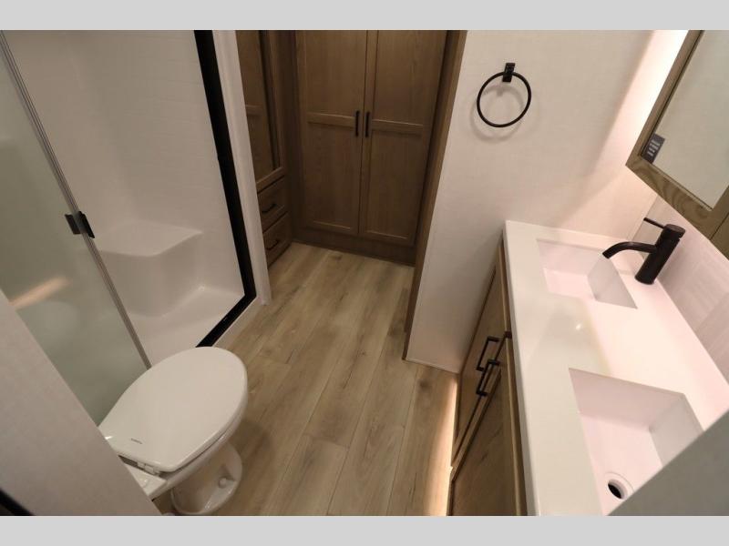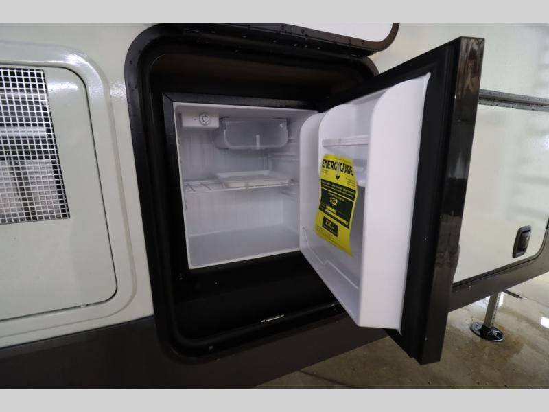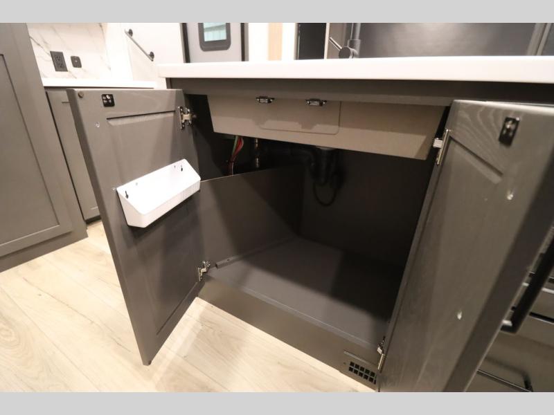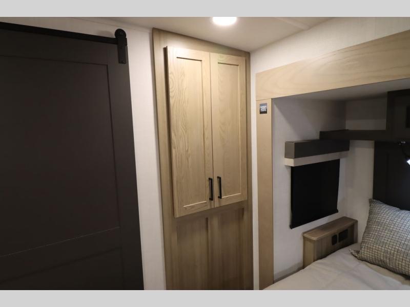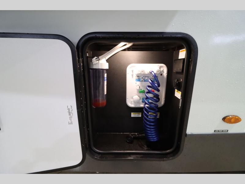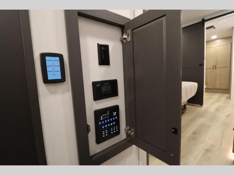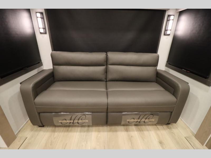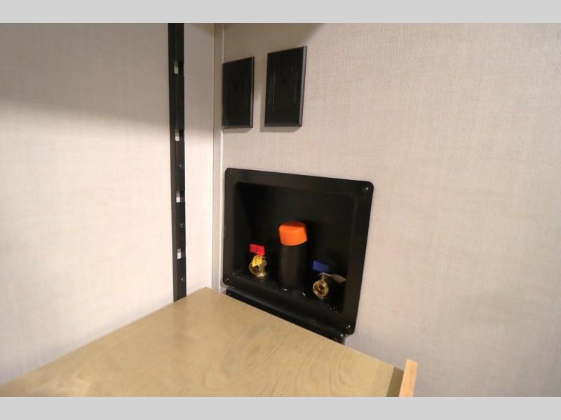 You can't go wrong when choosing this spacious fifth wheel! The master bedroom features a king bed slide out, wardrobe, and a dresser with a fireplace, and the full front bath is sure to bring comfort. There are dual bath sinks here, tons of storage, and even washer and dryer prep if you choose to add these appliances. The mid-coach half bath will come in handy if you have guests staying over on the rear hide-a-bed sofa. You'll also find a theater seat and a rotating table and chairs where you can dine and relax each day, plus there is a large kitchen island so the chef of your group has plenty of prep space. A Smart TV and fireplace will make your space feel more like home, and there is a pull-out desk here if you need to get some work done!