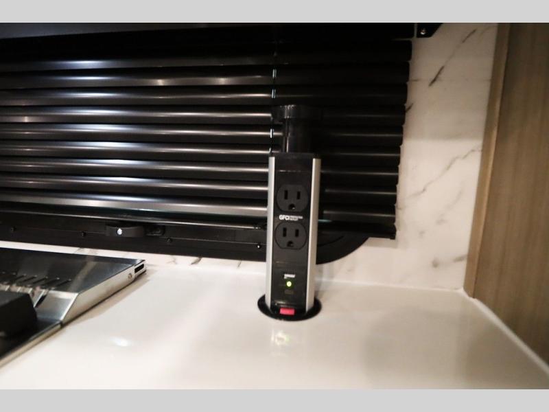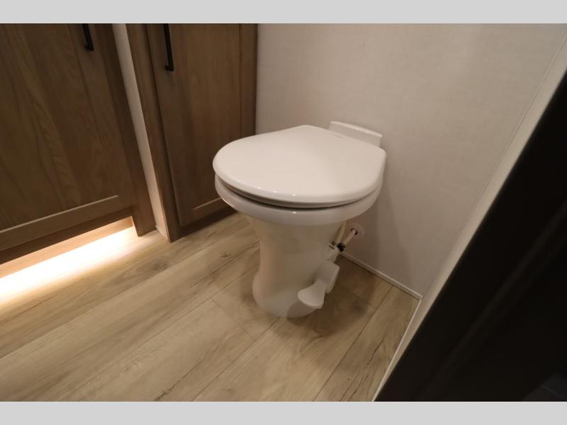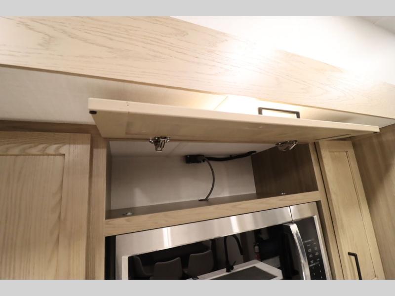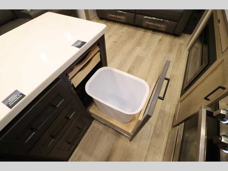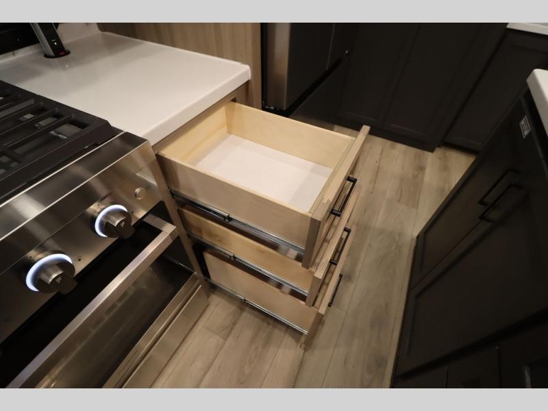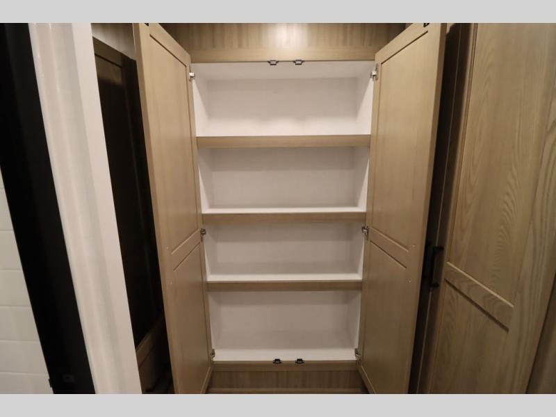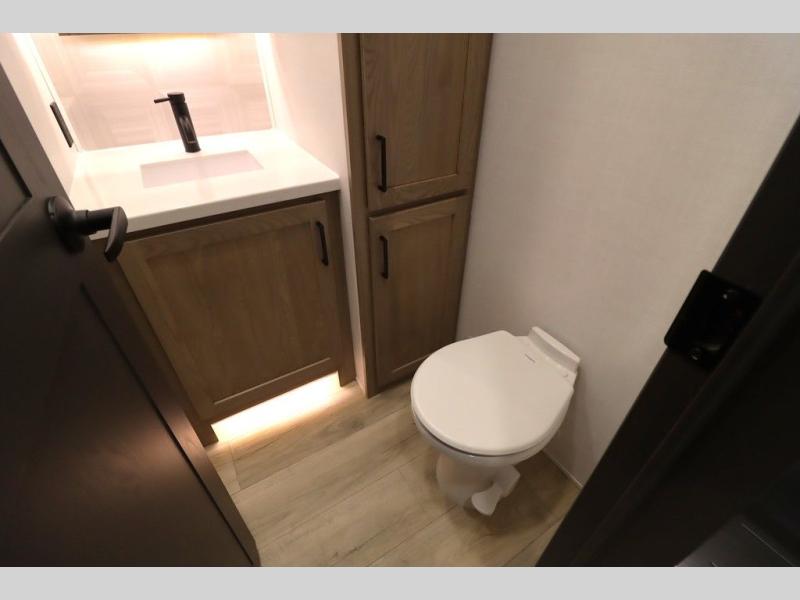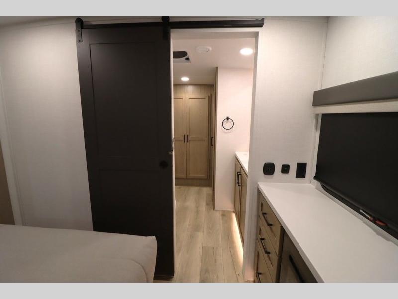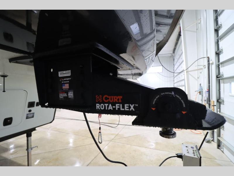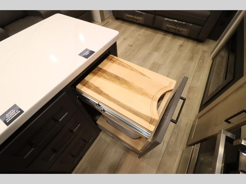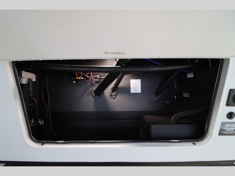 You can't go wrong when choosing this spacious fifth wheel! The master bedroom features a king bed slide out, wardrobe, and a dresser with a fireplace, and the full front bath is sure to bring comfort. There are dual bath sinks here, tons of storage, and even washer and dryer prep if you choose to add these appliances. The mid-coach half bath will come in handy if you have guests staying over on the rear hide-a-bed sofa. You'll also find a theater seat and a rotating table and chairs where you can dine and relax each day, plus there is a large kitchen island so the chef of your group has plenty of prep space. A Smart TV and fireplace will make your space feel more like home, and there is a pull-out desk here if you need to get some work done!