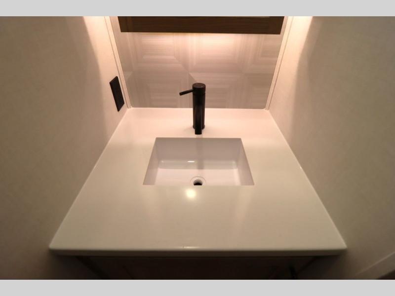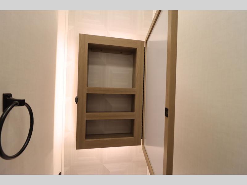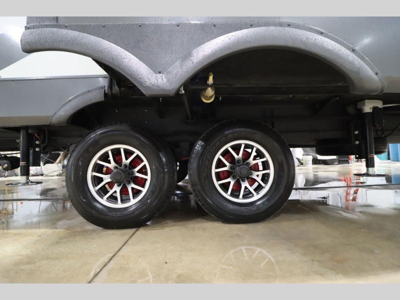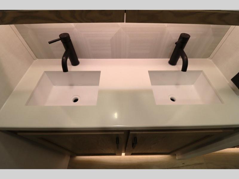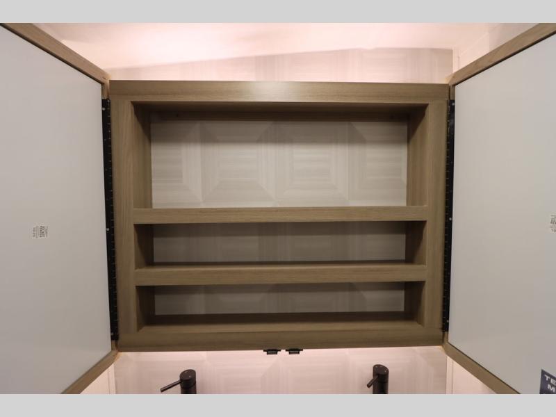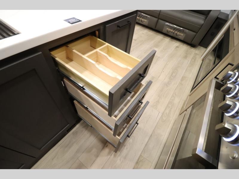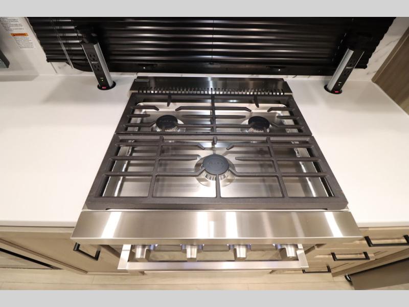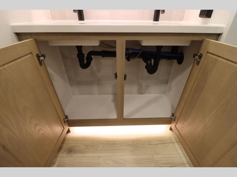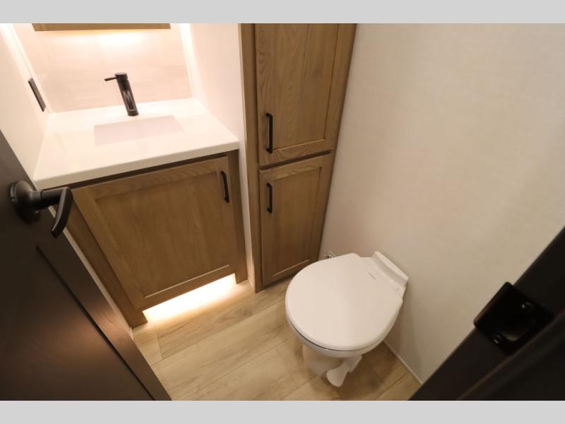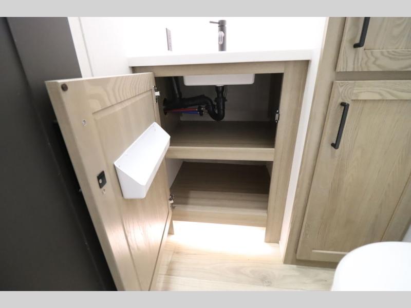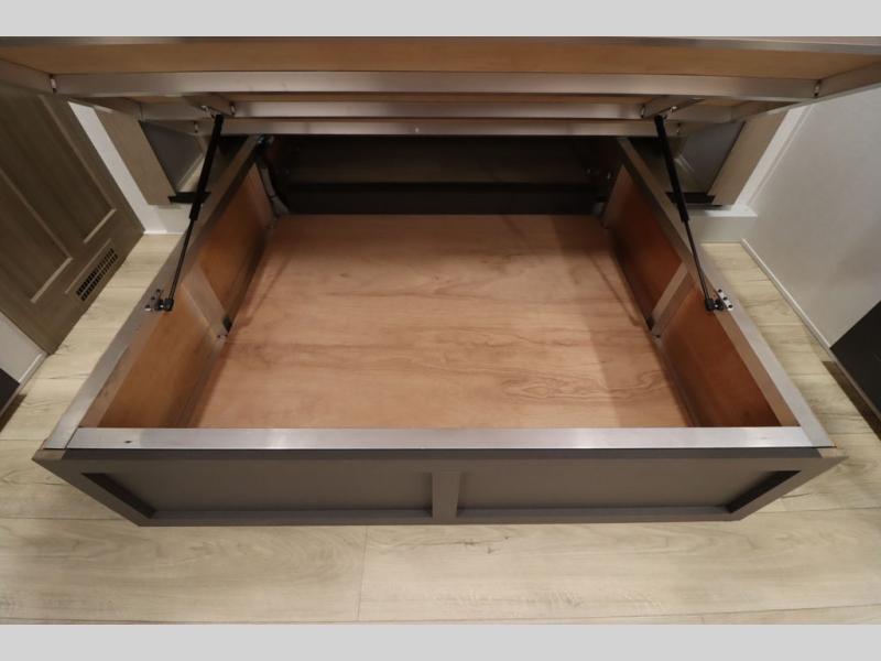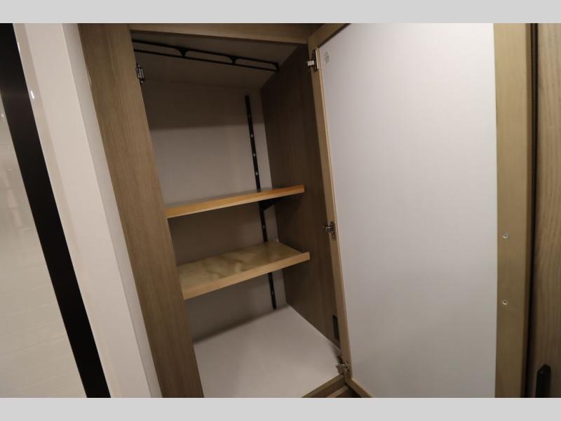 You can't go wrong when choosing this spacious fifth wheel! The master bedroom features a king bed slide out, wardrobe, and a dresser with a fireplace, and the full front bath is sure to bring comfort. There are dual bath sinks here, tons of storage, and even washer and dryer prep if you choose to add these appliances. The mid-coach half bath will come in handy if you have guests staying over on the rear hide-a-bed sofa. You'll also find a theater seat and a rotating table and chairs where you can dine and relax each day, plus there is a large kitchen island so the chef of your group has plenty of prep space. A Smart TV and fireplace will make your space feel more like home, and there is a pull-out desk here if you need to get some work done!
