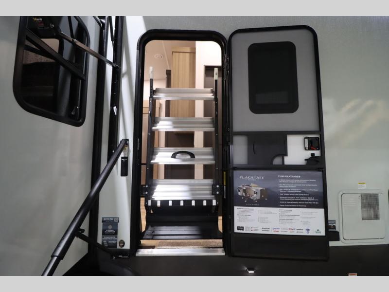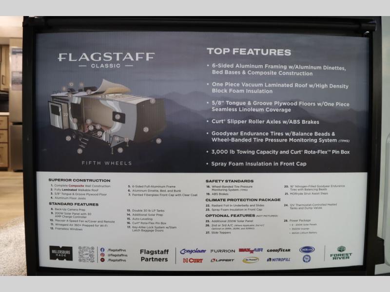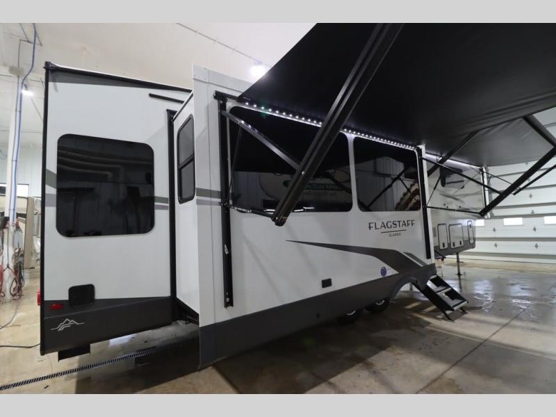Each one of these Forest River Flagstaff Classic fifth wheels or travel trailers will be your home on wheels! Their quality craftsmanship and attention to detail shines through the enclosed underbelly, the fully laminated walkable roof, and six-sided full-aluminum frame. Towing your unit will be easy with the Goodyear Endurance tires plus RoadTech tire pressure monitoring. Additional exterior features include a 200W solar panel, slam baggage doors, a Key-Alike lock system, and double 30 lb. LP tanks to name a few conveniences. Head inside to find a residential style gas range, solid surface kitchen and bath countertops, soft close hidden cabinet hinges, and more comforts!