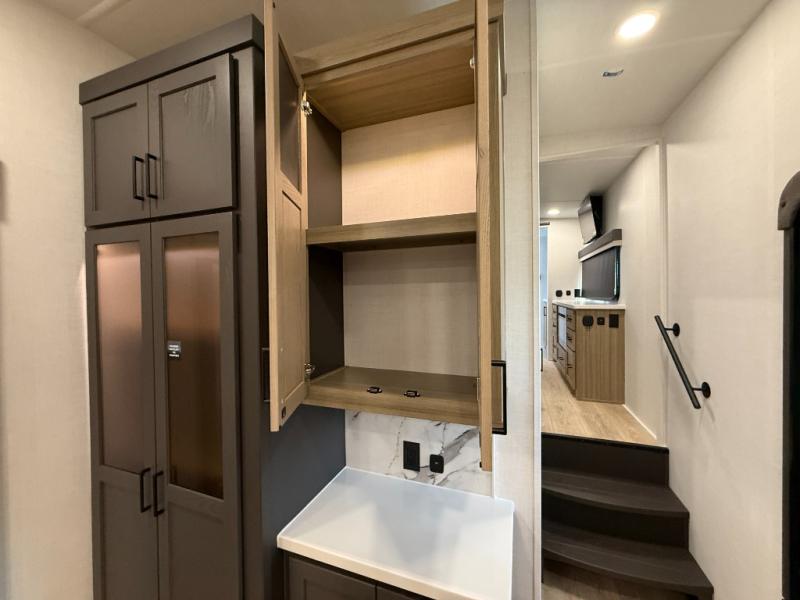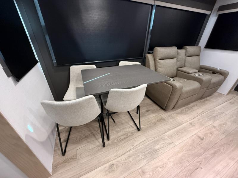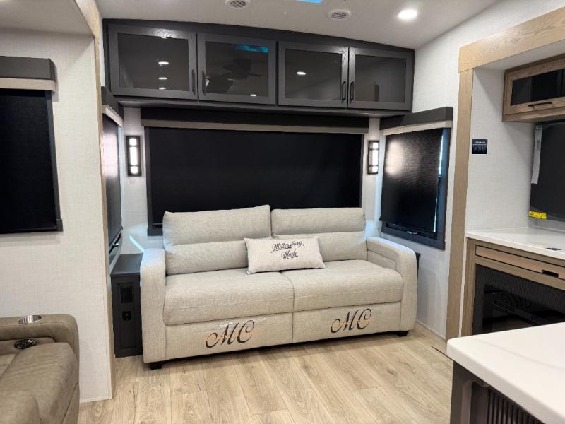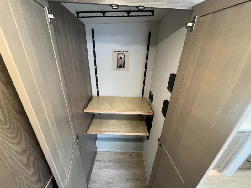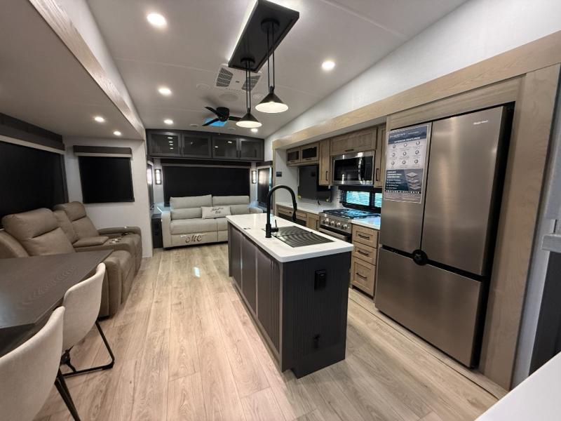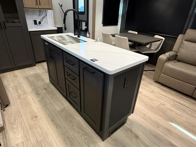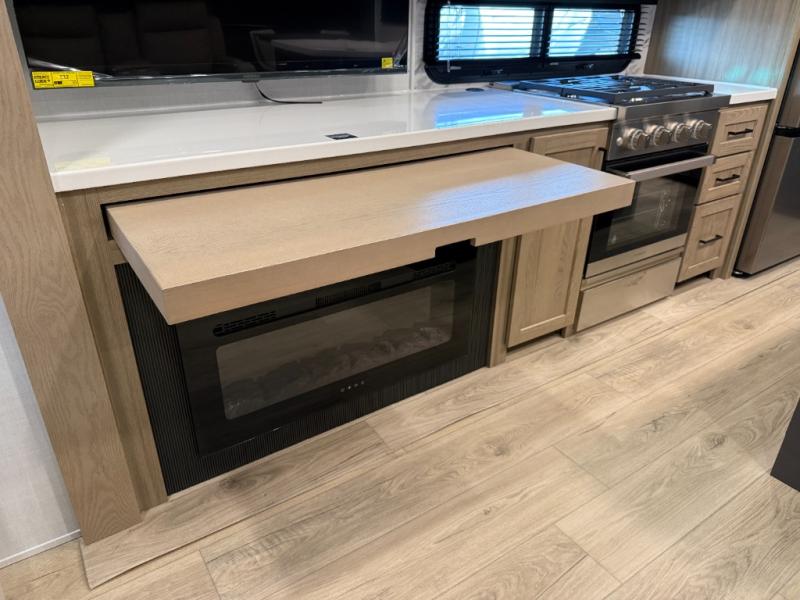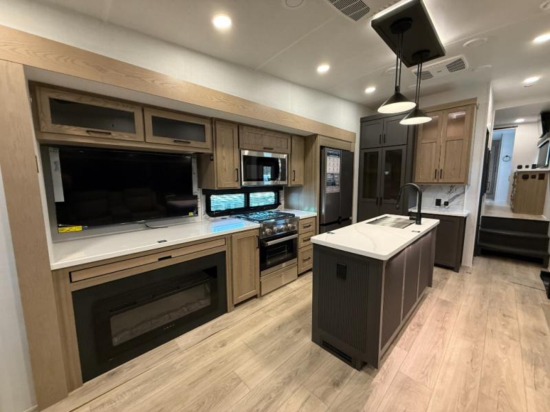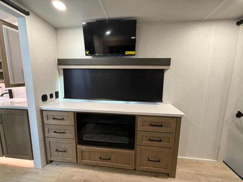 You can't go wrong when choosing this spacious fifth wheel! The master bedroom features a king bed slide out, wardrobe, and a dresser with a fireplace, and the full front bath is sure to bring comfort. There are dual bath sinks here, tons of storage, and even washer and dryer prep if you choose to add these appliances. The mid-coach half bath will come in handy if you have guests staying over on the rear hide-a-bed sofa. You'll also find a theater seat and a rotating table and chairs where you can dine and relax each day, plus there is a large kitchen island so the chef of your group has plenty of prep space. A Smart TV and fireplace will make your space feel more like home, and there is a pull-out desk here if you need to get some work done!