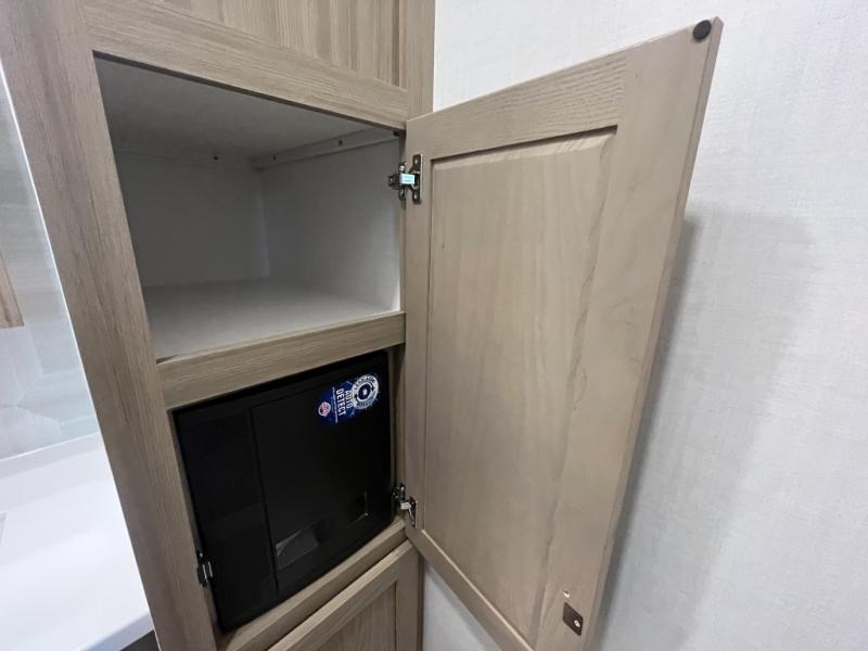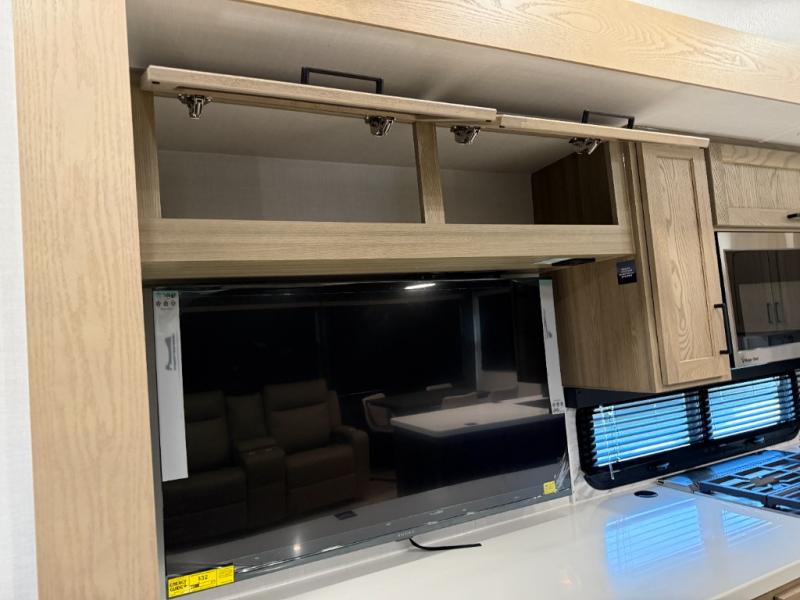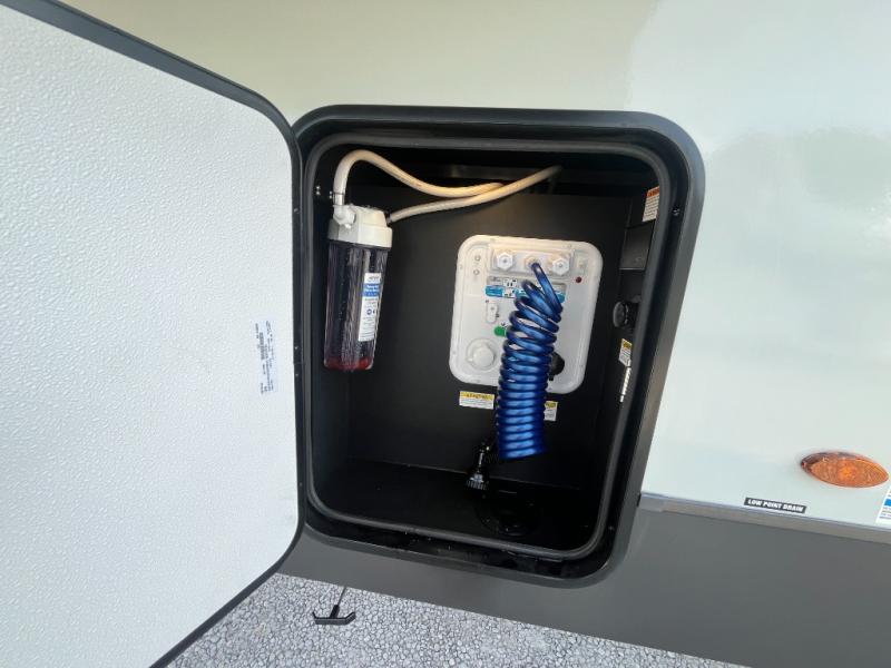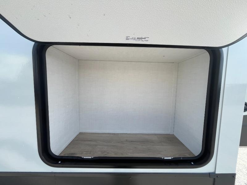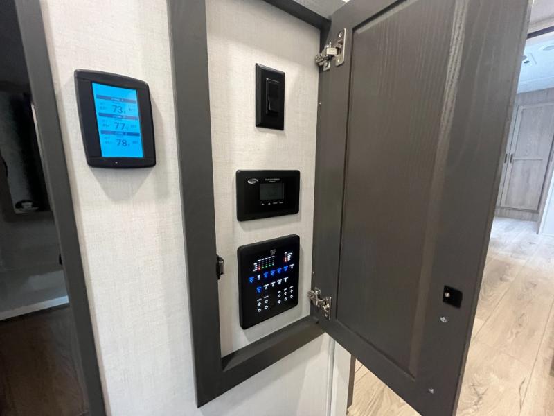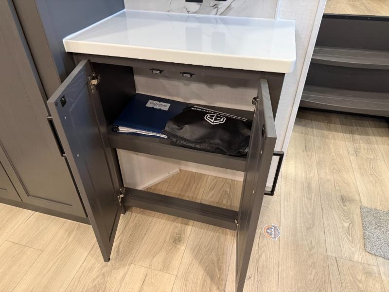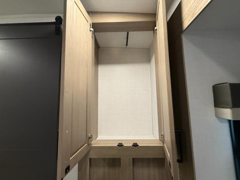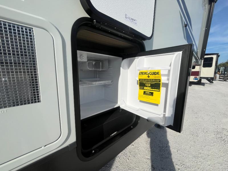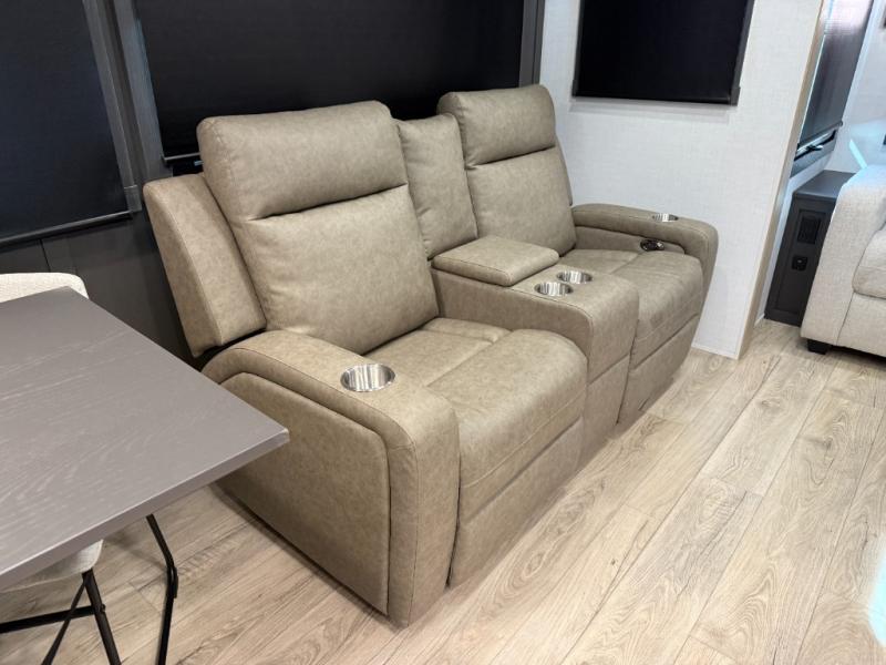 You can't go wrong when choosing this spacious fifth wheel! The master bedroom features a king bed slide out, wardrobe, and a dresser with a fireplace, and the full front bath is sure to bring comfort. There are dual bath sinks here, tons of storage, and even washer and dryer prep if you choose to add these appliances. The mid-coach half bath will come in handy if you have guests staying over on the rear hide-a-bed sofa. You'll also find a theater seat and a rotating table and chairs where you can dine and relax each day, plus there is a large kitchen island so the chef of your group has plenty of prep space. A Smart TV and fireplace will make your space feel more like home, and there is a pull-out desk here if you need to get some work done!