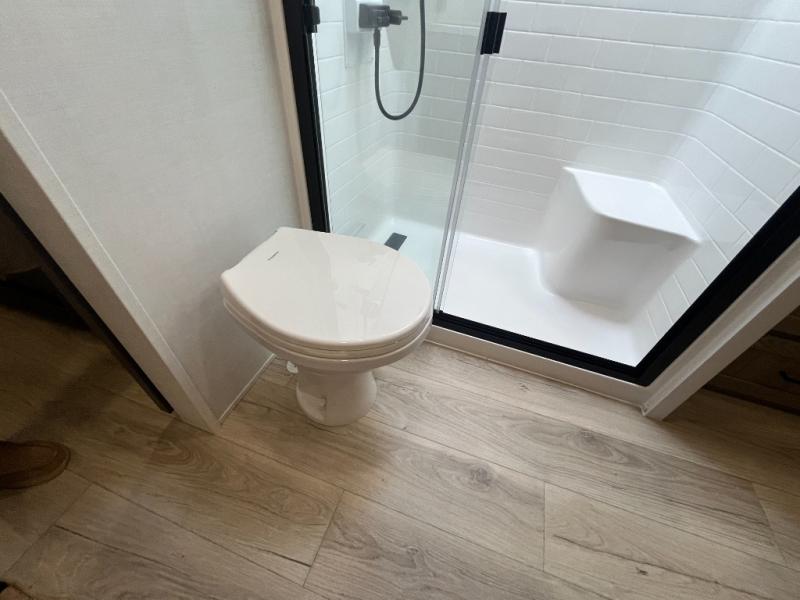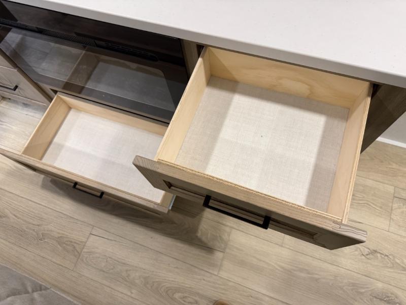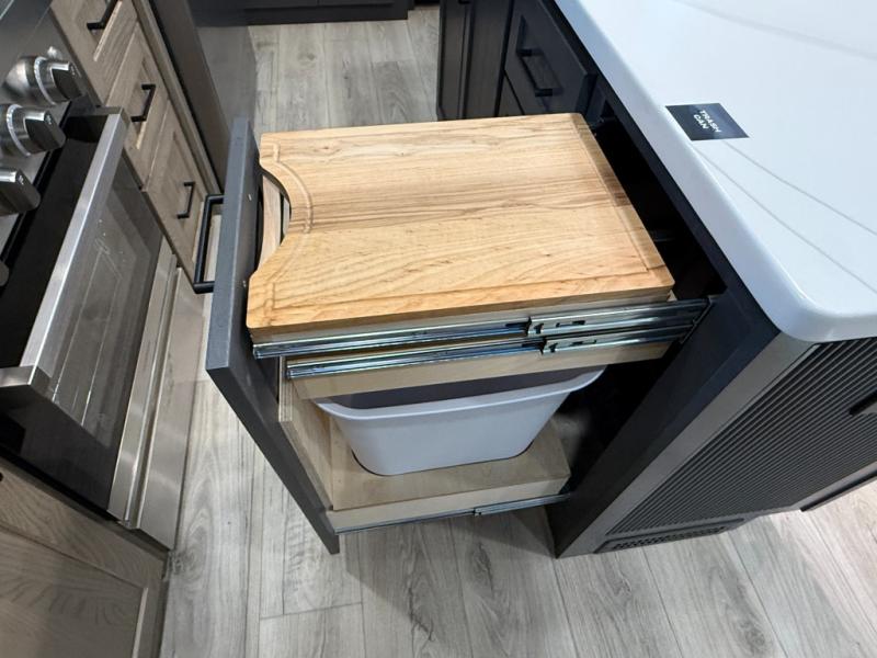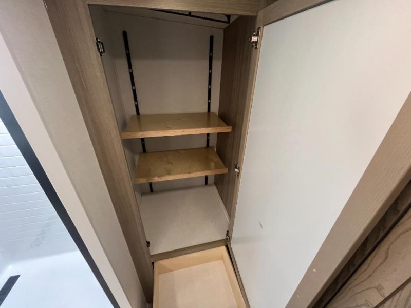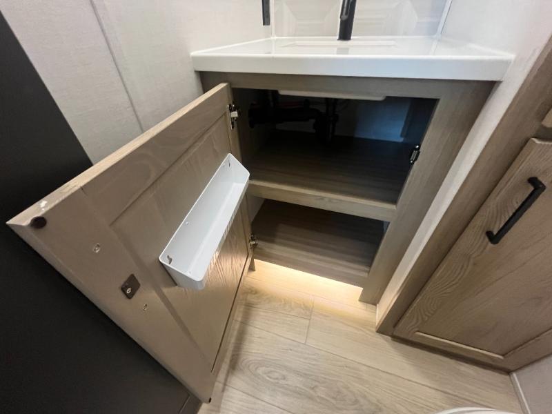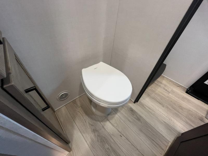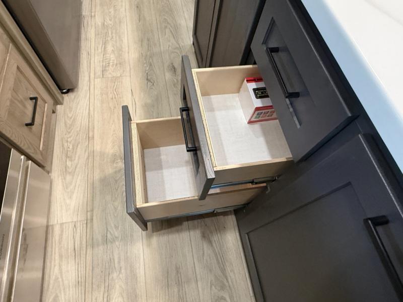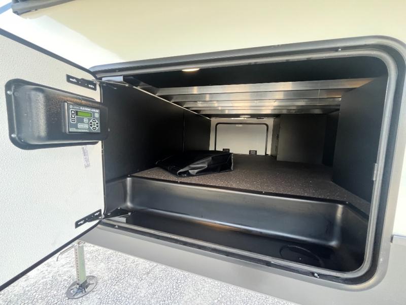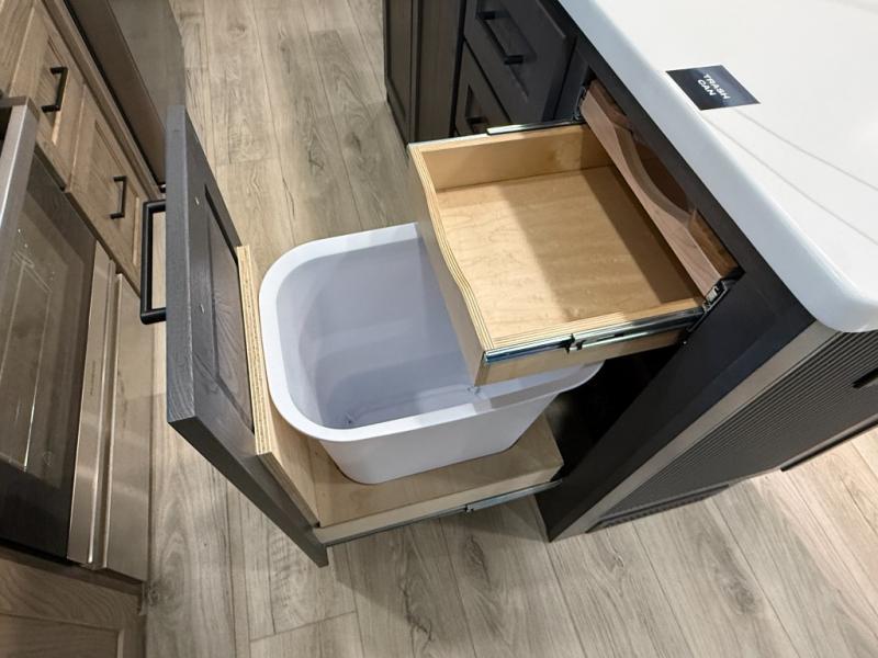 You can't go wrong when choosing this spacious fifth wheel! The master bedroom features a king bed slide out, wardrobe, and a dresser with a fireplace, and the full front bath is sure to bring comfort. There are dual bath sinks here, tons of storage, and even washer and dryer prep if you choose to add these appliances. The mid-coach half bath will come in handy if you have guests staying over on the rear hide-a-bed sofa. You'll also find a theater seat and a rotating table and chairs where you can dine and relax each day, plus there is a large kitchen island so the chef of your group has plenty of prep space. A Smart TV and fireplace will make your space feel more like home, and there is a pull-out desk here if you need to get some work done!