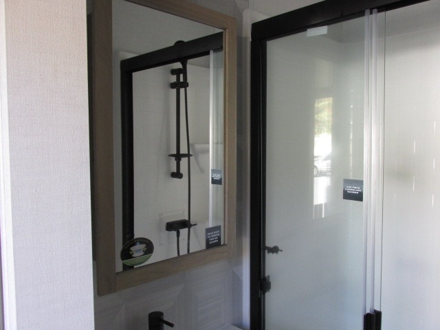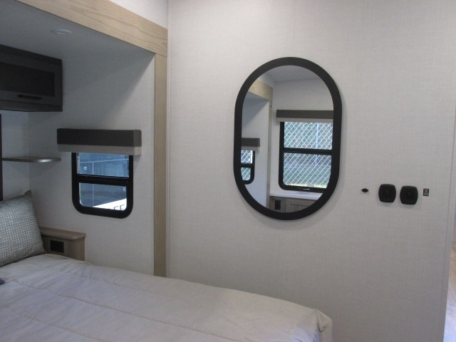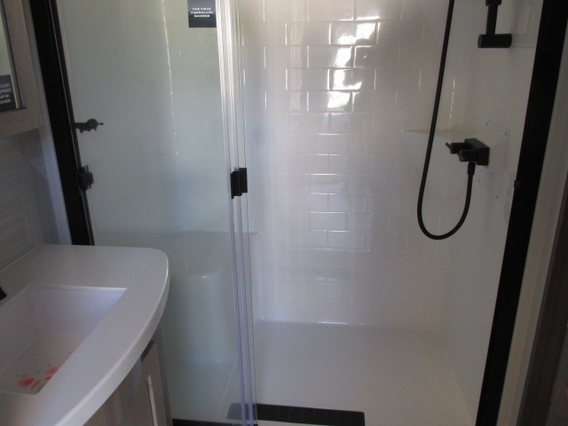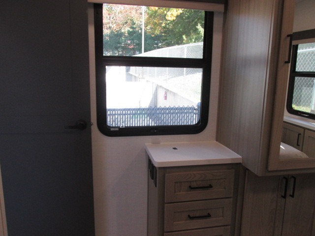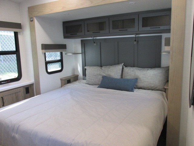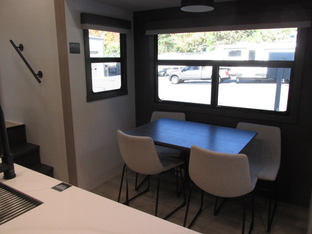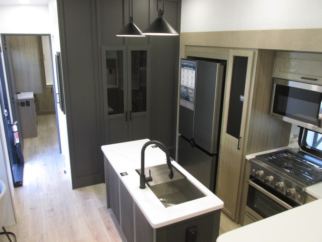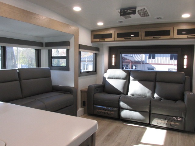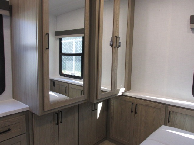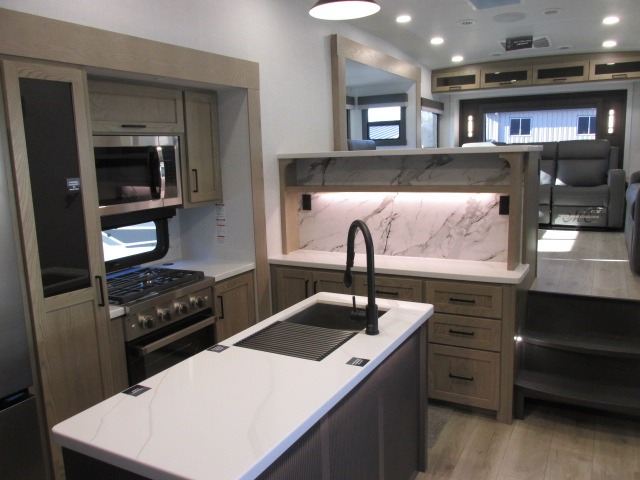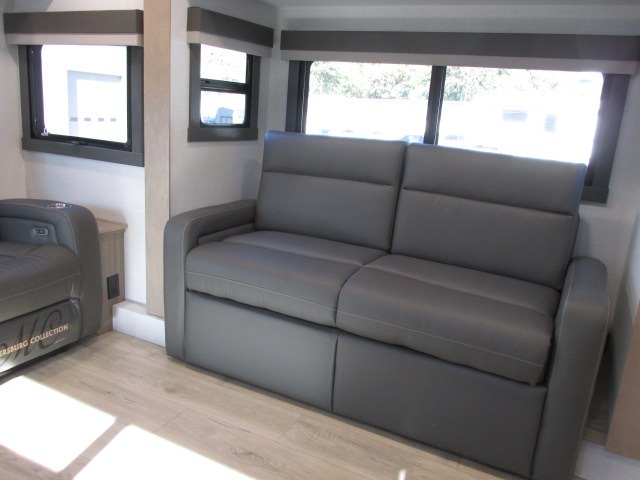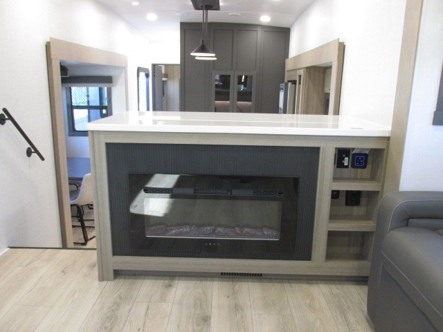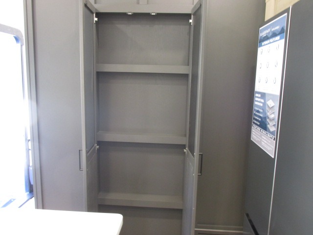 With five slide outs, a rear bedroom, and a front living area that can double as a guest bedroom, this fifth wheel is perfect for six campers! There are dual hide-a-bed sofas in the living room, along with a front theater seat across from a fireplace and televator TV. The middle kitchen includes two pantries and a 12V refrigerator for food storage, plus a rotating table and chairs to dine at. A full bath will let everyone freshen up after a day outdoors, and the rear bedroom will have you feeling right at home with its king bed slide out. There is also a wardrobe here, along with a TV option and washer/dryer prep!