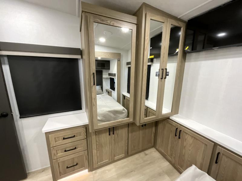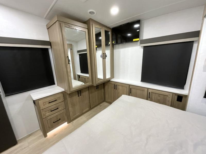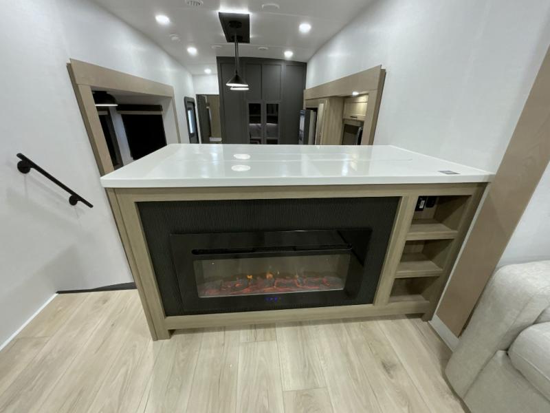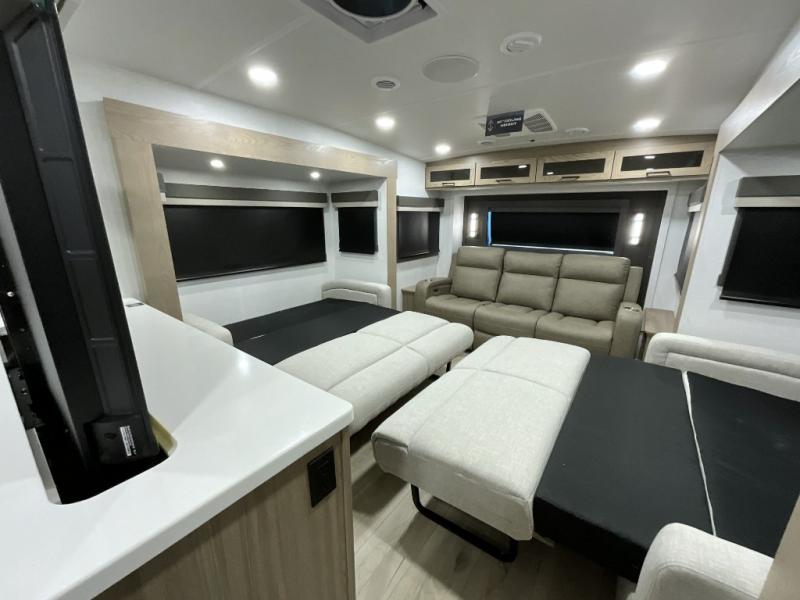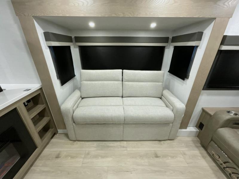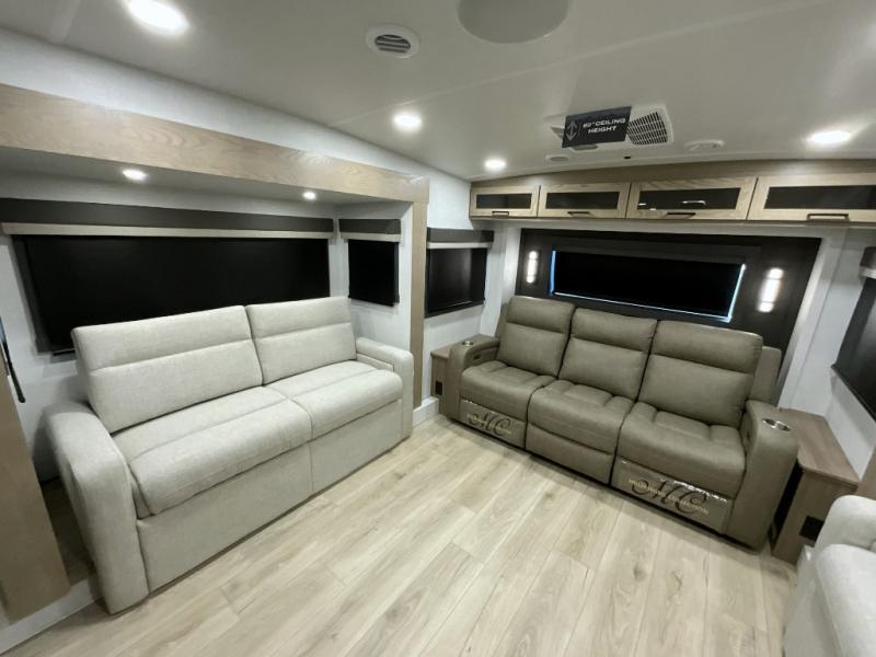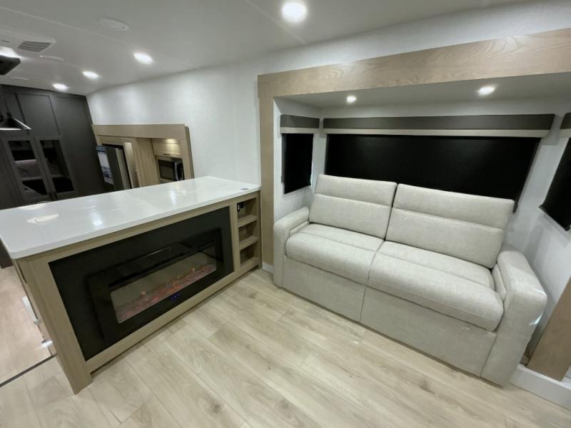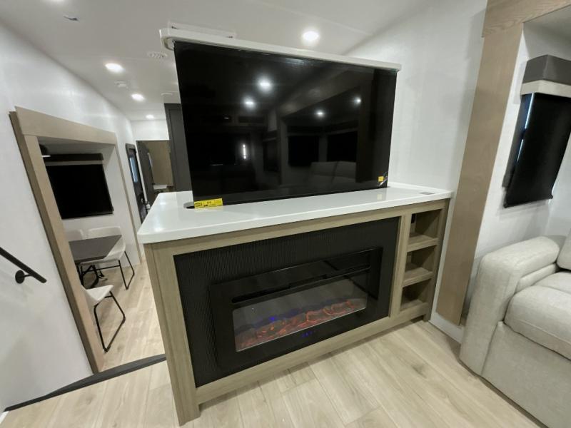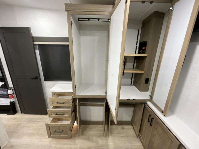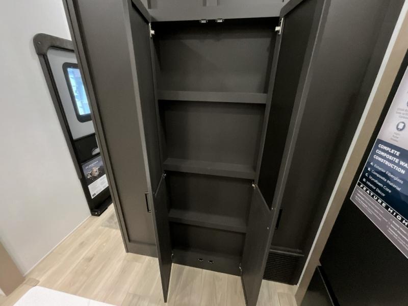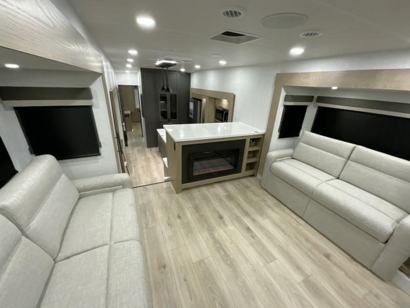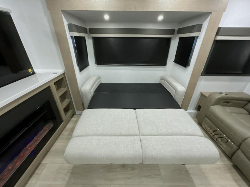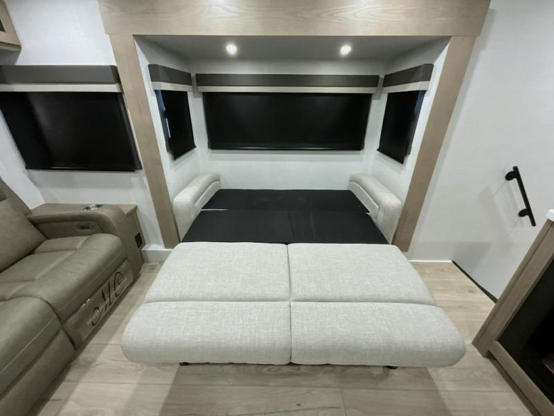 With five slide outs, a rear bedroom, and a front living area that can double as a guest bedroom, this fifth wheel is perfect for six campers! There are dual hide-a-bed sofas in the living room, along with a front theater seat across from a fireplace and televator TV. The middle kitchen includes two pantries and a 12V refrigerator for food storage, plus a rotating table and chairs to dine at. A full bath will let everyone freshen up after a day outdoors, and the rear bedroom will have you feeling right at home with its king bed slide out. There is also a wardrobe here, along with a TV option and washer/dryer prep!