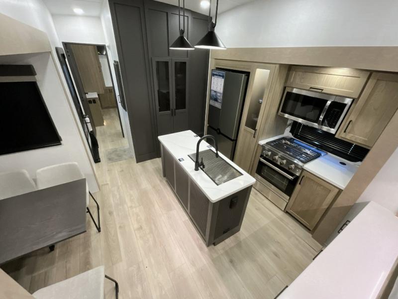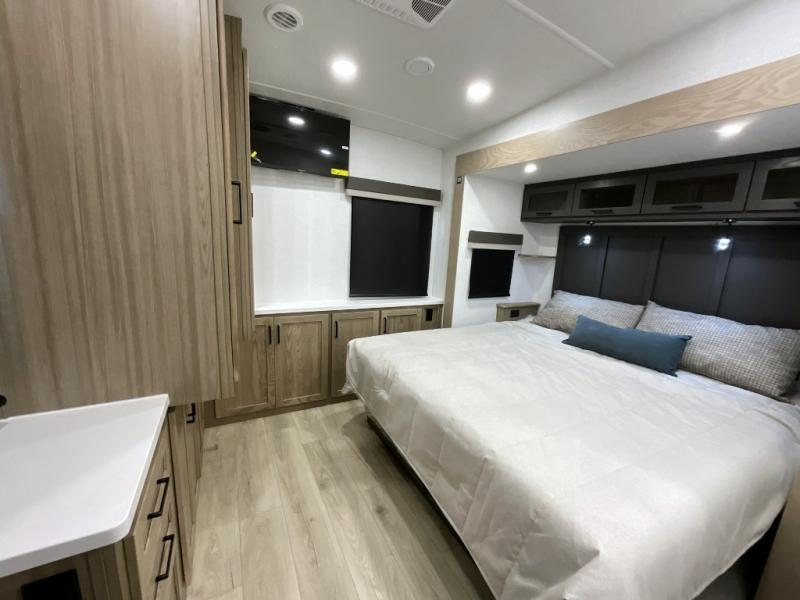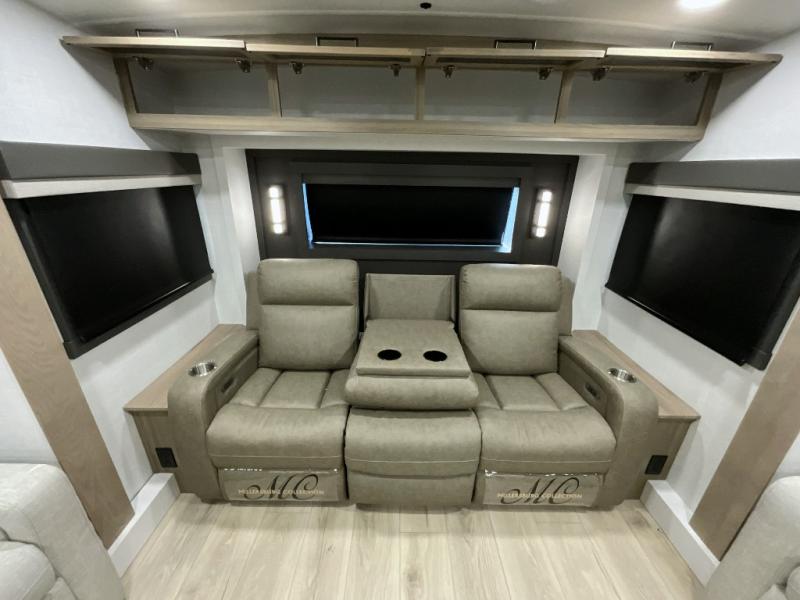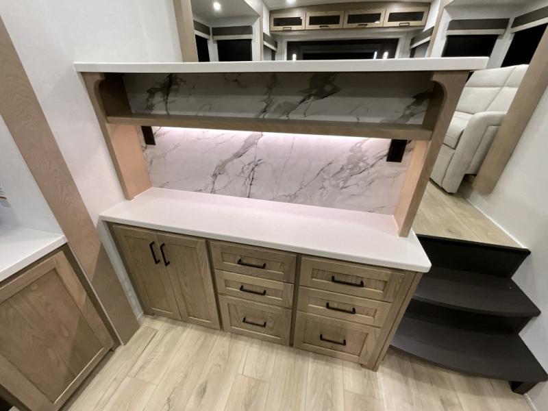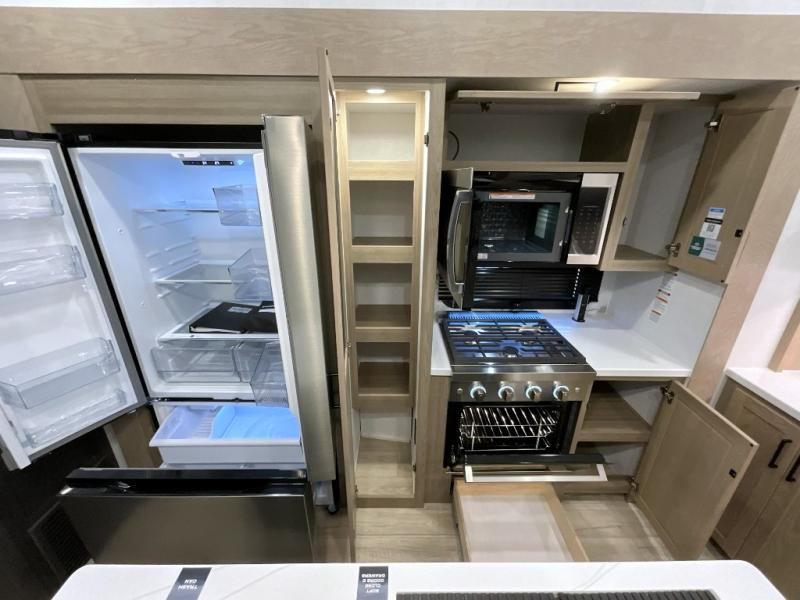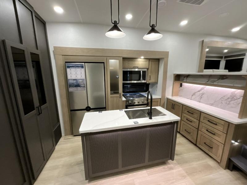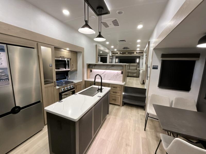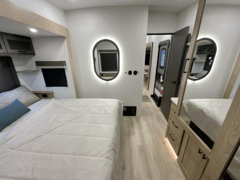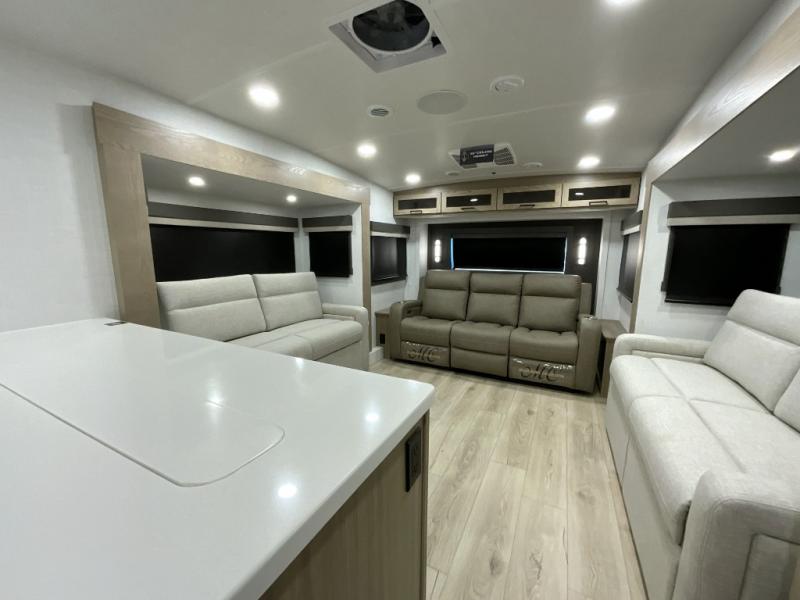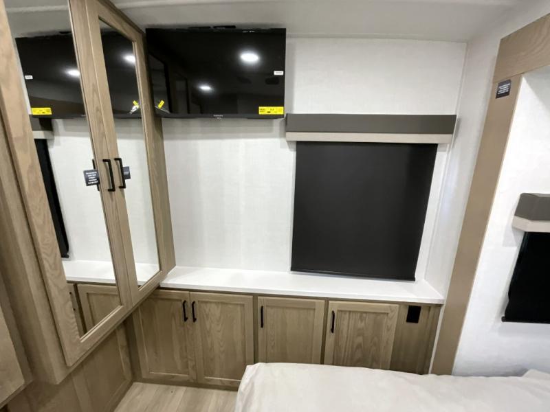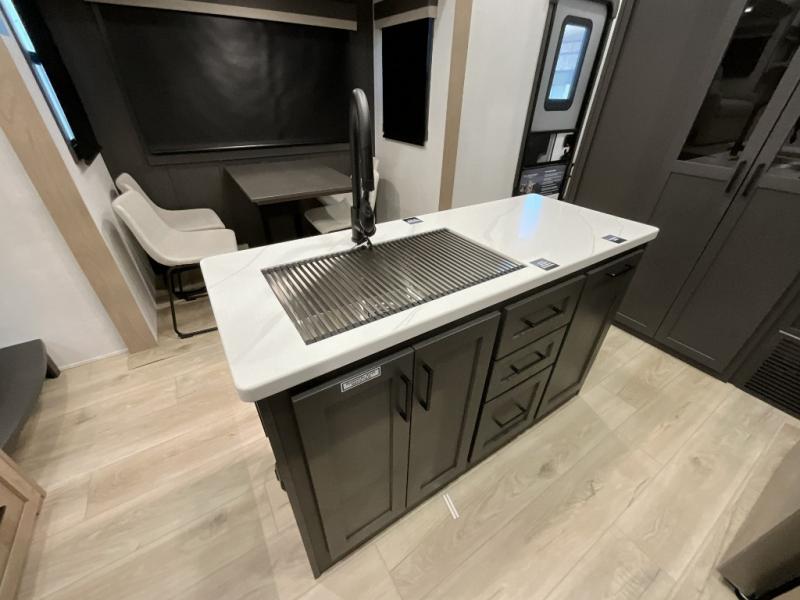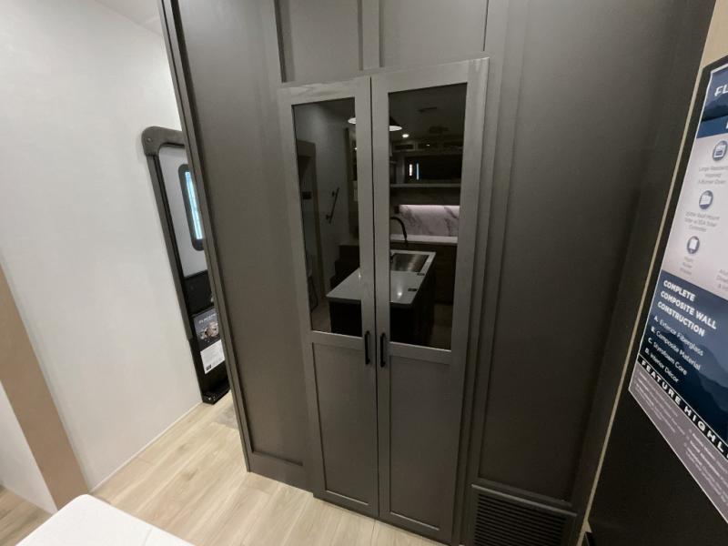 With five slide outs, a rear bedroom, and a front living area that can double as a guest bedroom, this fifth wheel is perfect for six campers! There are dual hide-a-bed sofas in the living room, along with a front theater seat across from a fireplace and televator TV. The middle kitchen includes two pantries and a 12V refrigerator for food storage, plus a rotating table and chairs to dine at. A full bath will let everyone freshen up after a day outdoors, and the rear bedroom will have you feeling right at home with its king bed slide out. There is also a wardrobe here, along with a TV option and washer/dryer prep!