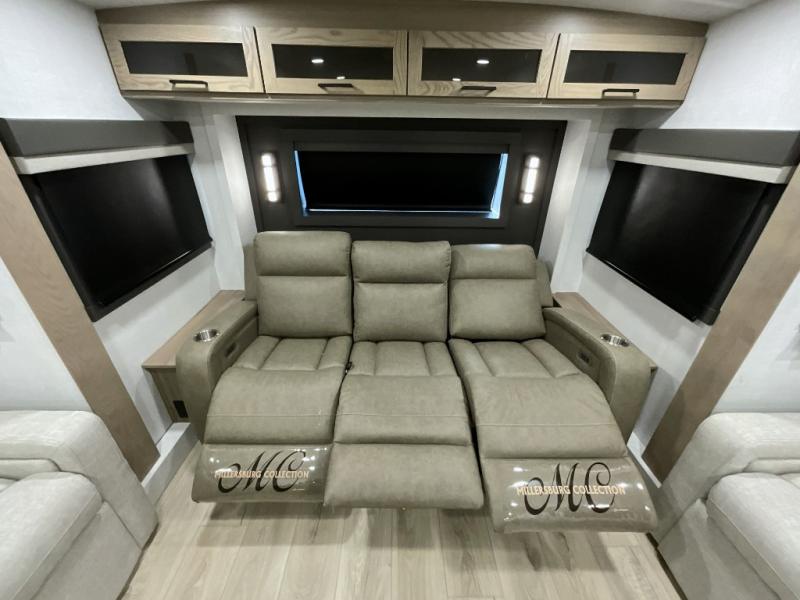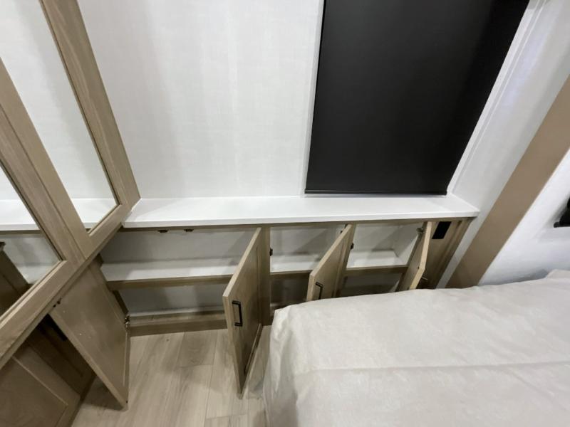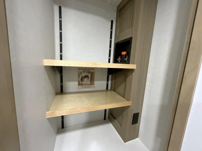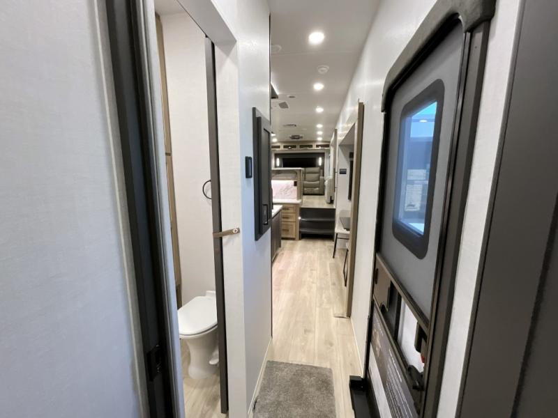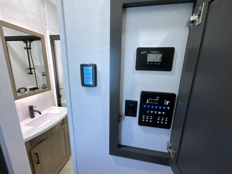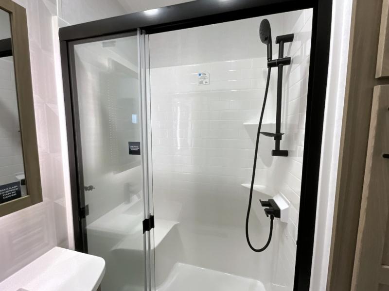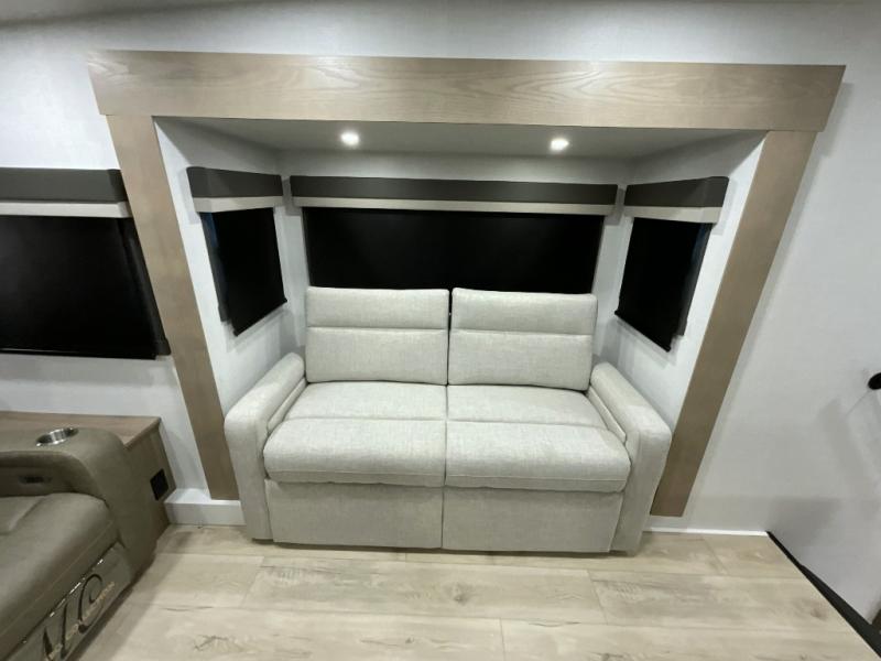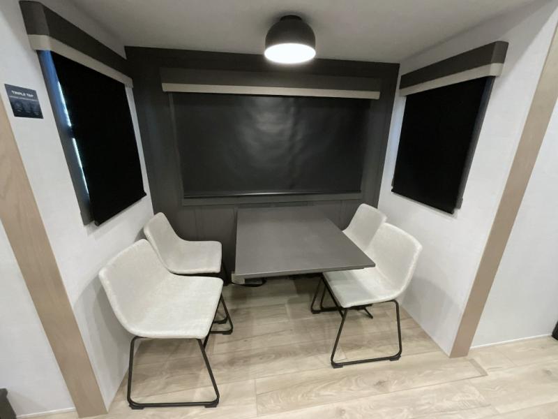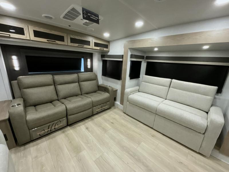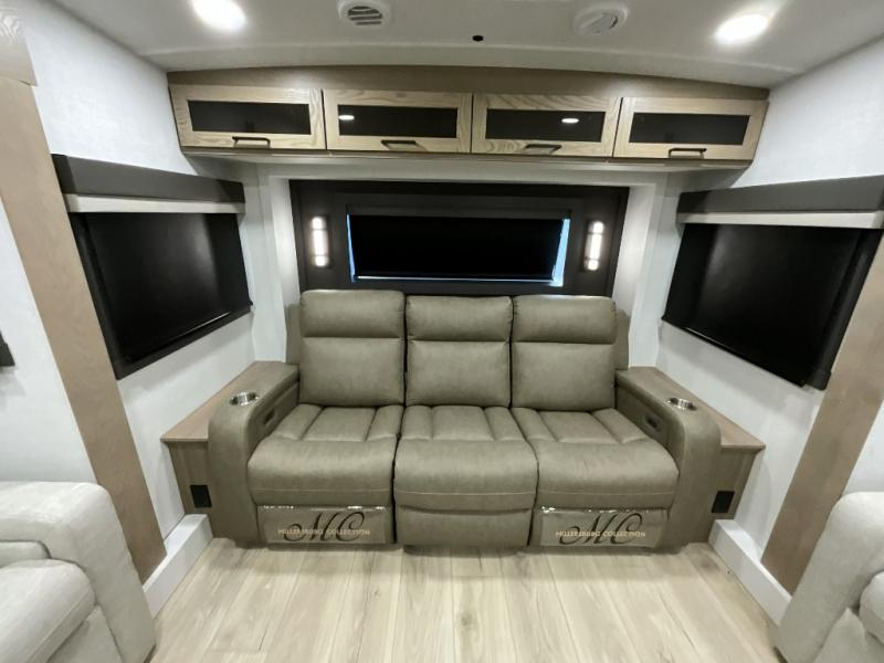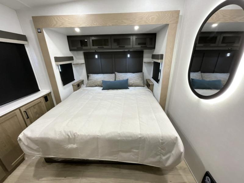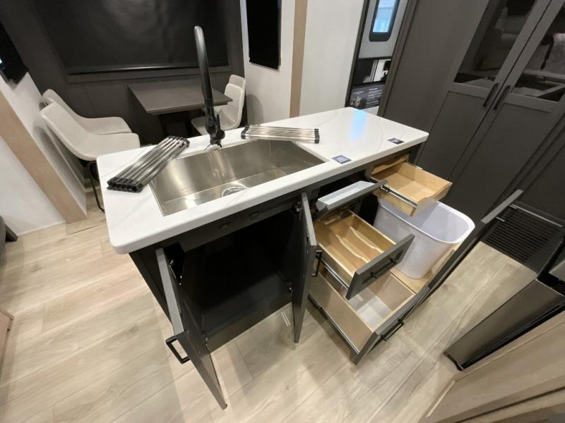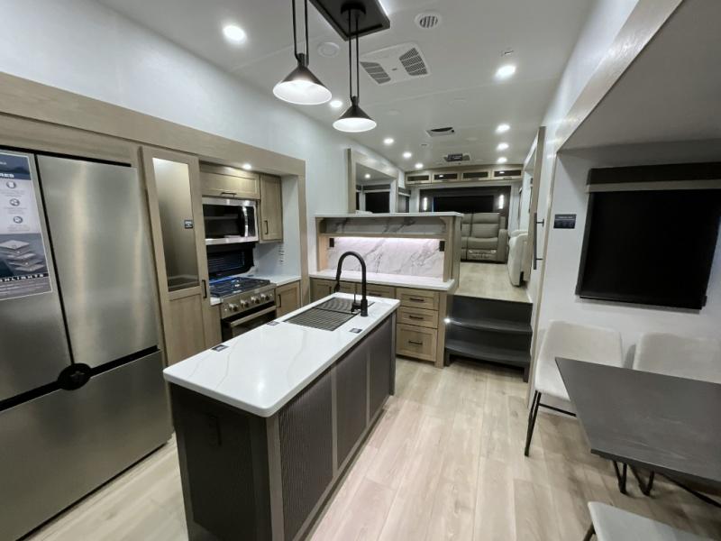With five slide outs, a rear bedroom, and a front living area that can double as a guest bedroom, this fifth wheel is perfect for six campers! There are dual hide-a-bed sofas in the living room, along with a front theater seat across from a fireplace and televator TV. The middle kitchen includes two pantries and a 12V refrigerator for food storage, plus a rotating table and chairs to dine at. A full bath will let everyone freshen up after a day outdoors, and the rear bedroom will have you feeling right at home with its king bed slide out. There is also a wardrobe here, along with a TV option and washer/dryer prep!