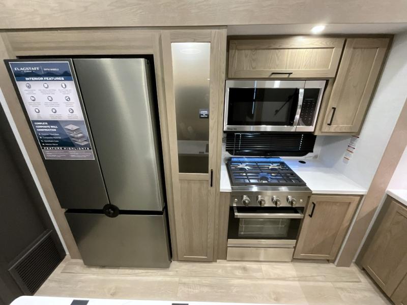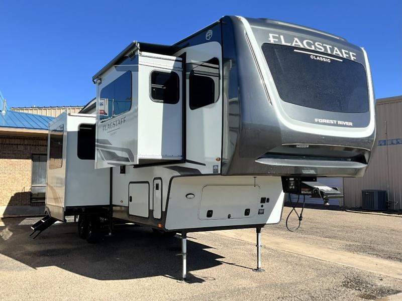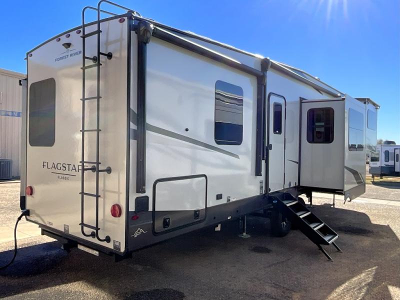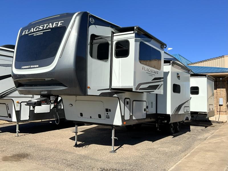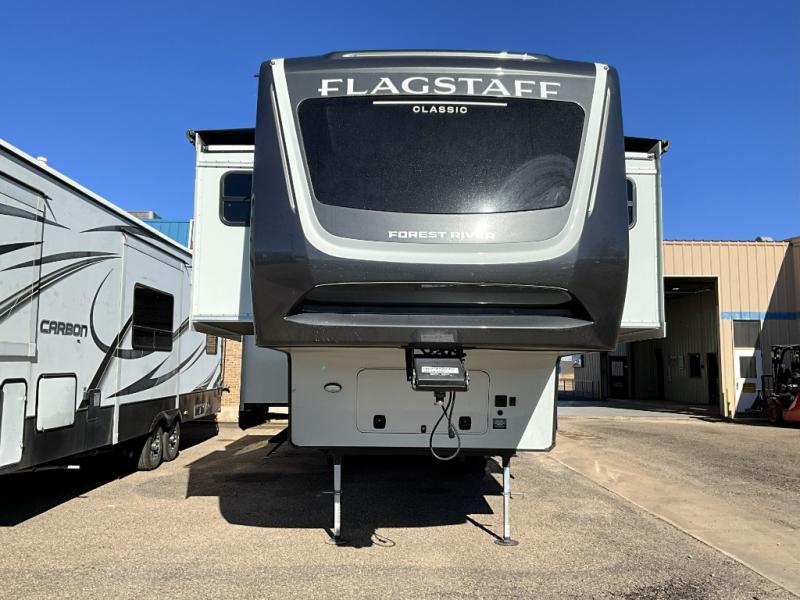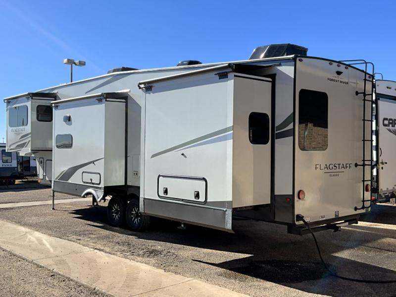 Each one of these Forest River Flagstaff Classic fifth wheels or travel trailers will be your home on wheels! Their quality craftsmanship and attention to detail shines through the enclosed underbelly, the fully laminated walkable roof, and six-sided full-aluminum frame. Towing your unit will be easy with the Goodyear Endurance tires plus RoadTech tire pressure monitoring. Additional exterior features include a 200W solar panel, slam baggage doors, a Key-Alike lock system, and double 30 lb. LP tanks to name a few conveniences. Head inside to find a residential style gas range, solid surface kitchen and bath countertops, soft close hidden cabinet hinges, and more comforts!