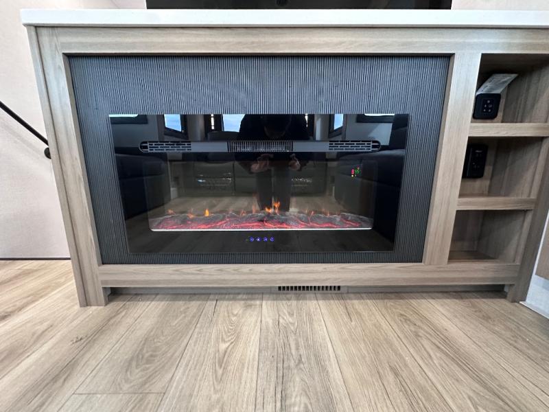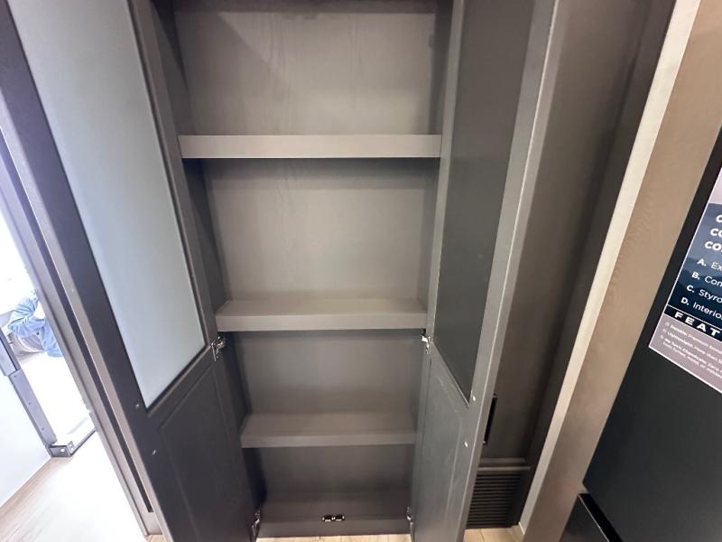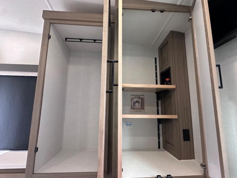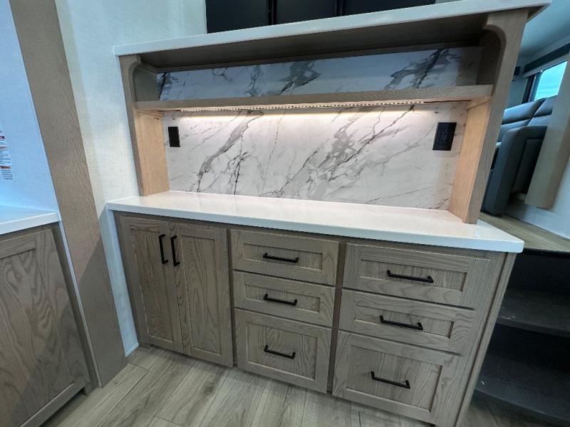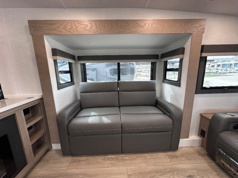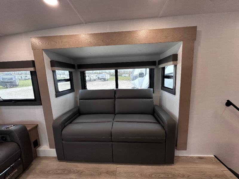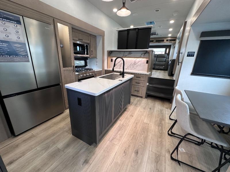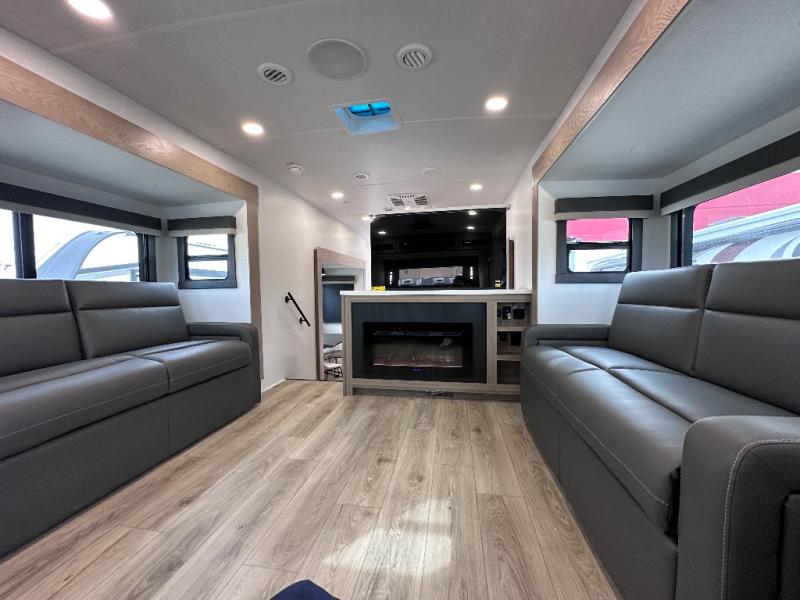 With five slide outs, a rear bedroom, and a front living area that can double as a guest bedroom, this fifth wheel is perfect for six campers! There are dual hide-a-bed sofas in the living room, along with a front theater seat across from a fireplace and televator TV. The middle kitchen includes two pantries and a 12V refrigerator for food storage, plus a rotating table and chairs to dine at. A full bath will let everyone freshen up after a day outdoors, and the rear bedroom will have you feeling right at home with its king bed slide out. There is also a wardrobe here, along with a TV option and washer/dryer prep!