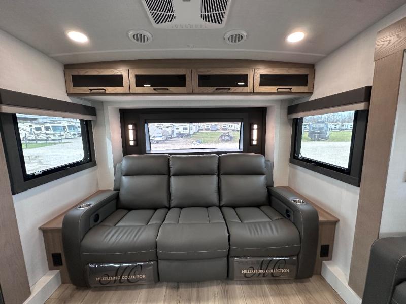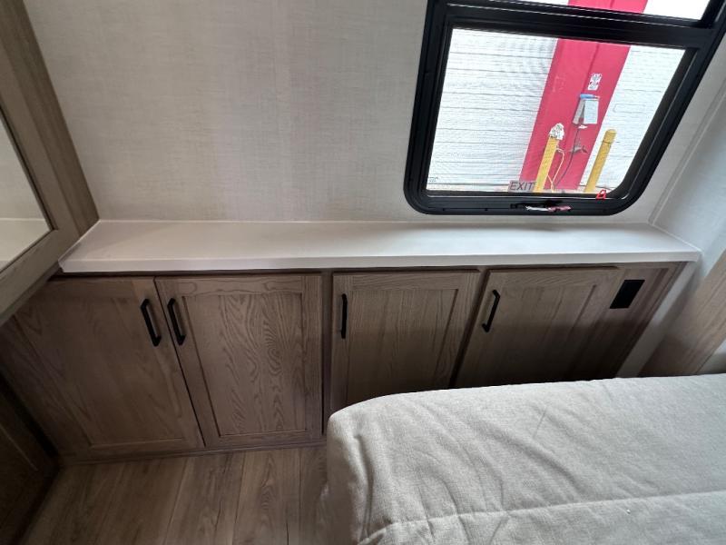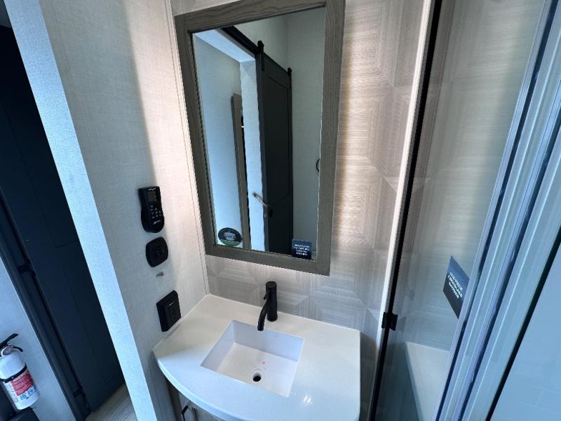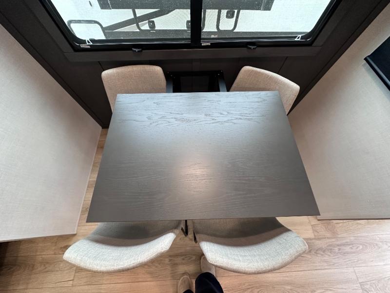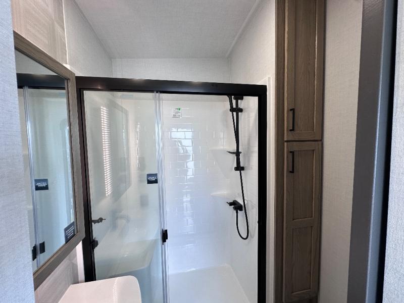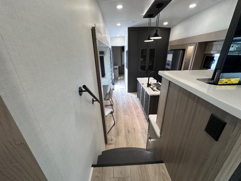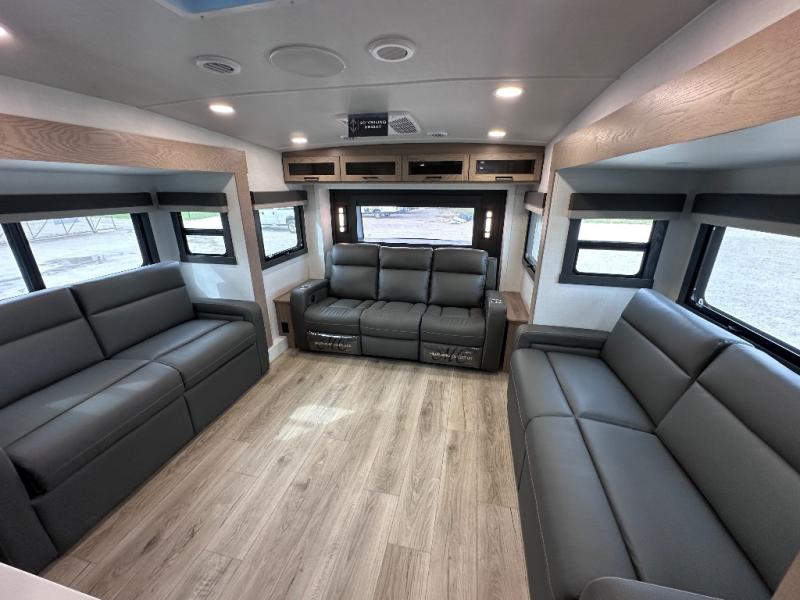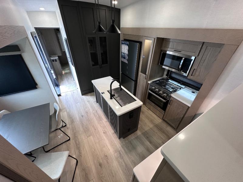 With five slide outs, a rear bedroom, and a front living area that can double as a guest bedroom, this fifth wheel is perfect for six campers! There are dual hide-a-bed sofas in the living room, along with a front theater seat across from a fireplace and televator TV. The middle kitchen includes two pantries and a 12V refrigerator for food storage, plus a rotating table and chairs to dine at. A full bath will let everyone freshen up after a day outdoors, and the rear bedroom will have you feeling right at home with its king bed slide out. There is also a wardrobe here, along with a TV option and washer/dryer prep!