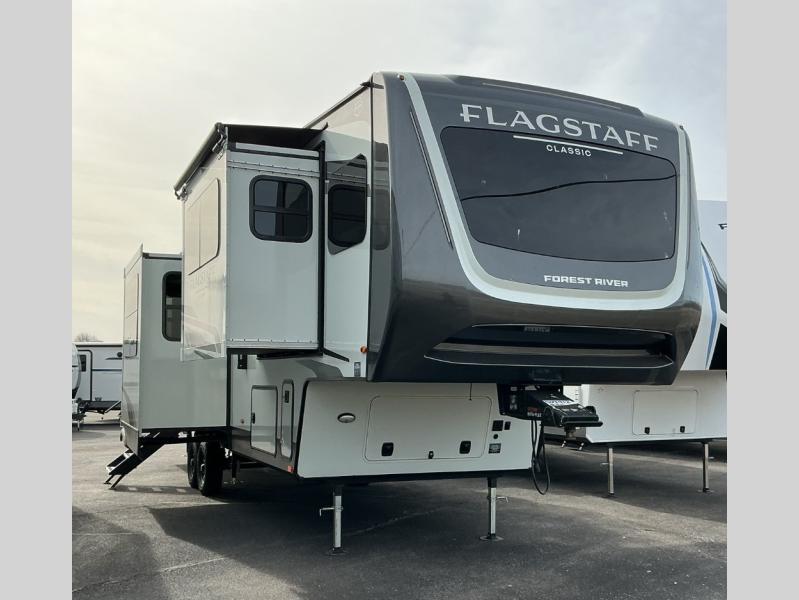 Each one of these Forest River Flagstaff Classic fifth wheels or travel trailers will be your home on wheels! Their quality craftsmanship and attention to detail shines through the enclosed underbelly, the fully laminated walkable roof, and six-sided full-aluminum frame. Towing your unit will be easy with the Goodyear Endurance tires plus RoadTech tire pressure monitoring. Additional exterior features include a 200W solar panel, slam baggage doors, a Key-Alike lock system, and double 30 lb. LP tanks to name a few conveniences. Head inside to find a residential style gas range, solid surface kitchen and bath countertops, soft close hidden cabinet hinges, and more comforts!