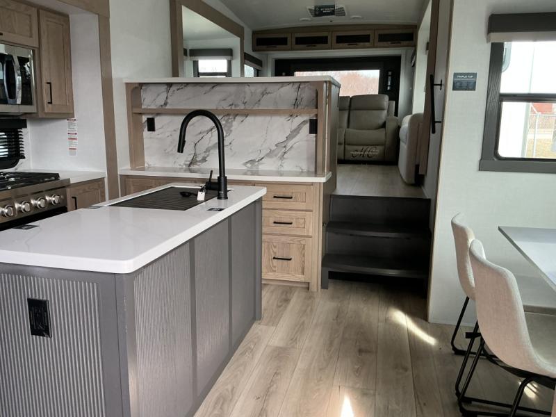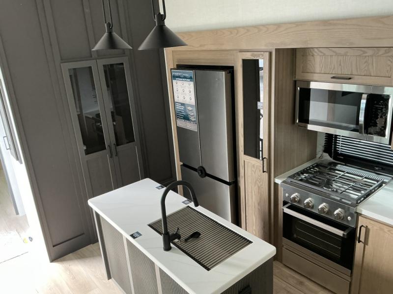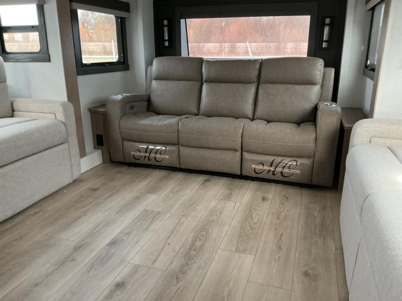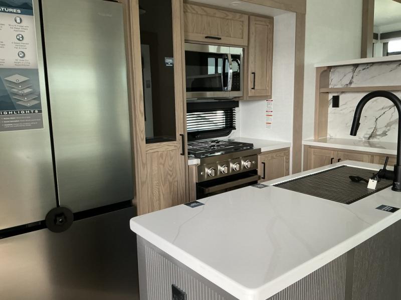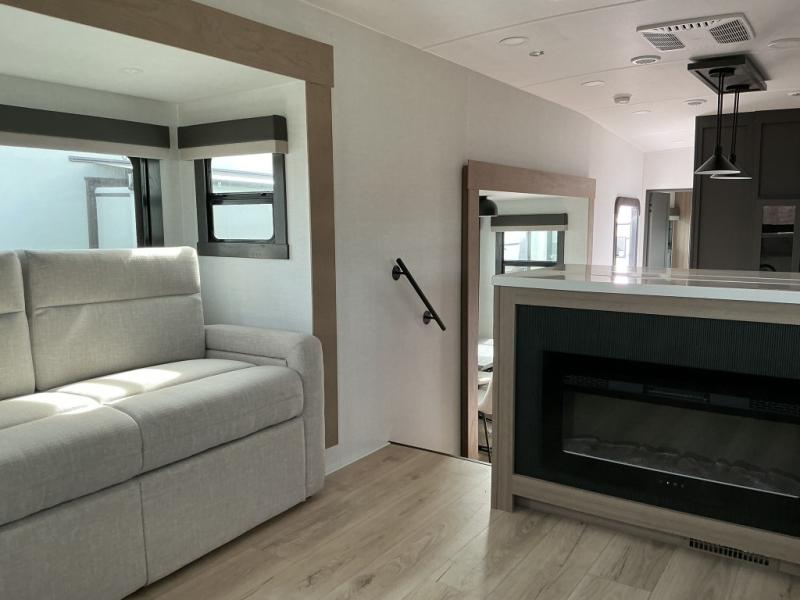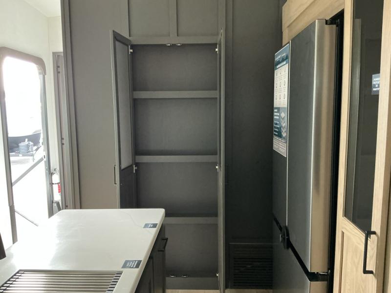 With five slide outs, a rear bedroom, and a front living area that can double as a guest bedroom, this fifth wheel is perfect for six campers! There are dual hide-a-bed sofas in the living room, along with a front theater seat across from a fireplace and televator TV. The middle kitchen includes two pantries and a 12V refrigerator for food storage, plus a rotating table and chairs to dine at. A full bath will let everyone freshen up after a day outdoors, and the rear bedroom will have you feeling right at home with its king bed slide out. There is also a wardrobe here, along with a TV option and washer/dryer prep!