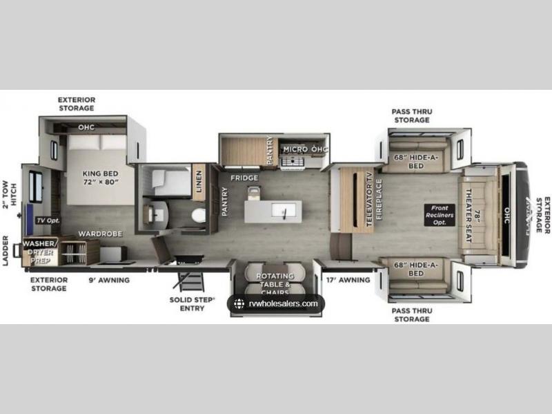 With five slide outs, a rear bedroom, and a front living area that can double as a guest bedroom, this fifth wheel is perfect for six campers! There are dual hide-a-bed sofas in the living room, along with a front theater seat across from a fireplace and televator TV. The middle kitchen includes two pantries and a 12V refrigerator for food storage, plus a rotating table and chairs to dine at. A full bath will let everyone freshen up after a day outdoors, and the rear bedroom will have you feeling right at home with its king bed slide out. There is also a wardrobe here, along with a TV option and washer/dryer prep!