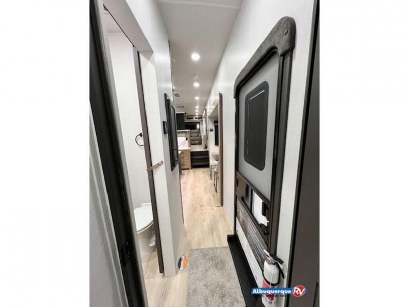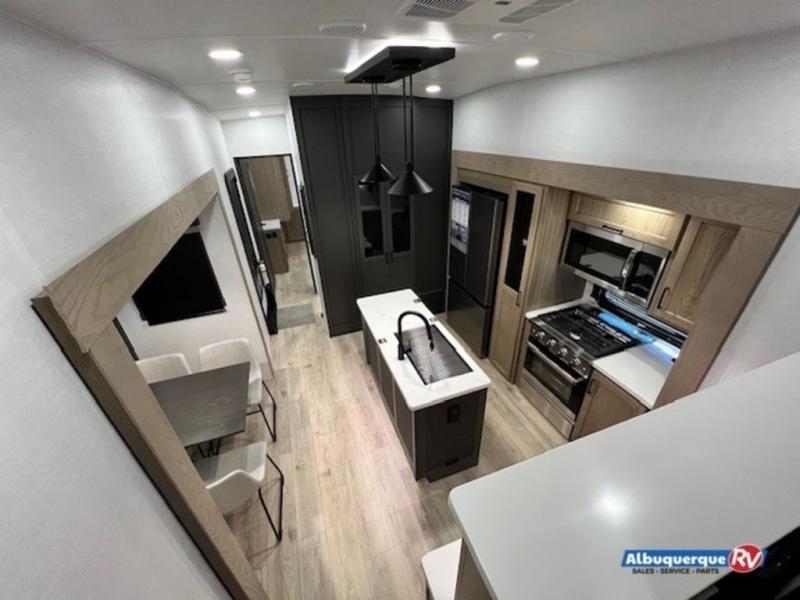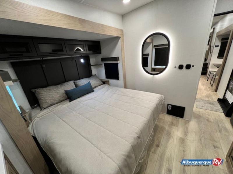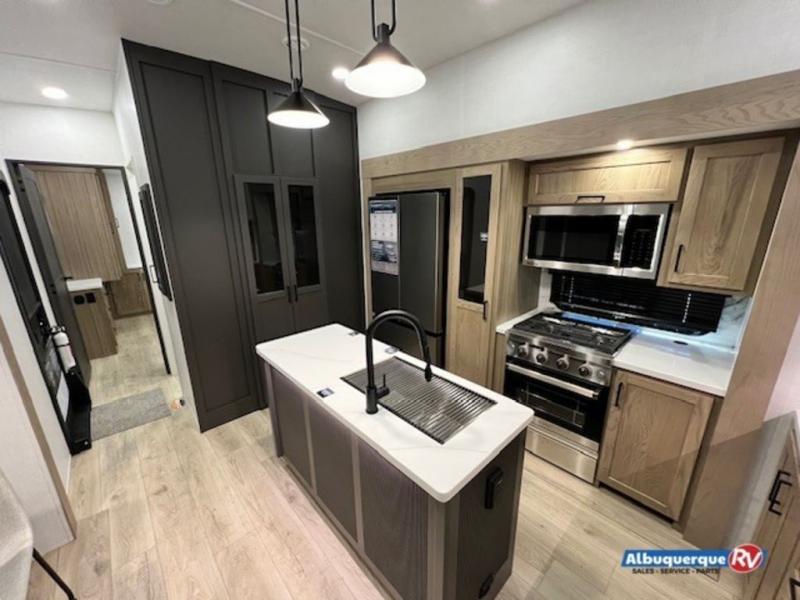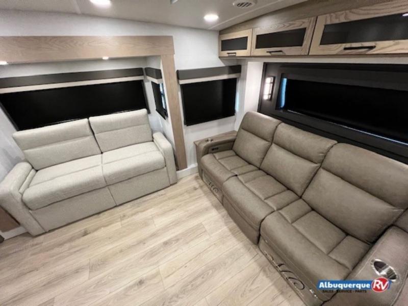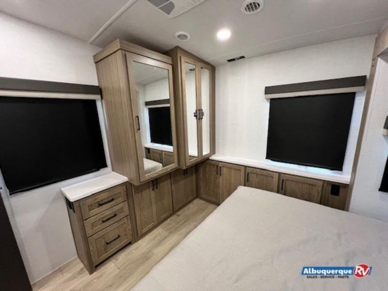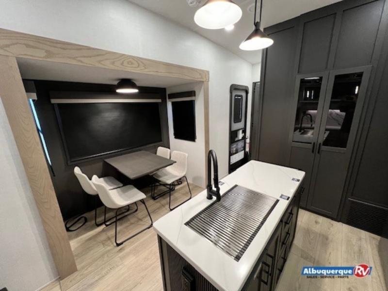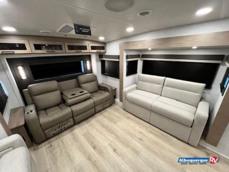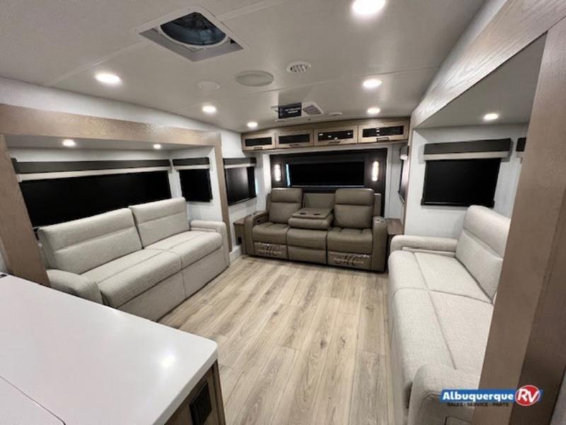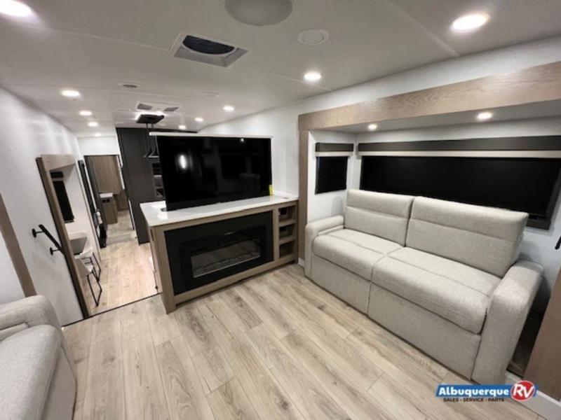 With five slide outs, a rear bedroom, and a front living area that can double as a guest bedroom, this fifth wheel is perfect for six campers! There are dual hide-a-bed sofas in the living room, along with a front theater seat across from a fireplace and televator TV. The middle kitchen includes two pantries and a 12V refrigerator for food storage, plus a rotating table and chairs to dine at. A full bath will let everyone freshen up after a day outdoors, and the rear bedroom will have you feeling right at home with its king bed slide out. There is also a wardrobe here, along with a TV option and washer/dryer prep!