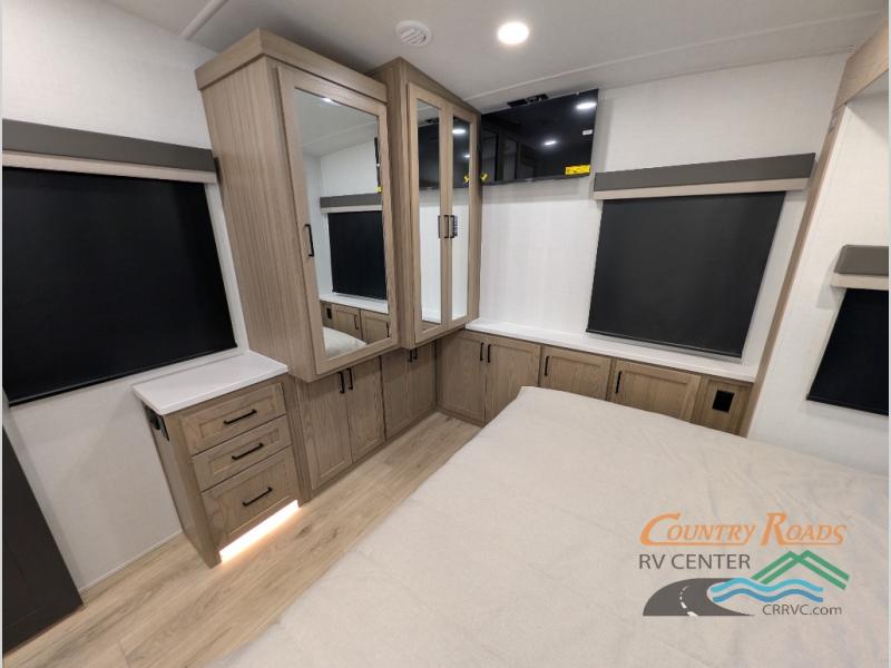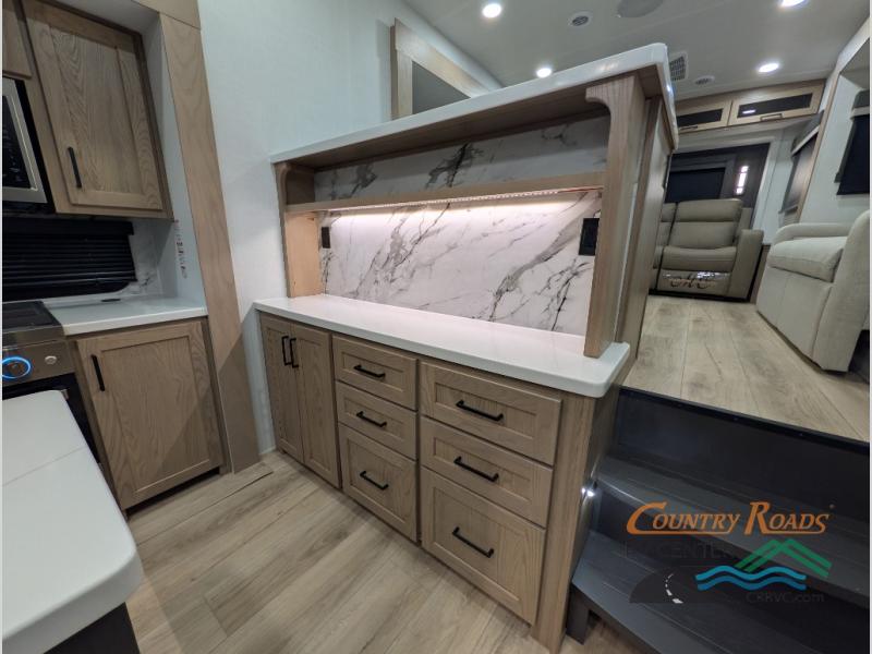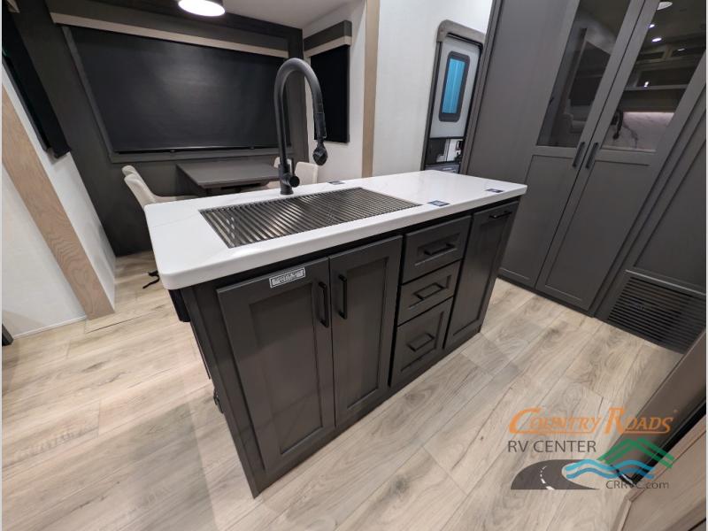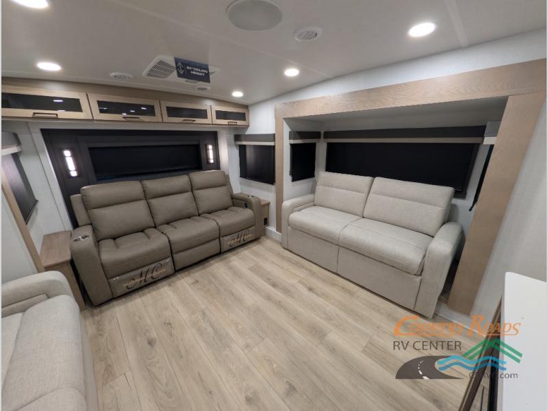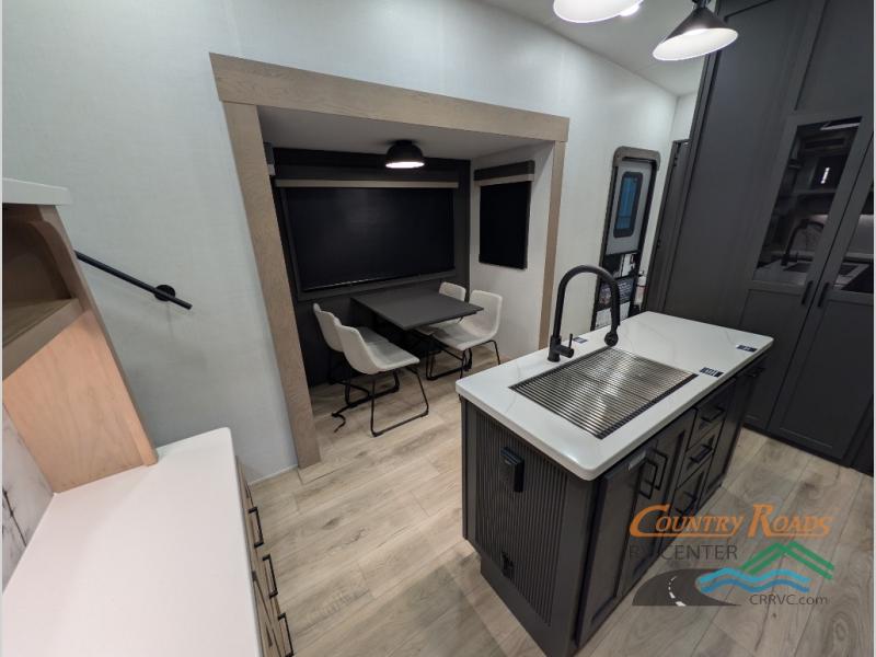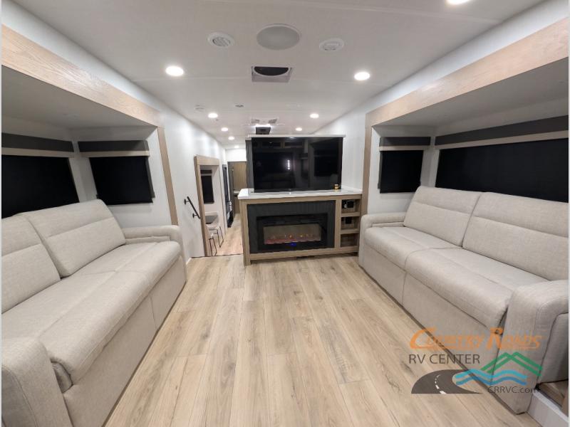 With five slide outs, a rear bedroom, and a front living area that can double as a guest bedroom, this fifth wheel is perfect for six campers! There are dual hide-a-bed sofas in the living room, along with a front theater seat across from a fireplace and televator TV. The middle kitchen includes two pantries and a 12V refrigerator for food storage, plus a rotating table and chairs to dine at. A full bath will let everyone freshen up after a day outdoors, and the rear bedroom will have you feeling right at home with its king bed slide out. There is also a wardrobe here, along with a TV option and washer/dryer prep!