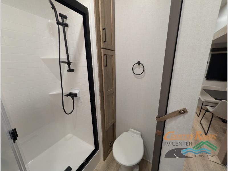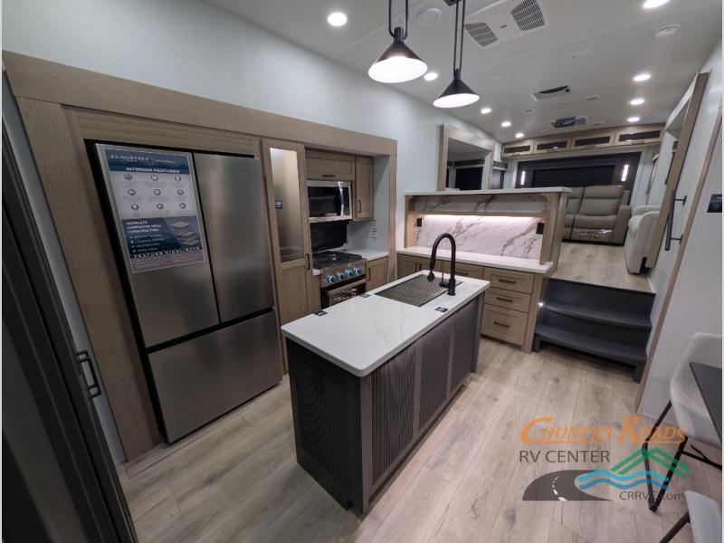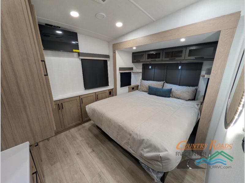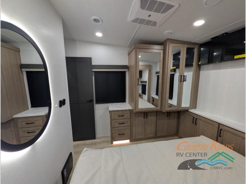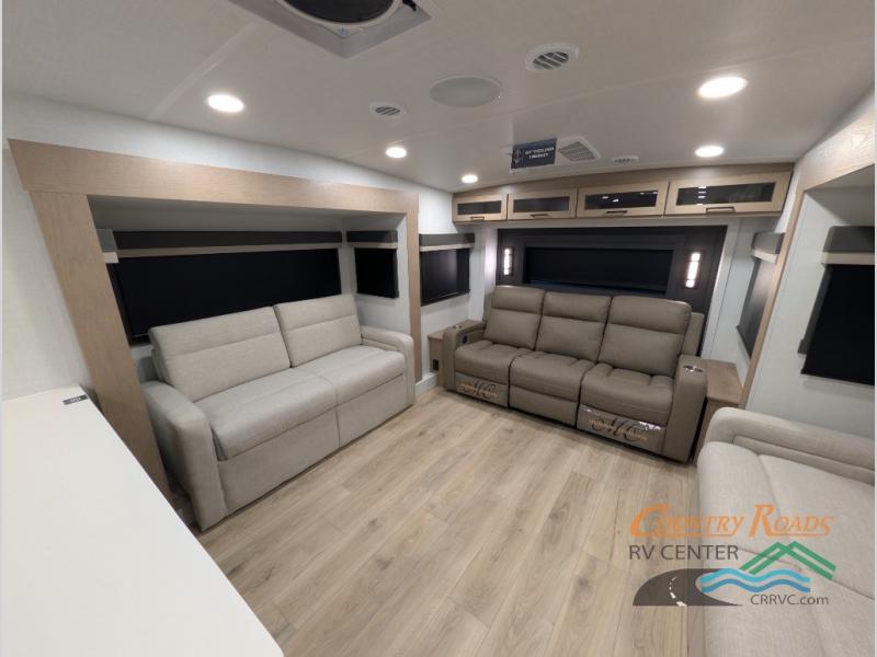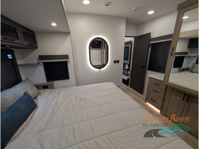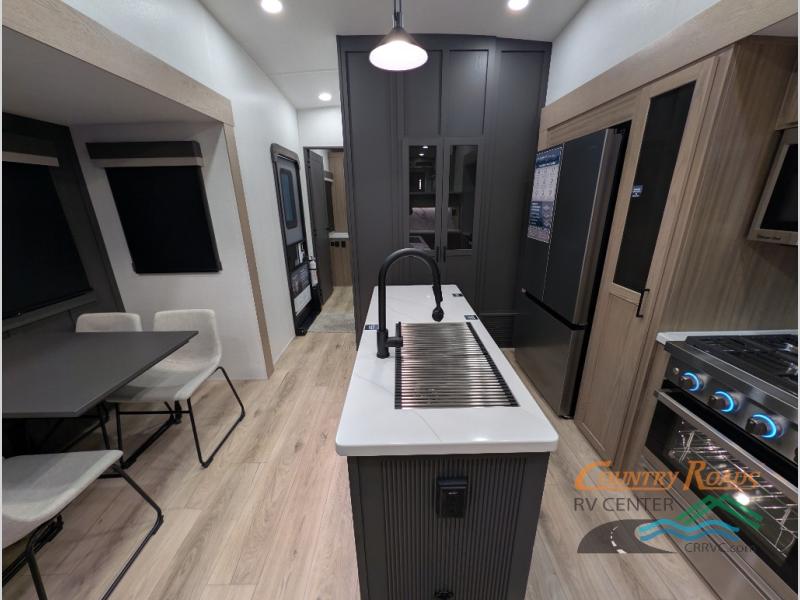 With five slide outs, a rear bedroom, and a front living area that can double as a guest bedroom, this fifth wheel is perfect for six campers! There are dual hide-a-bed sofas in the living room, along with a front theater seat across from a fireplace and televator TV. The middle kitchen includes two pantries and a 12V refrigerator for food storage, plus a rotating table and chairs to dine at. A full bath will let everyone freshen up after a day outdoors, and the rear bedroom will have you feeling right at home with its king bed slide out. There is also a wardrobe here, along with a TV option and washer/dryer prep!