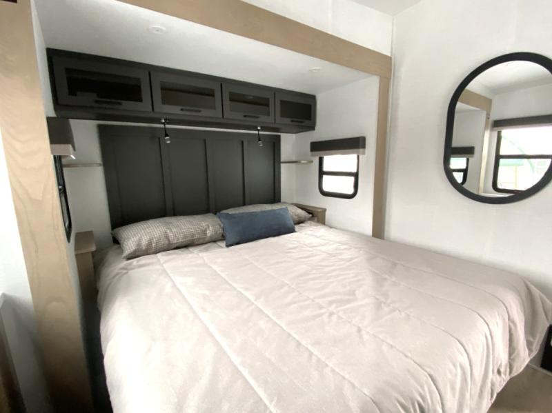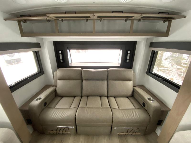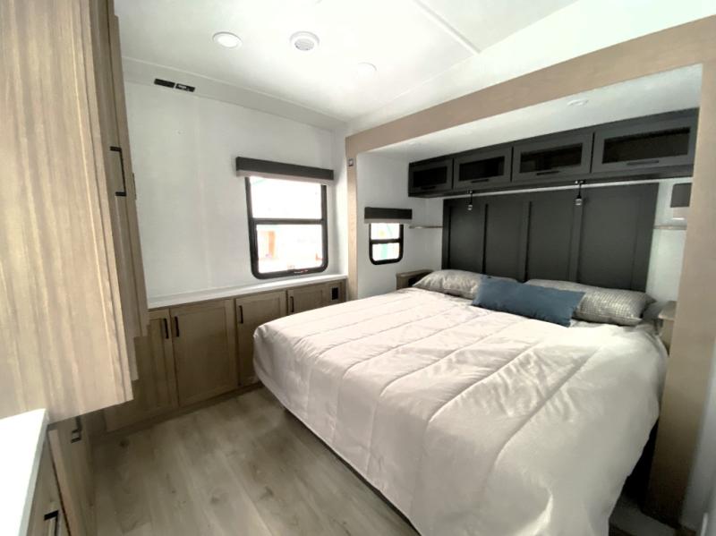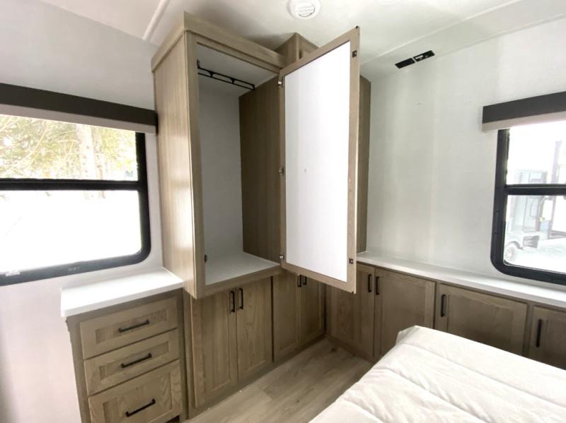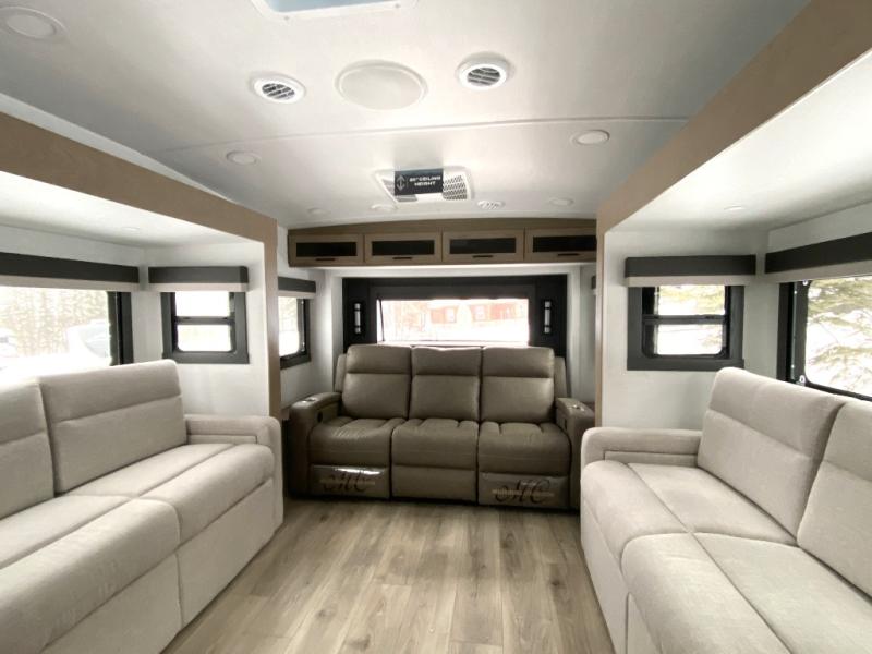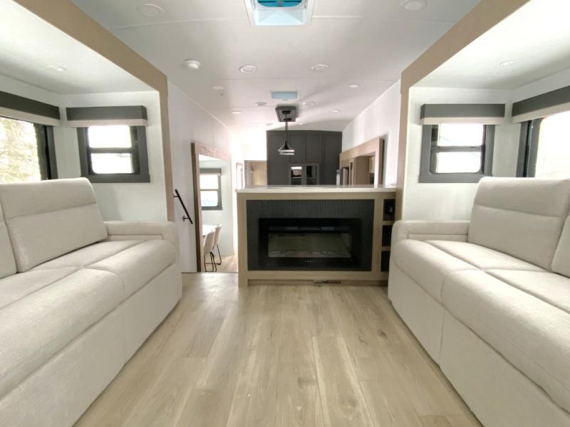 With five slide outs, a rear bedroom, and a front living area that can double as a guest bedroom, this fifth wheel is perfect for six campers! There are dual hide-a-bed sofas in the living room, along with a front theater seat across from a fireplace and televator TV. The middle kitchen includes two pantries and a 12V refrigerator for food storage, plus a rotating table and chairs to dine at. A full bath will let everyone freshen up after a day outdoors, and the rear bedroom will have you feeling right at home with its king bed slide out. There is also a wardrobe here, along with a TV option and washer/dryer prep!