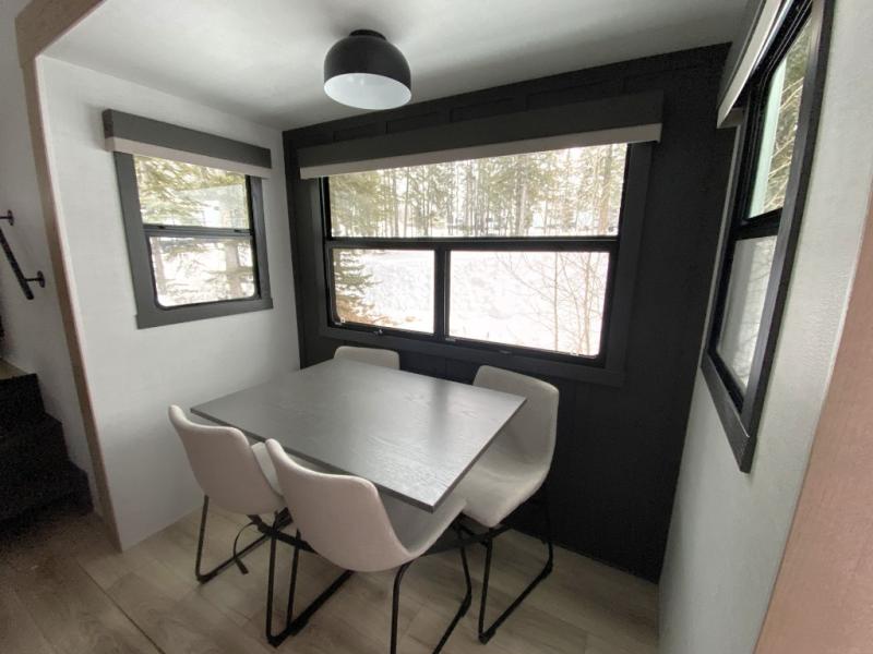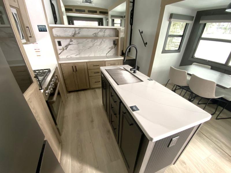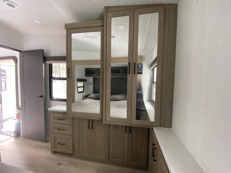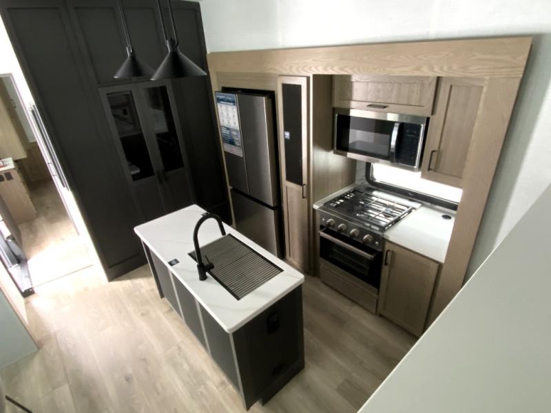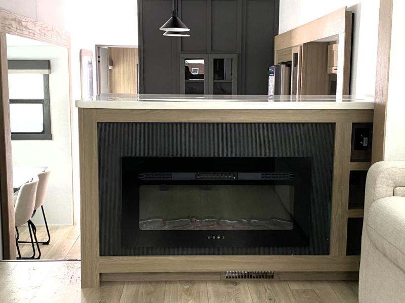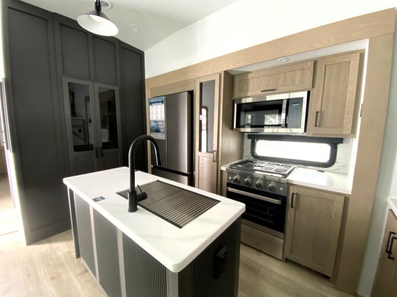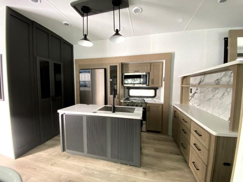 With five slide outs, a rear bedroom, and a front living area that can double as a guest bedroom, this fifth wheel is perfect for six campers! There are dual hide-a-bed sofas in the living room, along with a front theater seat across from a fireplace and televator TV. The middle kitchen includes two pantries and a 12V refrigerator for food storage, plus a rotating table and chairs to dine at. A full bath will let everyone freshen up after a day outdoors, and the rear bedroom will have you feeling right at home with its king bed slide out. There is also a wardrobe here, along with a TV option and washer/dryer prep!