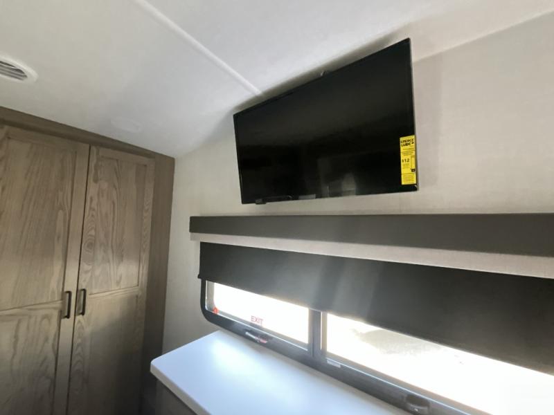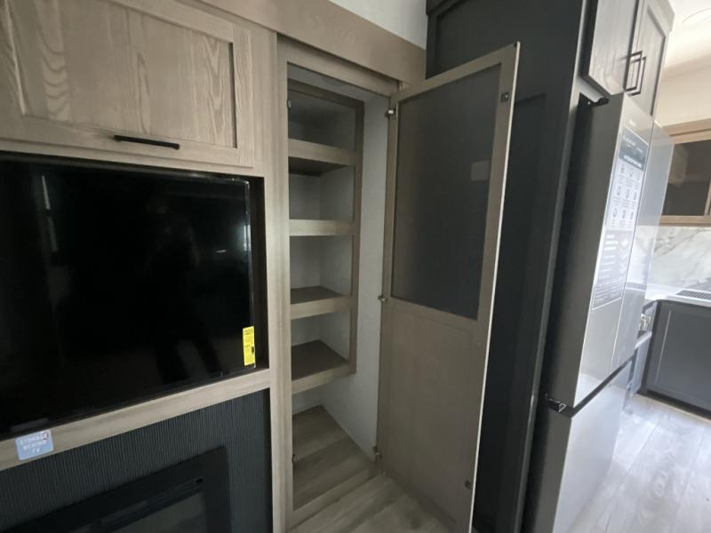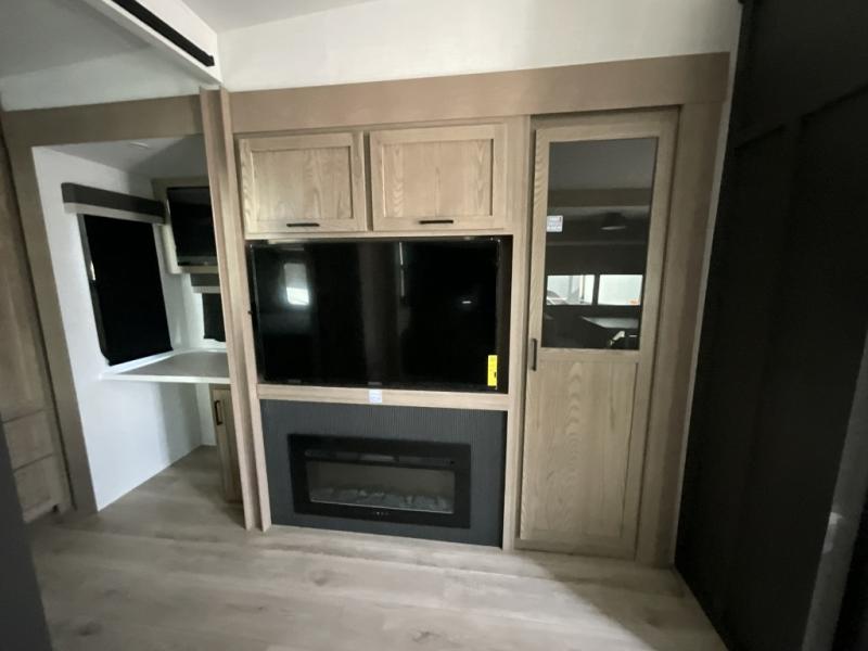 This is the perfect fifth wheel if you're camping with family or a group of friends. You'll have the front private bedroom with a king bed slide out all to yourselves, while your guests take the rear private bunkhouse. There is a 48" x 72" lower bunk with a 48" x 72" top bunk, a spacious wardrobe, and a desk with a chair within a slide out. This slide is also shared with the living room Smart TV and fireplace. Once breakfast has been made in the middle kitchen, you can dine at the 44" booth dinette, or just relax on the theater seat before heading out for the day. A full bath will be waiting for you when you return, and there are two power awnings outside so you can enjoy an evening under the LED lights!