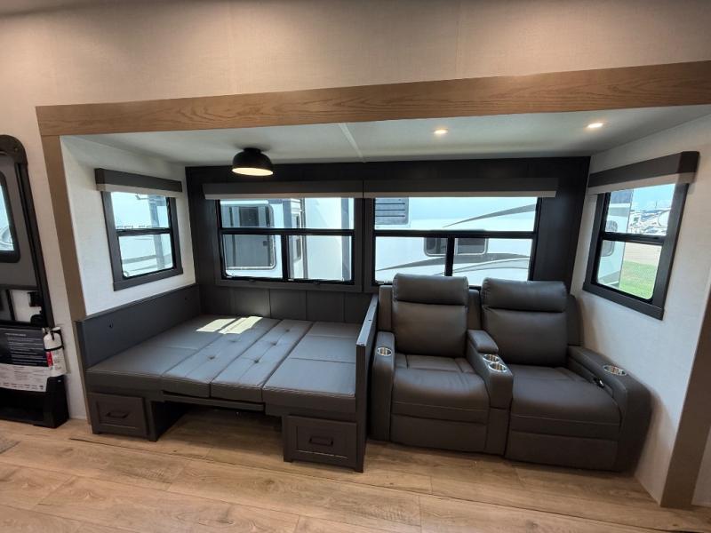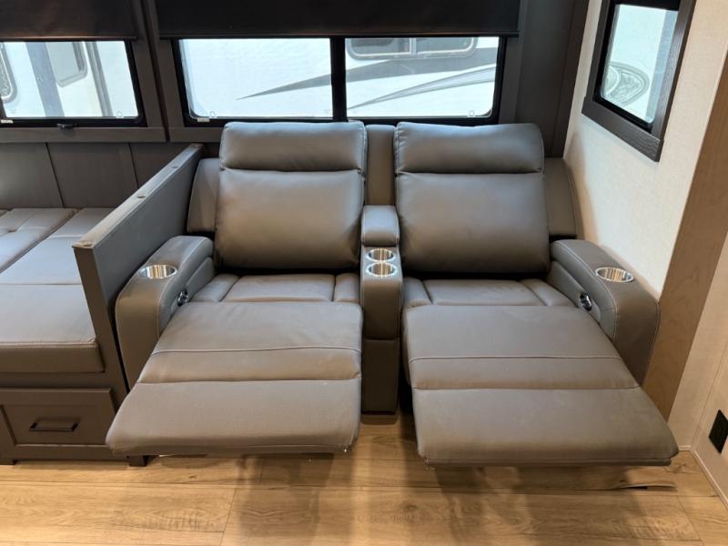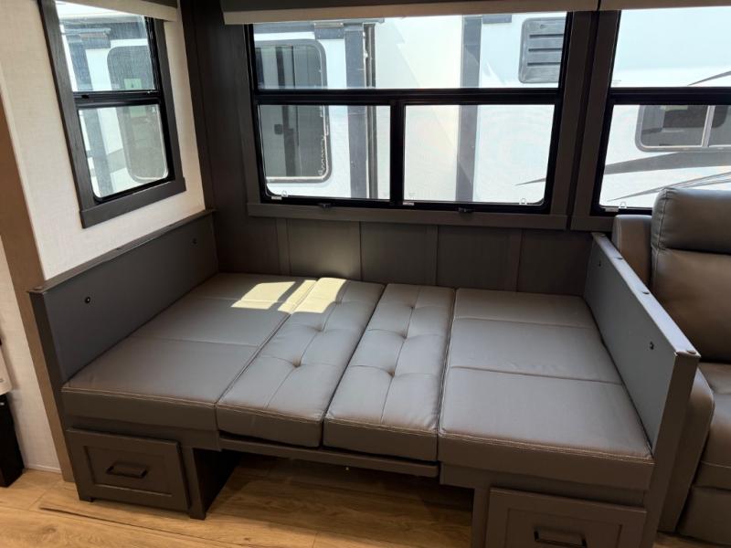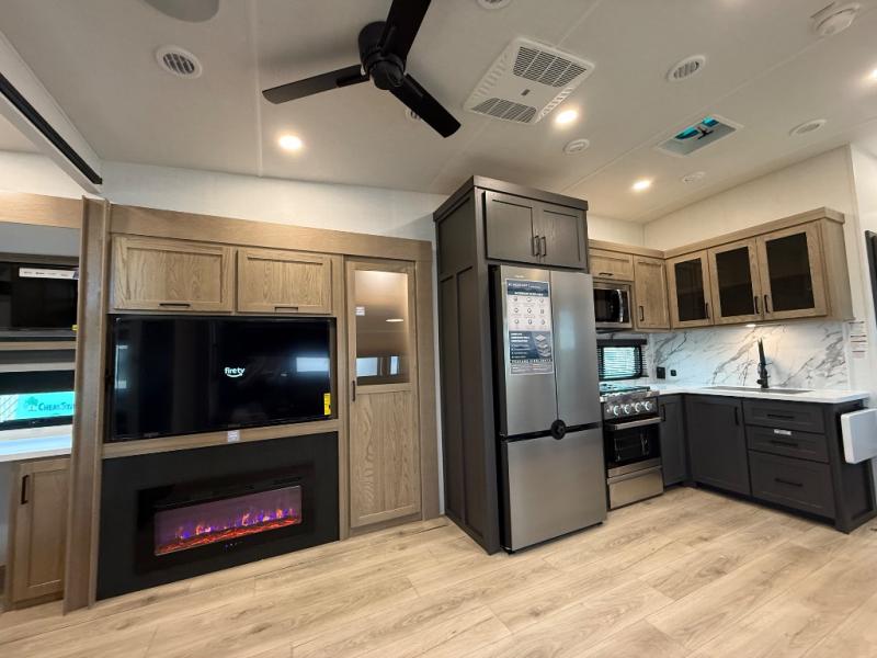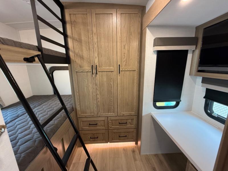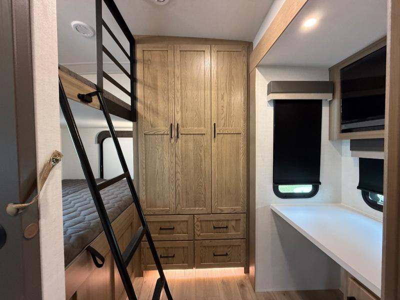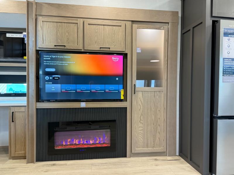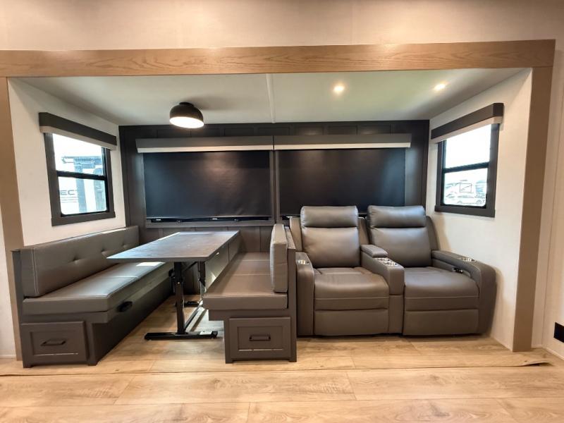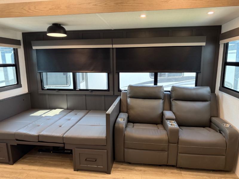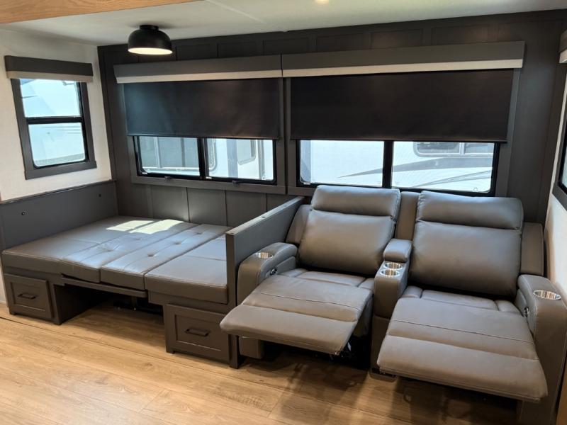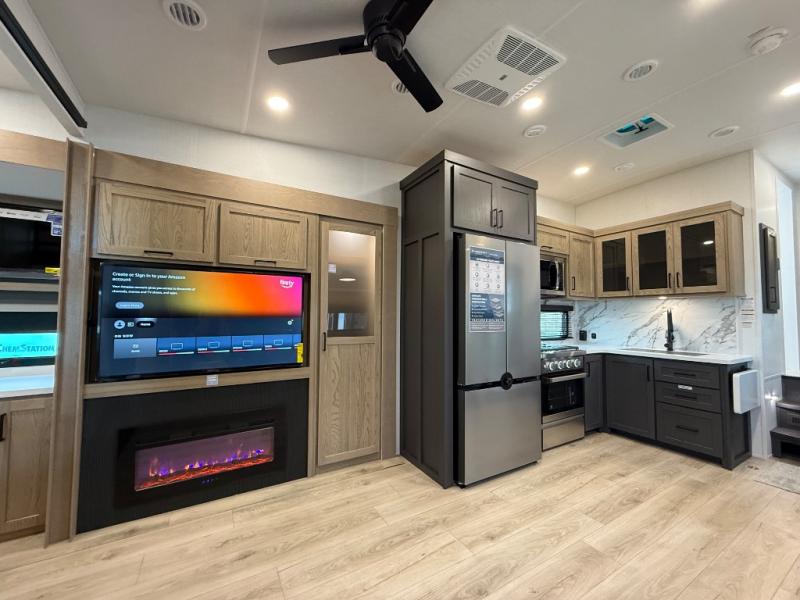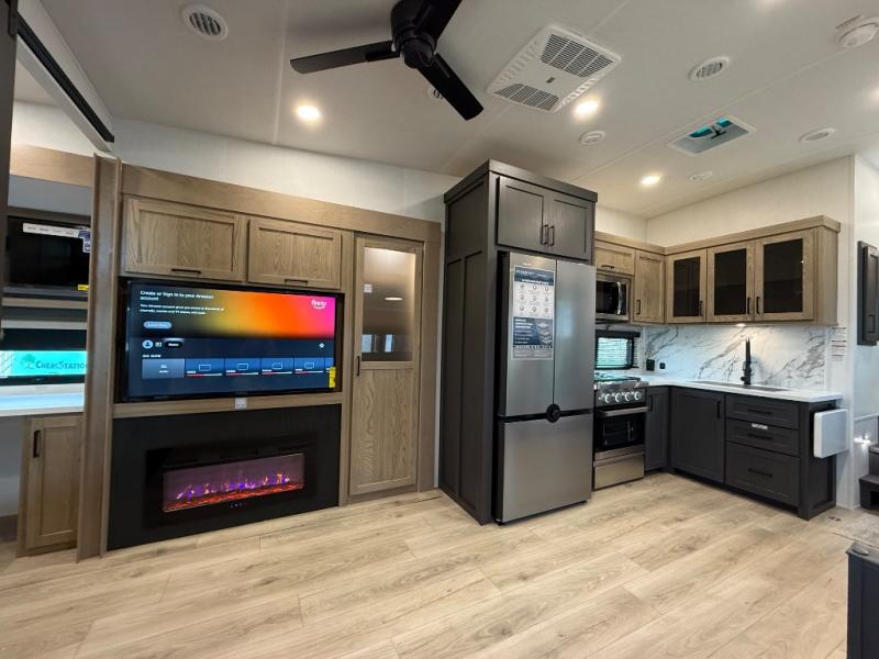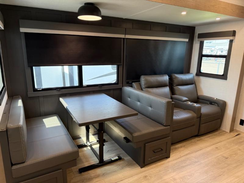 This is the perfect fifth wheel if you're camping with family or a group of friends. You'll have the front private bedroom with a king bed slide out all to yourselves, while your guests take the rear private bunkhouse. There is a 48" x 72" lower bunk with a 48" x 72" top bunk, a spacious wardrobe, and a desk with a chair within a slide out. This slide is also shared with the living room Smart TV and fireplace. Once breakfast has been made in the middle kitchen, you can dine at the 44" booth dinette, or just relax on the theater seat before heading out for the day. A full bath will be waiting for you when you return, and there are two power awnings outside so you can enjoy an evening under the LED lights!