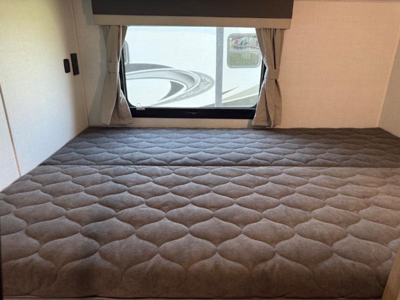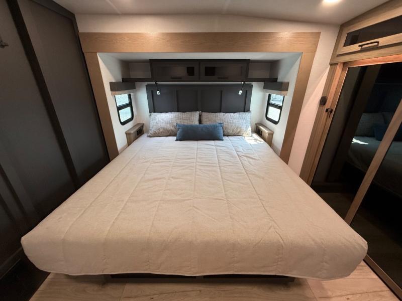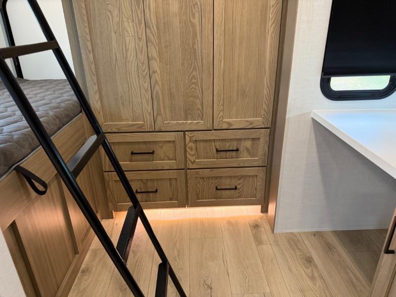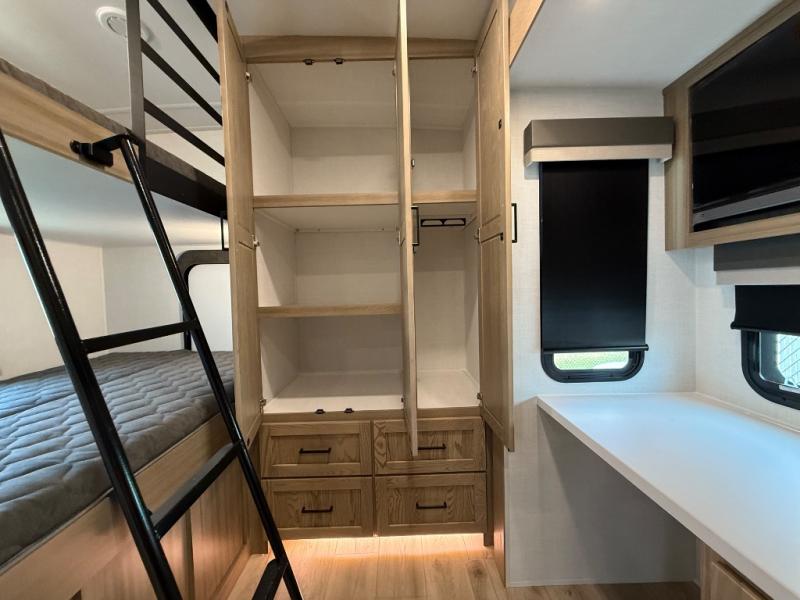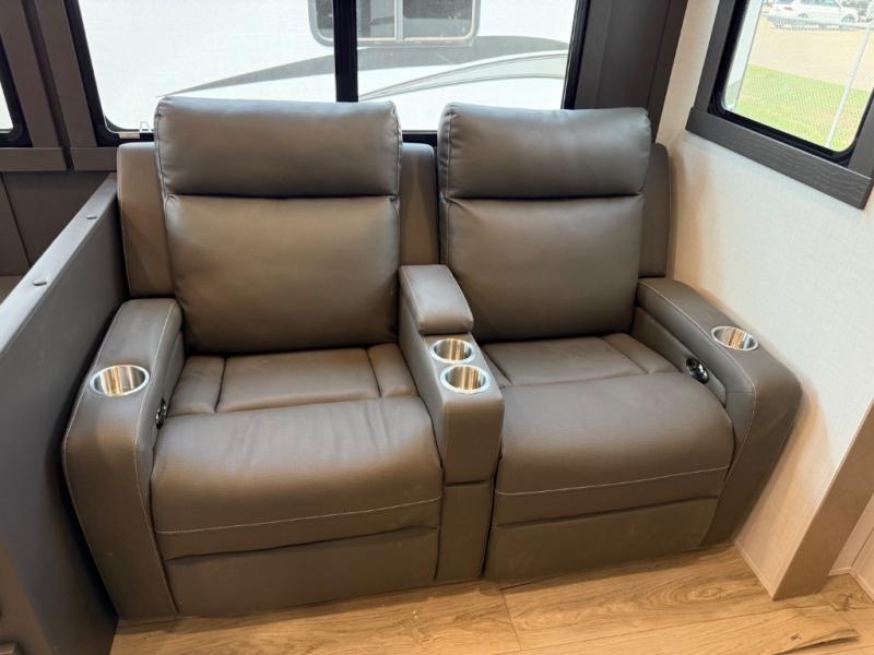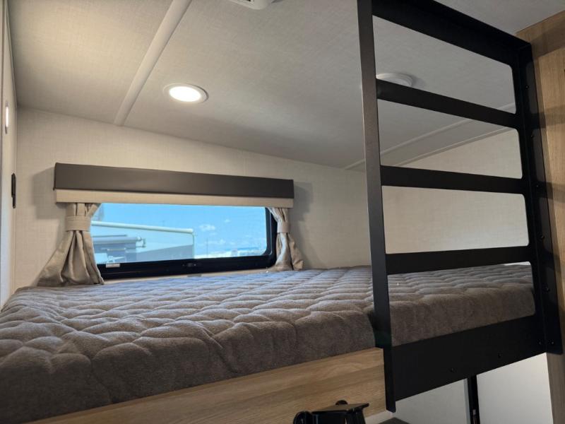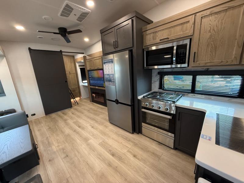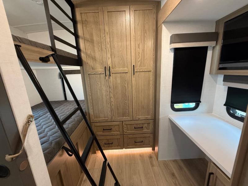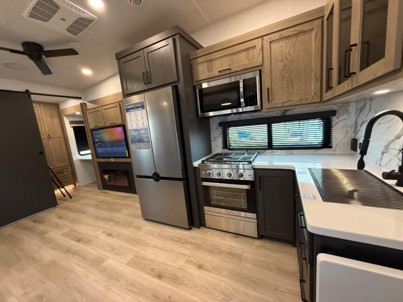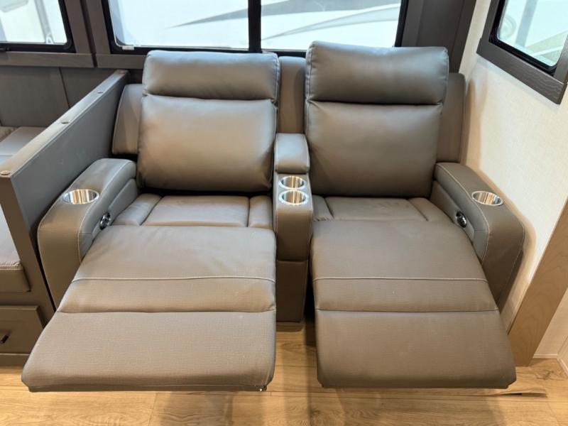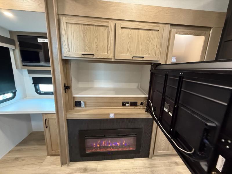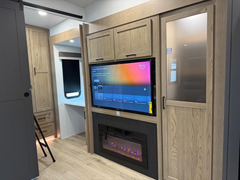 This is the perfect fifth wheel if you're camping with family or a group of friends. You'll have the front private bedroom with a king bed slide out all to yourselves, while your guests take the rear private bunkhouse. There is a 48" x 72" lower bunk with a 48" x 72" top bunk, a spacious wardrobe, and a desk with a chair within a slide out. This slide is also shared with the living room Smart TV and fireplace. Once breakfast has been made in the middle kitchen, you can dine at the 44" booth dinette, or just relax on the theater seat before heading out for the day. A full bath will be waiting for you when you return, and there are two power awnings outside so you can enjoy an evening under the LED lights!