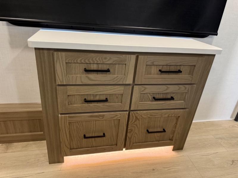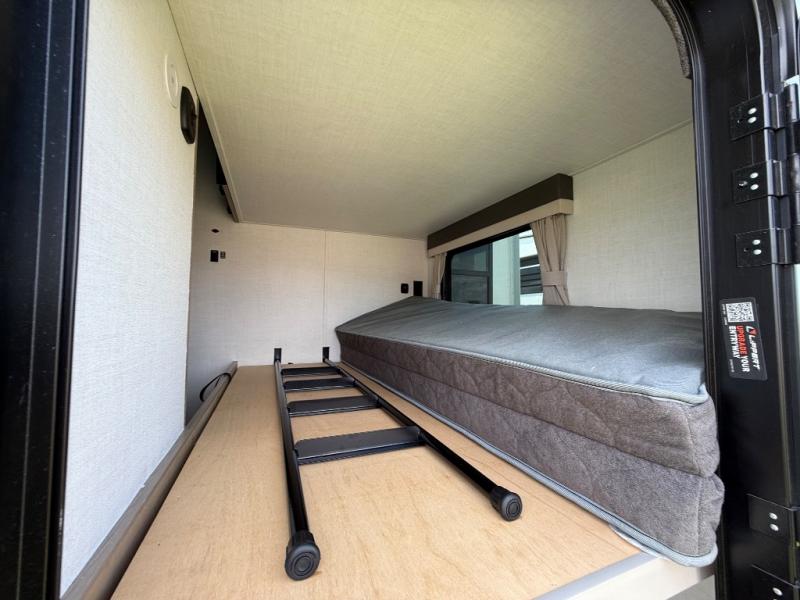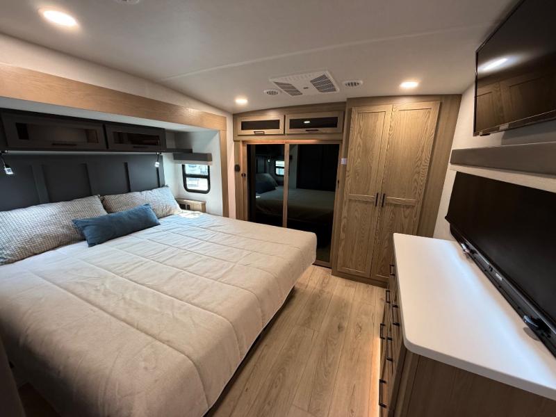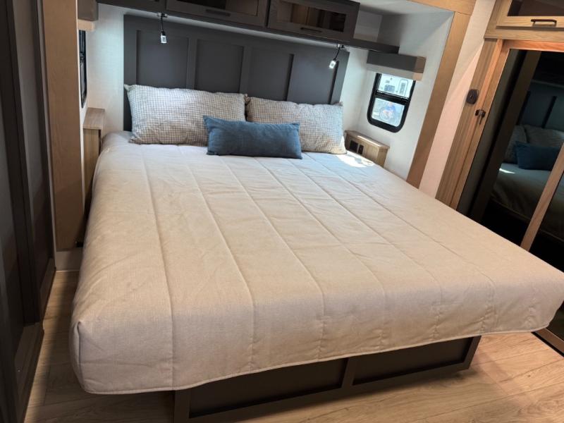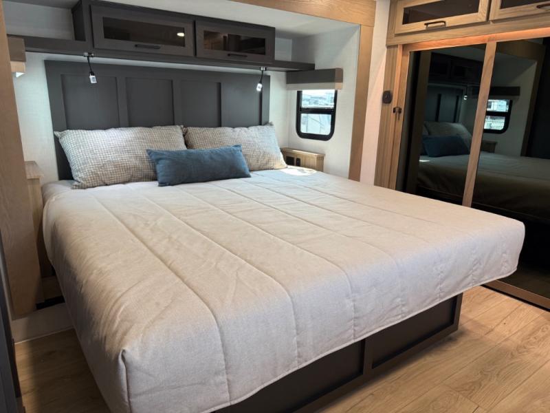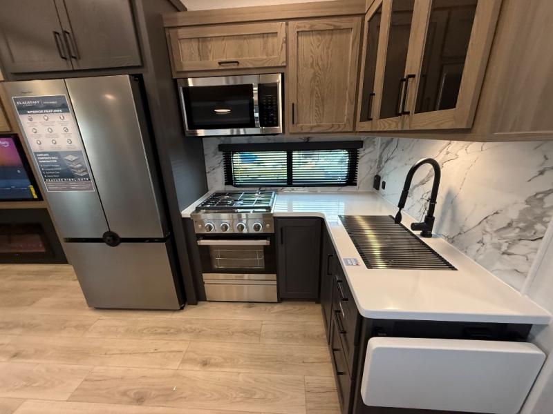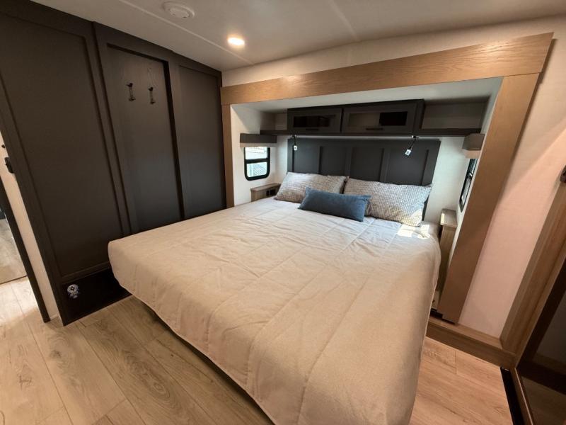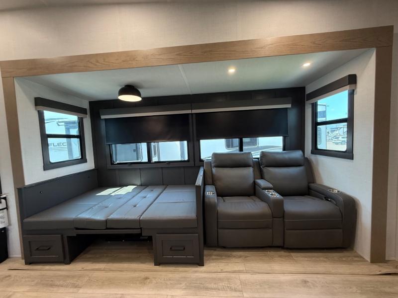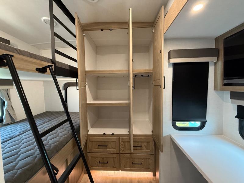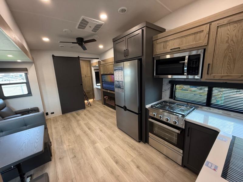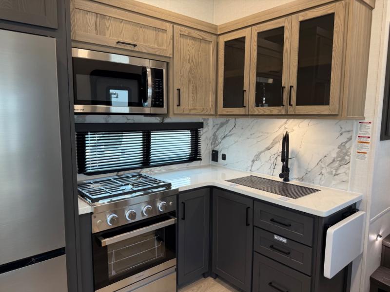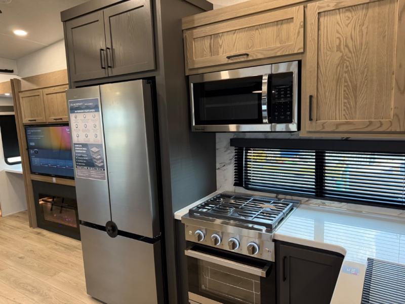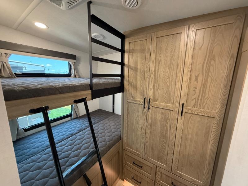 This is the perfect fifth wheel if you're camping with family or a group of friends. You'll have the front private bedroom with a king bed slide out all to yourselves, while your guests take the rear private bunkhouse. There is a 48" x 72" lower bunk with a 48" x 72" top bunk, a spacious wardrobe, and a desk with a chair within a slide out. This slide is also shared with the living room Smart TV and fireplace. Once breakfast has been made in the middle kitchen, you can dine at the 44" booth dinette, or just relax on the theater seat before heading out for the day. A full bath will be waiting for you when you return, and there are two power awnings outside so you can enjoy an evening under the LED lights!