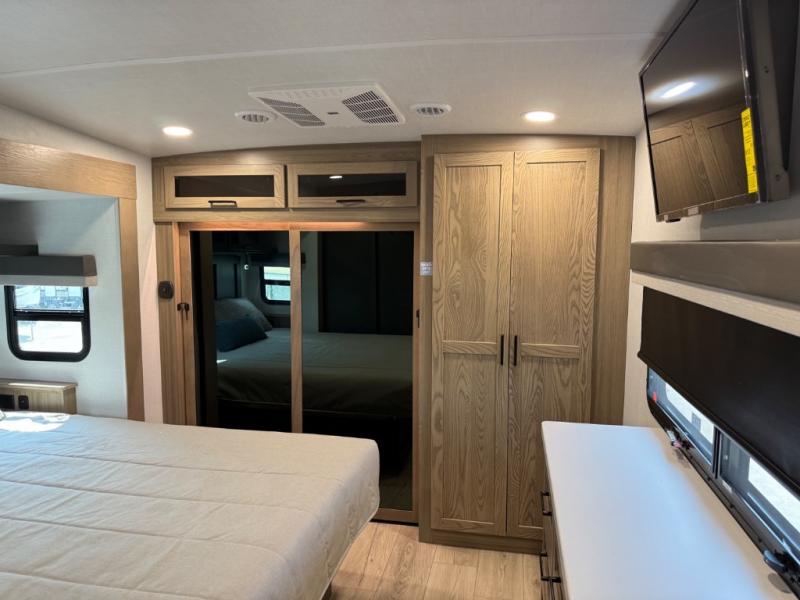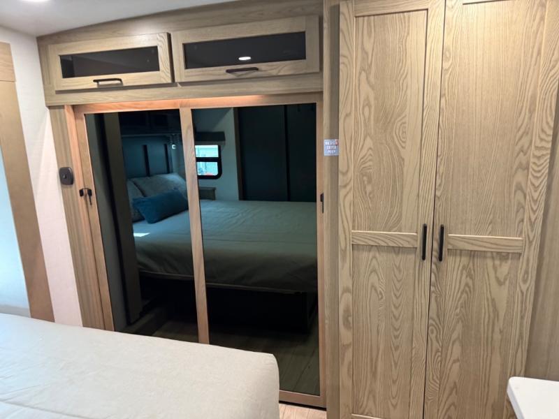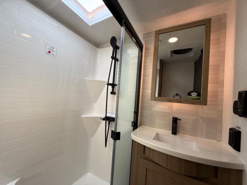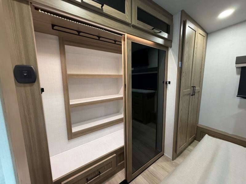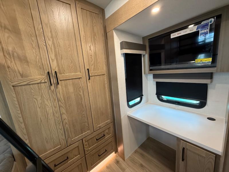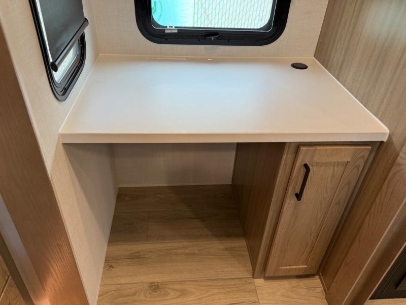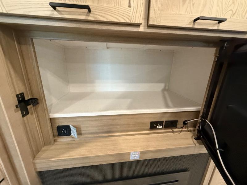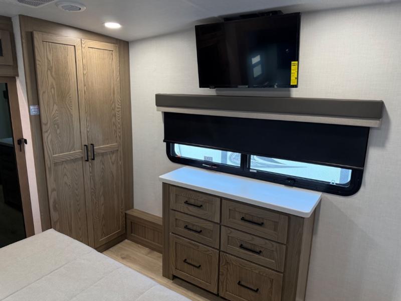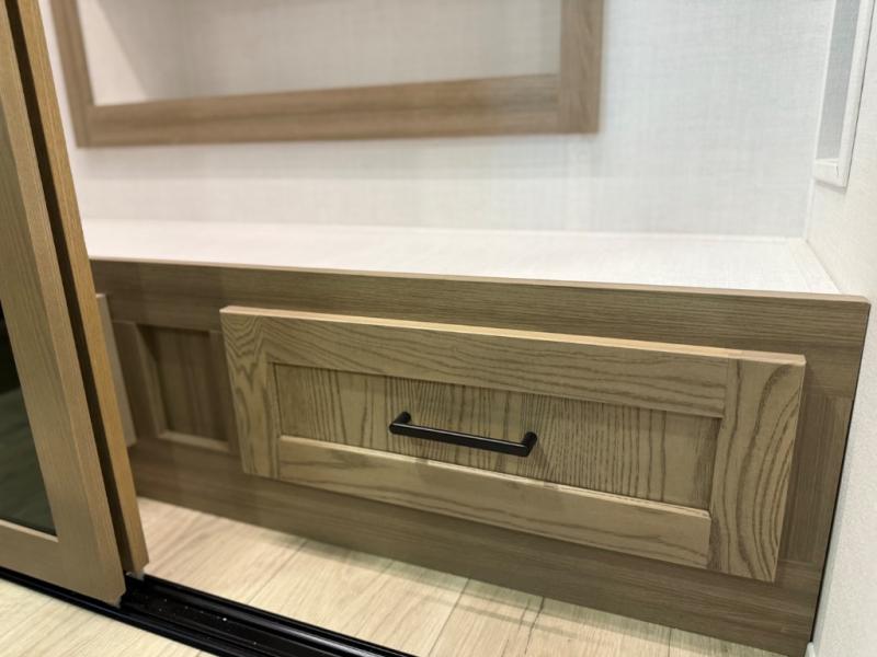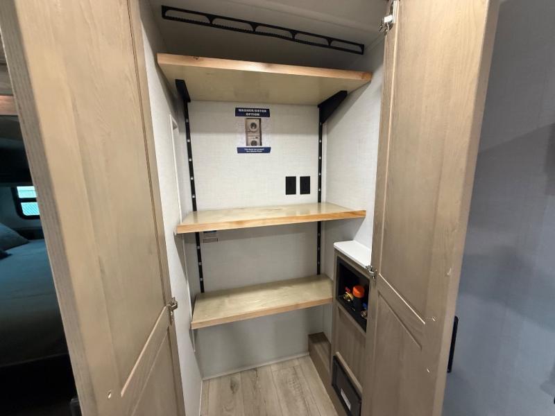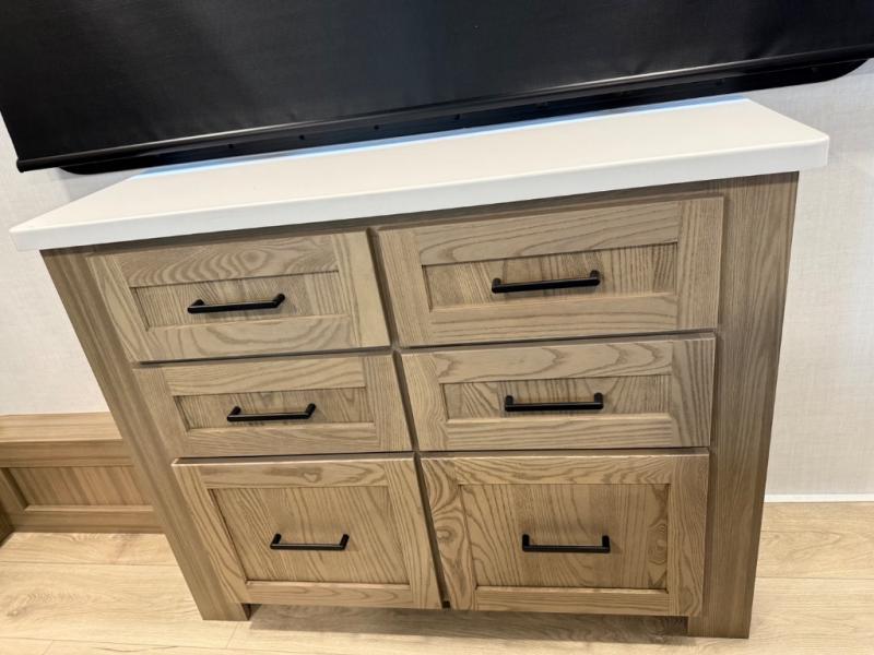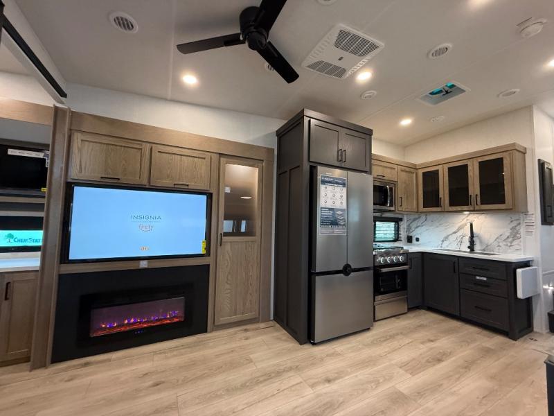 This is the perfect fifth wheel if you're camping with family or a group of friends. You'll have the front private bedroom with a king bed slide out all to yourselves, while your guests take the rear private bunkhouse. There is a 48" x 72" lower bunk with a 48" x 72" top bunk, a spacious wardrobe, and a desk with a chair within a slide out. This slide is also shared with the living room Smart TV and fireplace. Once breakfast has been made in the middle kitchen, you can dine at the 44" booth dinette, or just relax on the theater seat before heading out for the day. A full bath will be waiting for you when you return, and there are two power awnings outside so you can enjoy an evening under the LED lights!