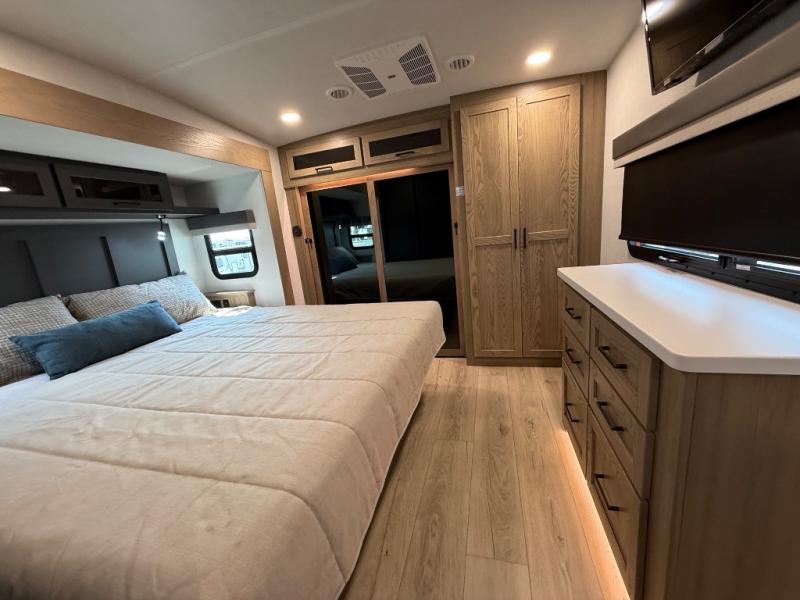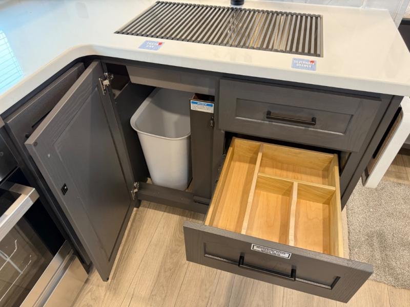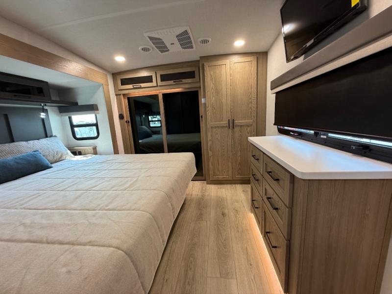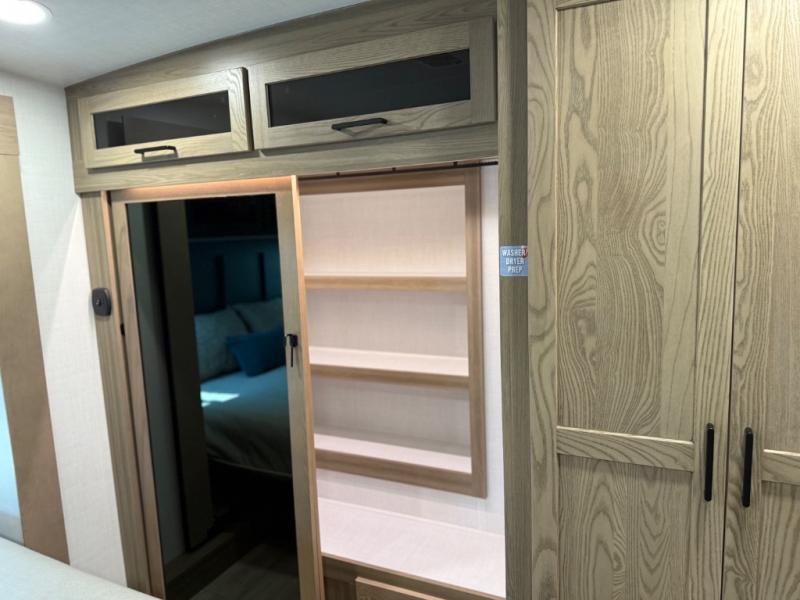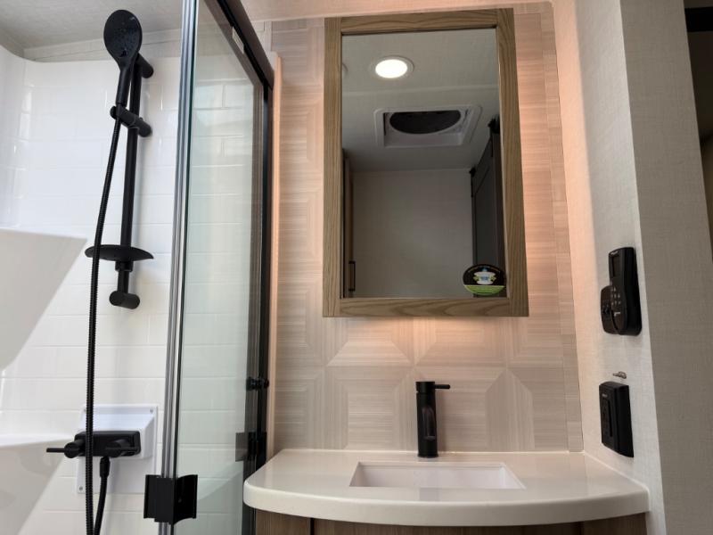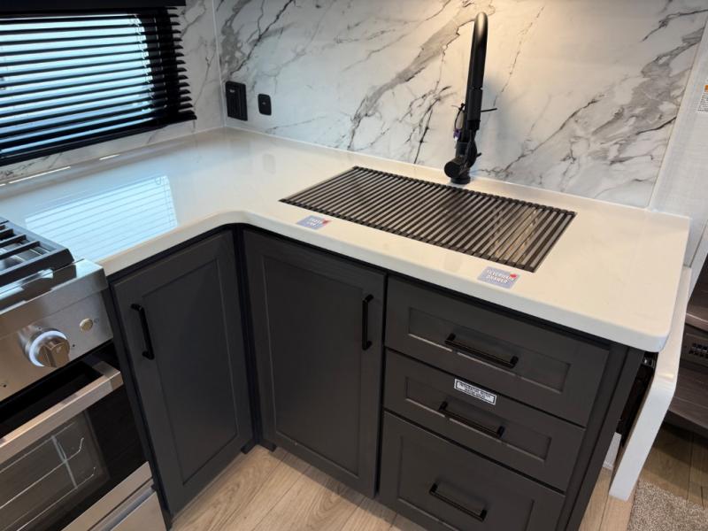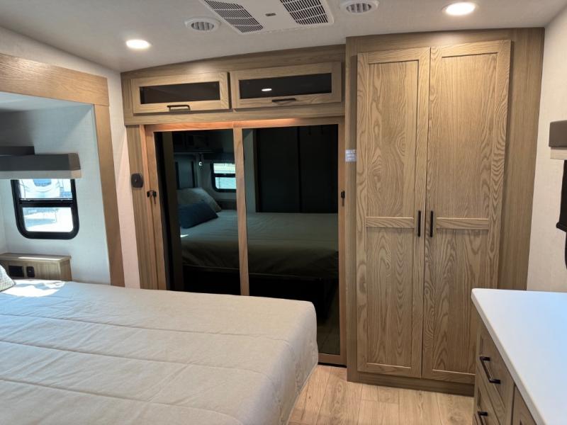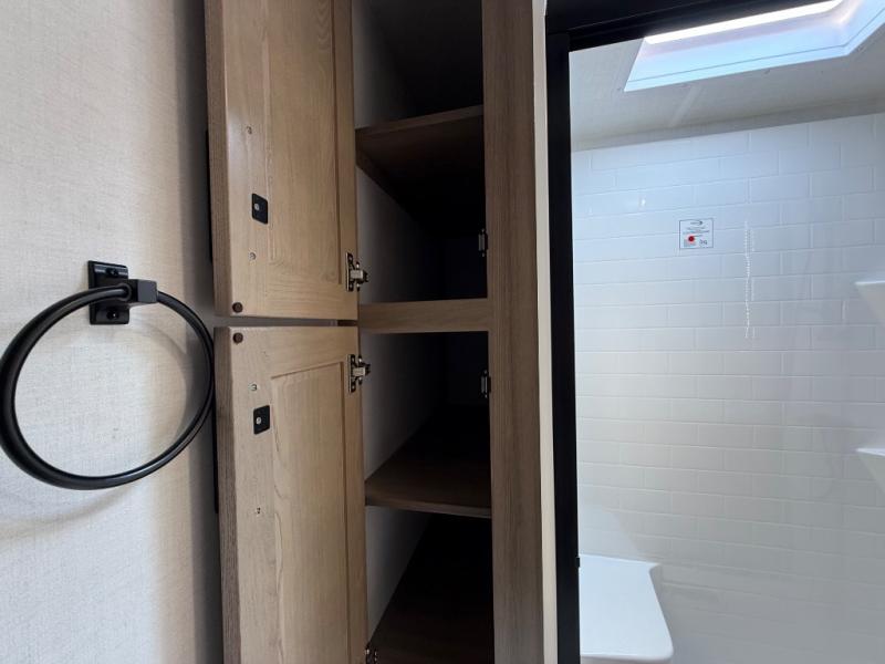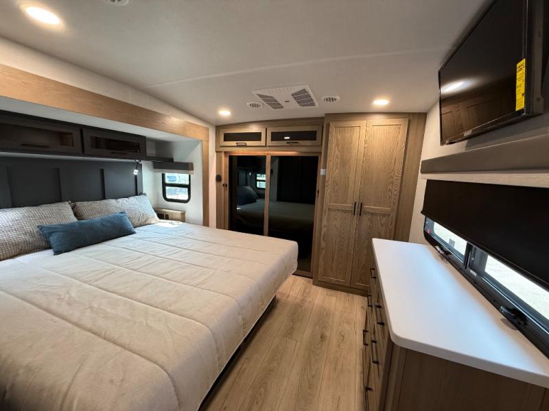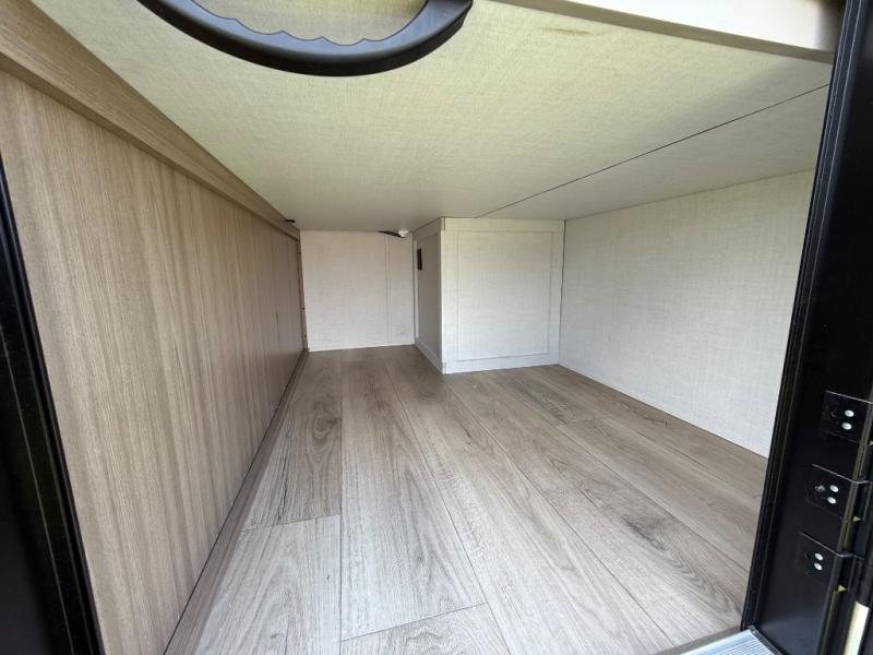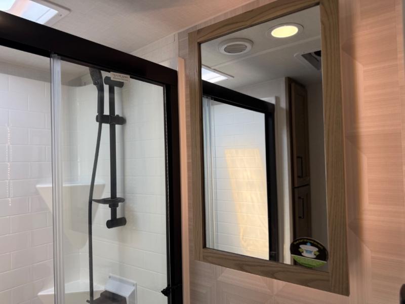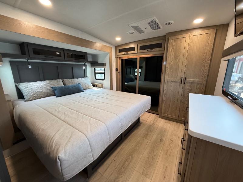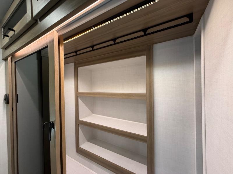 This is the perfect fifth wheel if you're camping with family or a group of friends. You'll have the front private bedroom with a king bed slide out all to yourselves, while your guests take the rear private bunkhouse. There is a 48" x 72" lower bunk with a 48" x 72" top bunk, a spacious wardrobe, and a desk with a chair within a slide out. This slide is also shared with the living room Smart TV and fireplace. Once breakfast has been made in the middle kitchen, you can dine at the 44" booth dinette, or just relax on the theater seat before heading out for the day. A full bath will be waiting for you when you return, and there are two power awnings outside so you can enjoy an evening under the LED lights!