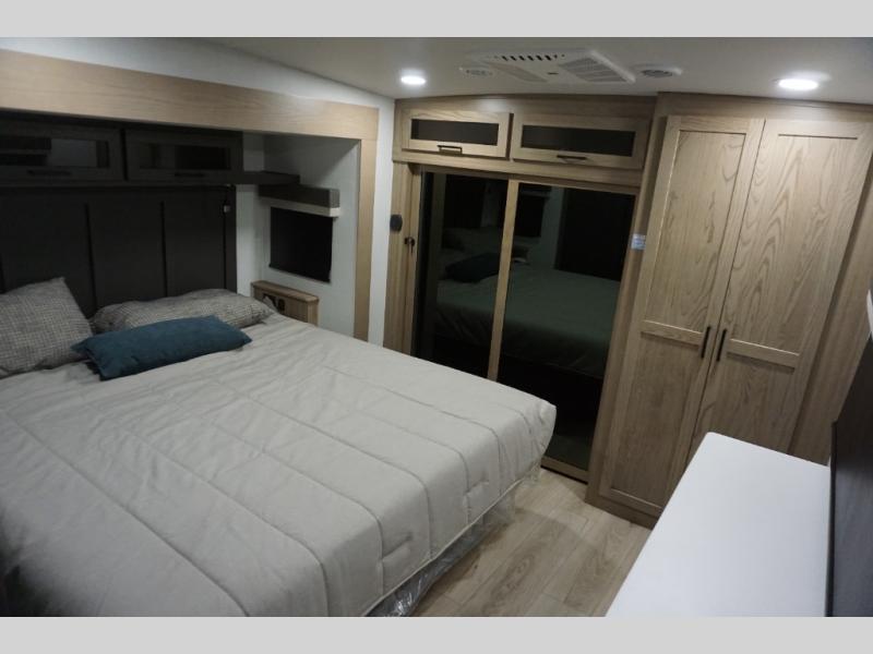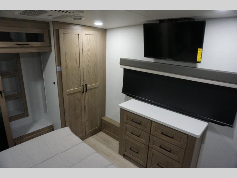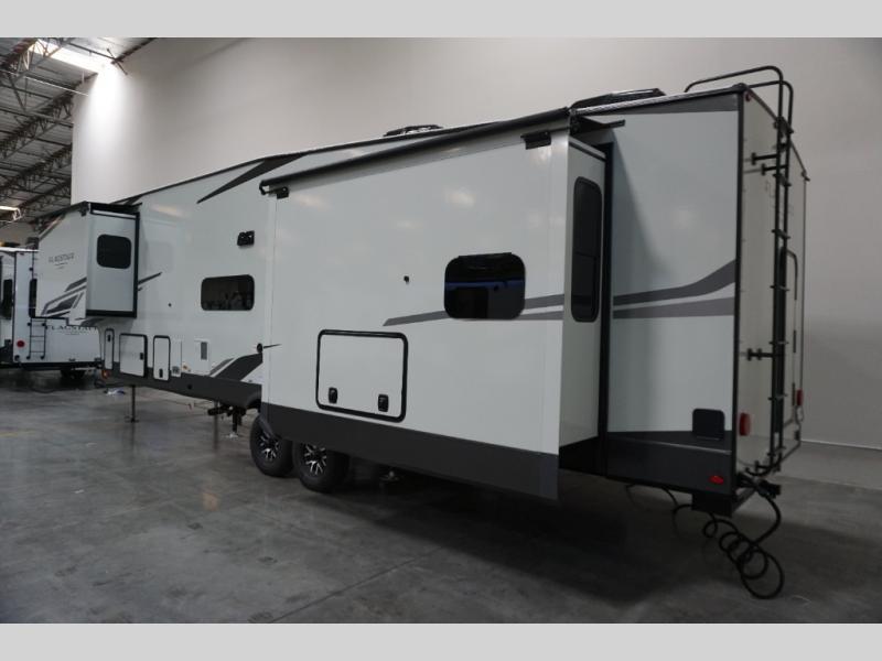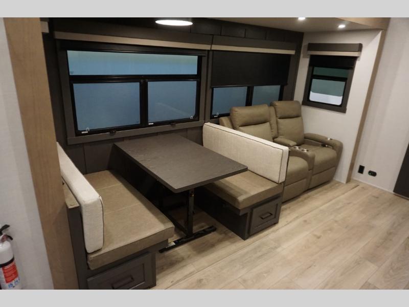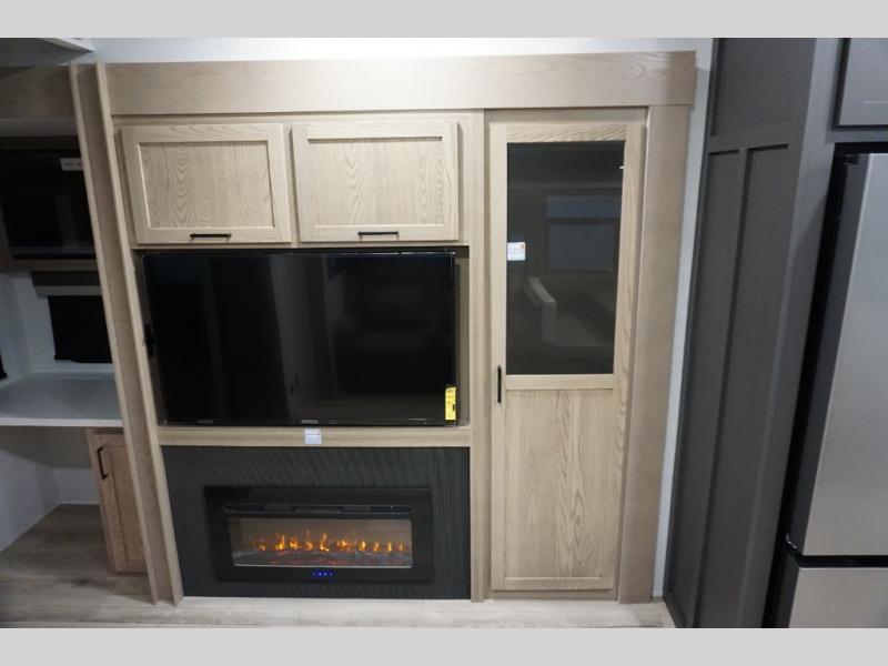 This is the perfect fifth wheel if you're camping with family or a group of friends. You'll have the front private bedroom with a king bed slide out all to yourselves, while your guests take the rear private bunkhouse. There is a 48" x 72" lower bunk with a 48" x 72" top bunk, a spacious wardrobe, and a desk with a chair within a slide out. This slide is also shared with the living room Smart TV and fireplace. Once breakfast has been made in the middle kitchen, you can dine at the 44" booth dinette, or just relax on the theater seat before heading out for the day. A full bath will be waiting for you when you return, and there are two power awnings outside so you can enjoy an evening under the LED lights!