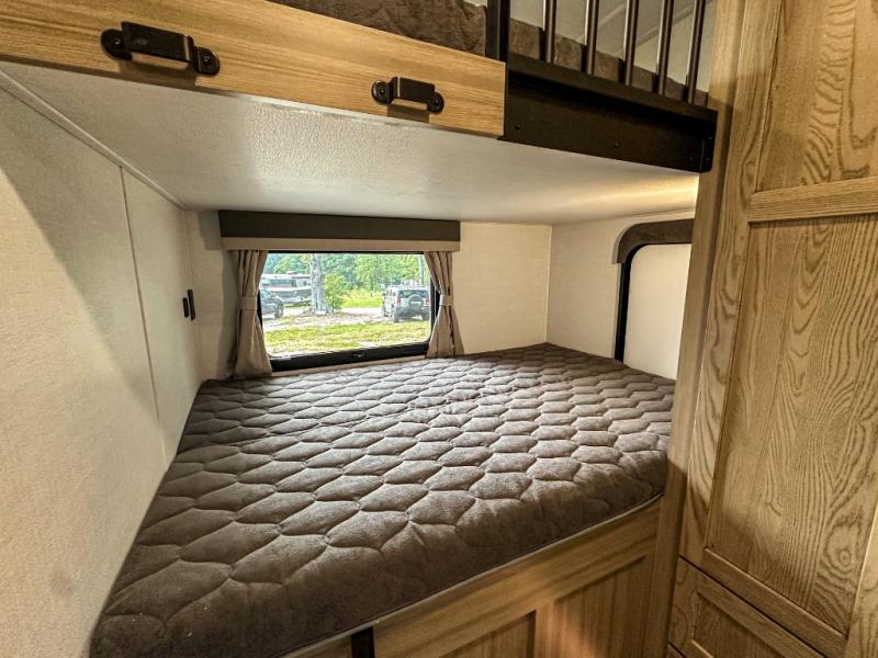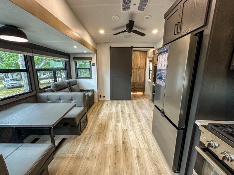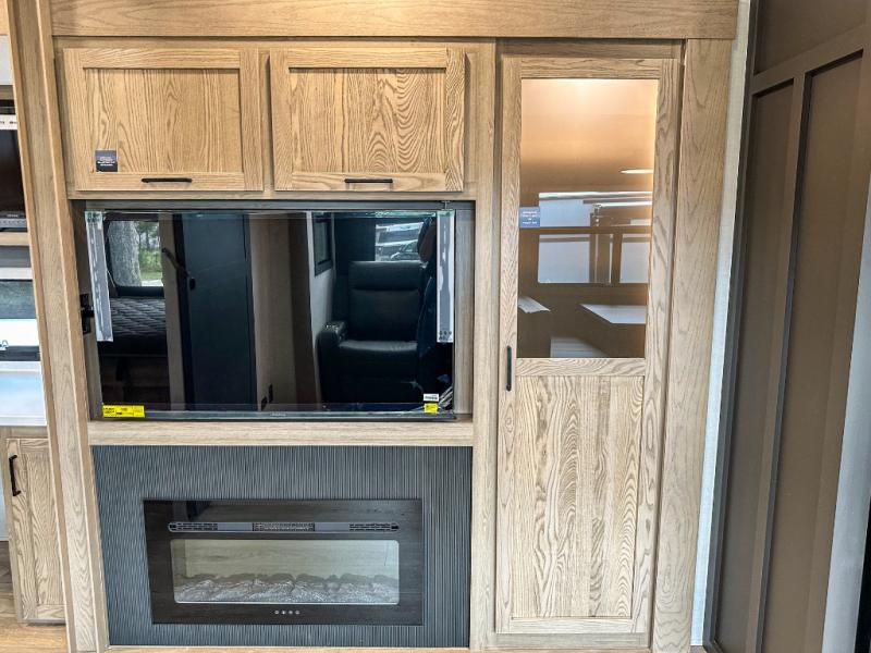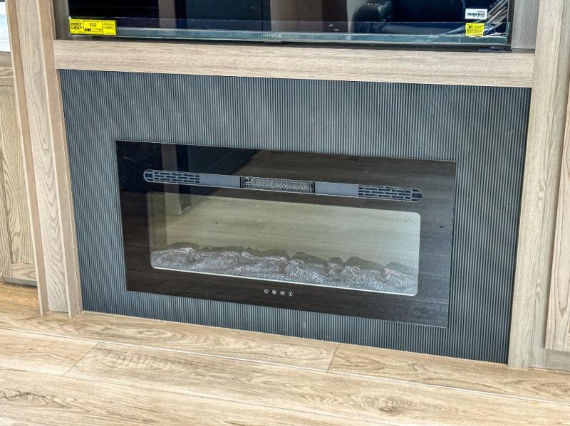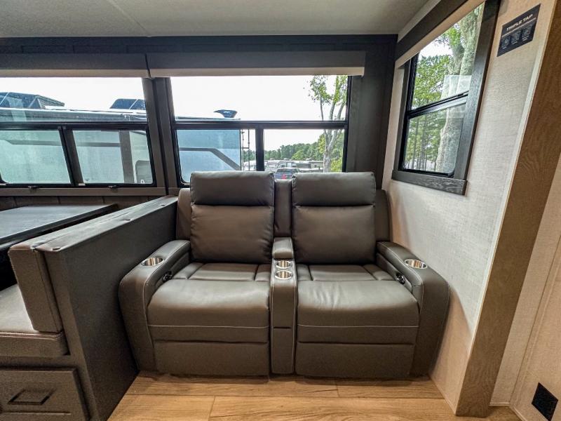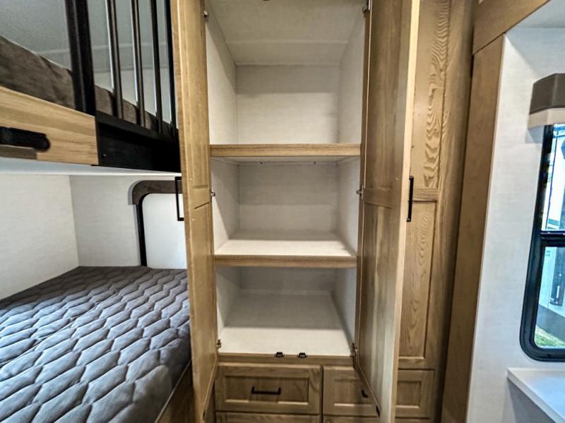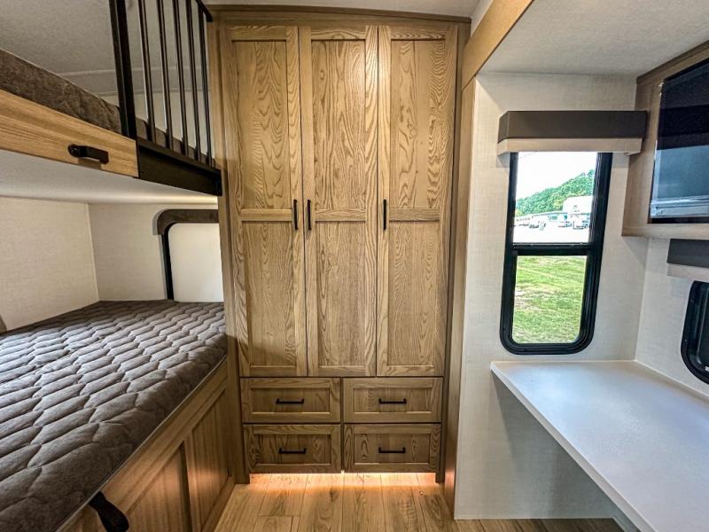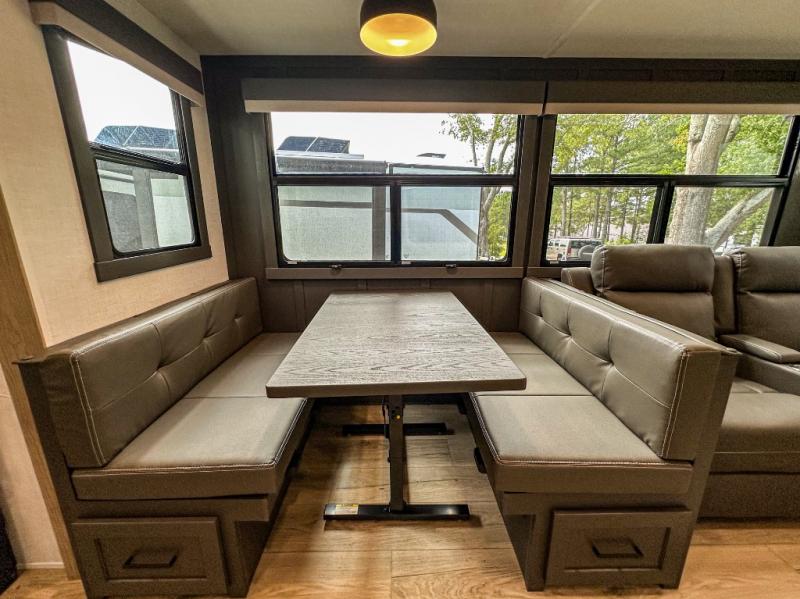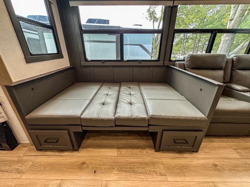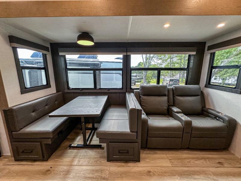 This is the perfect fifth wheel if you're camping with family or a group of friends. You'll have the front private bedroom with a king bed slide out all to yourselves, while your guests take the rear private bunkhouse. There is a 48" x 72" lower bunk with a 48" x 72" top bunk, a spacious wardrobe, and a desk with a chair within a slide out. This slide is also shared with the living room Smart TV and fireplace. Once breakfast has been made in the middle kitchen, you can dine at the 44" booth dinette, or just relax on the theater seat before heading out for the day. A full bath will be waiting for you when you return, and there are two power awnings outside so you can enjoy an evening under the LED lights!