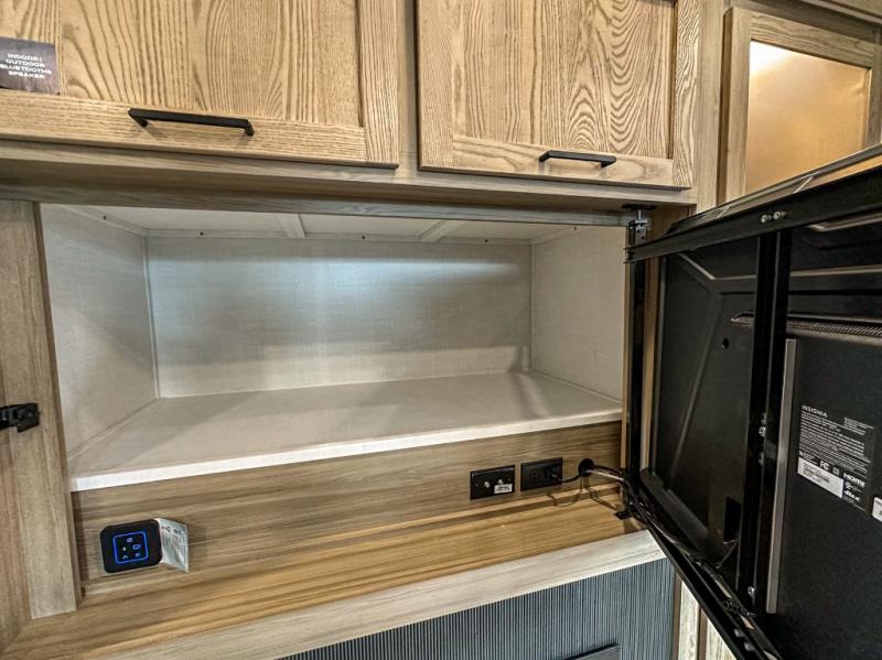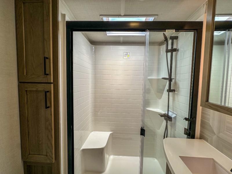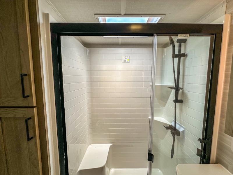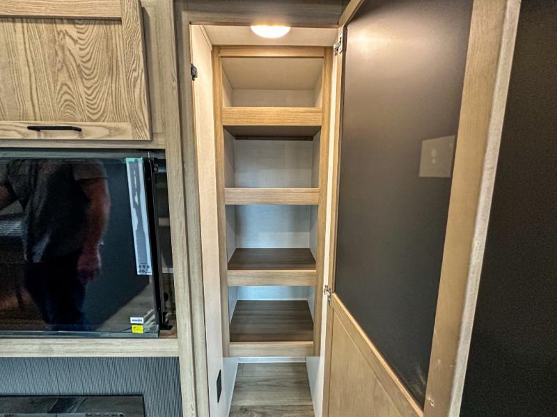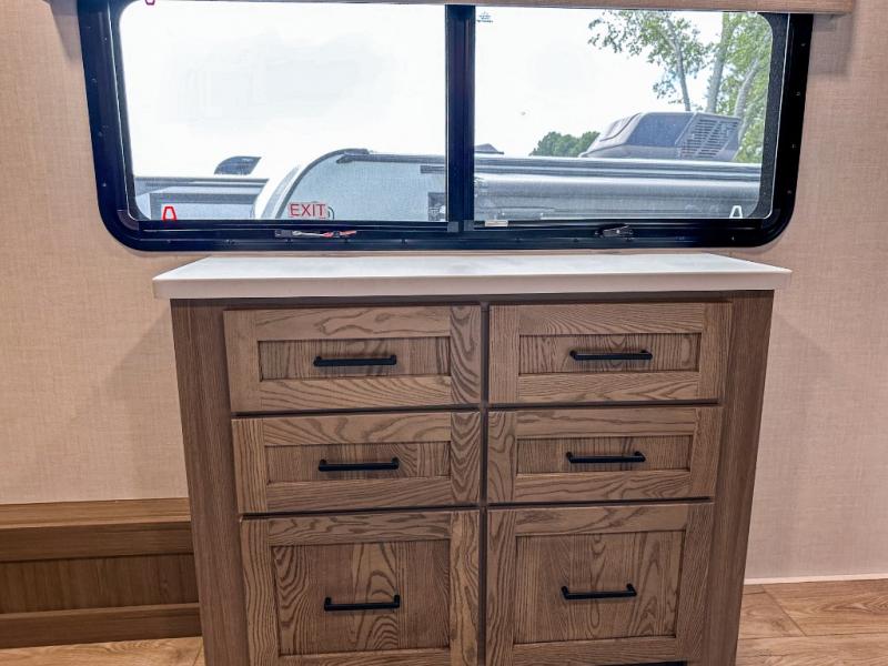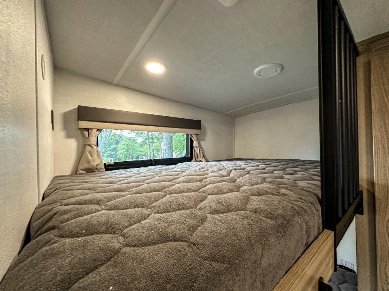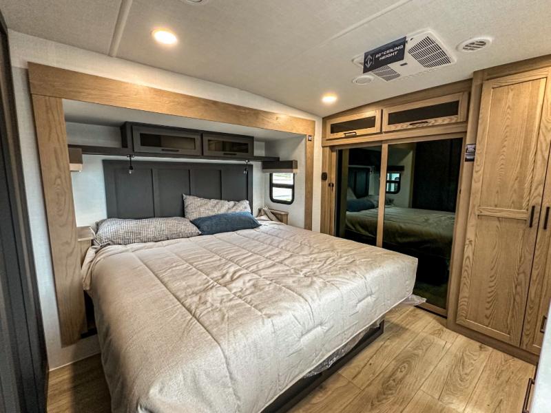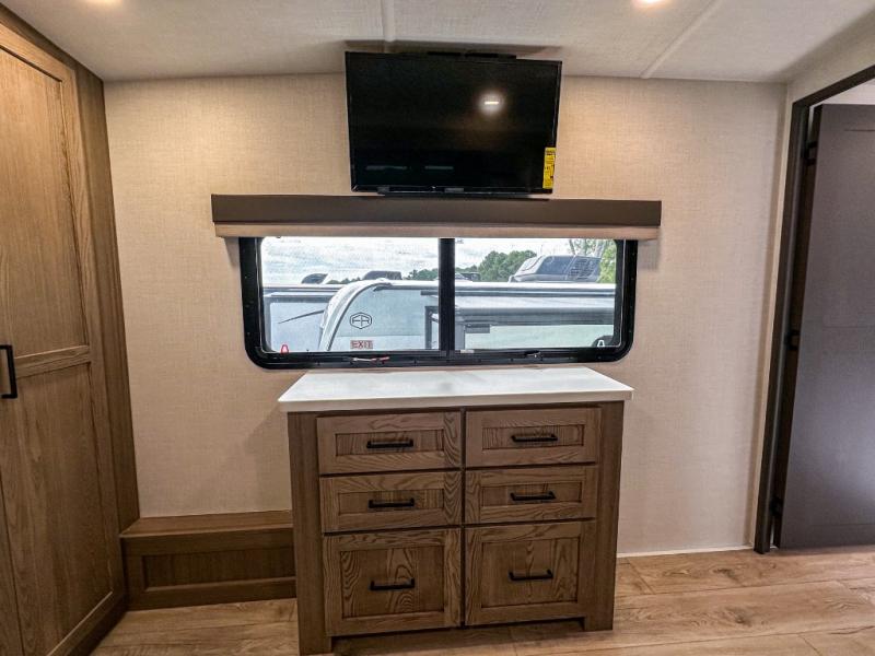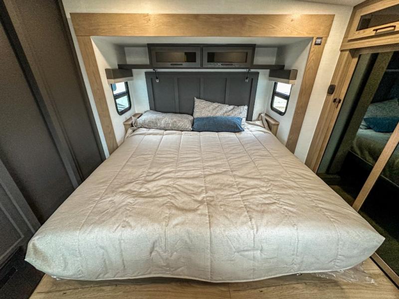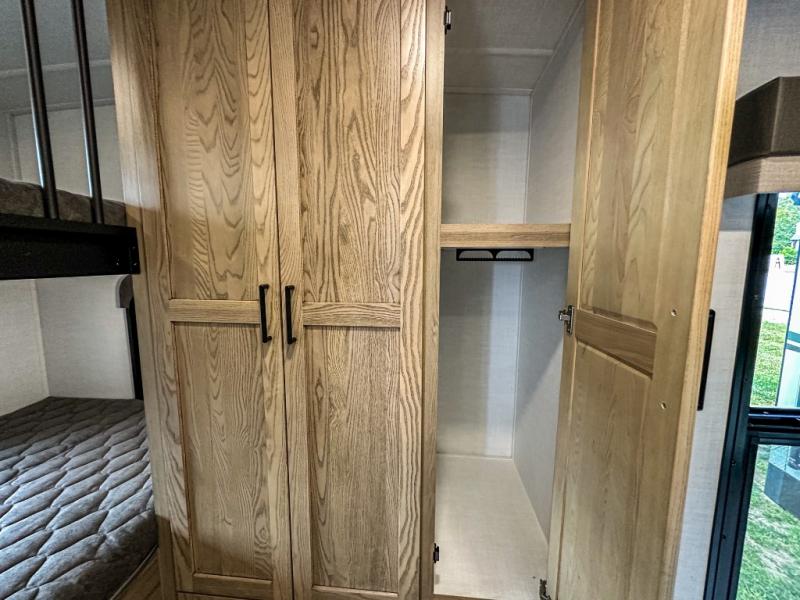 This is the perfect fifth wheel if you're camping with family or a group of friends. You'll have the front private bedroom with a king bed slide out all to yourselves, while your guests take the rear private bunkhouse. There is a 48" x 72" lower bunk with a 48" x 72" top bunk, a spacious wardrobe, and a desk with a chair within a slide out. This slide is also shared with the living room Smart TV and fireplace. Once breakfast has been made in the middle kitchen, you can dine at the 44" booth dinette, or just relax on the theater seat before heading out for the day. A full bath will be waiting for you when you return, and there are two power awnings outside so you can enjoy an evening under the LED lights!
