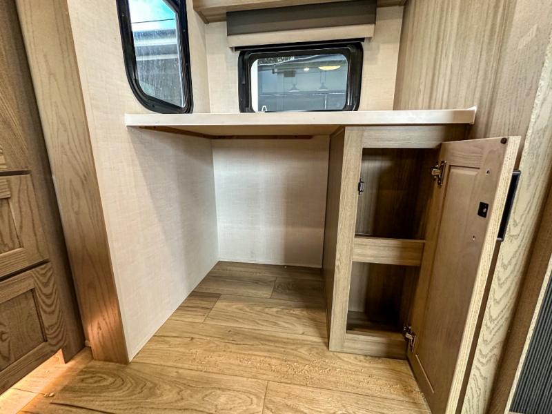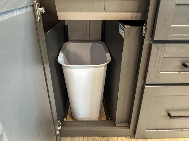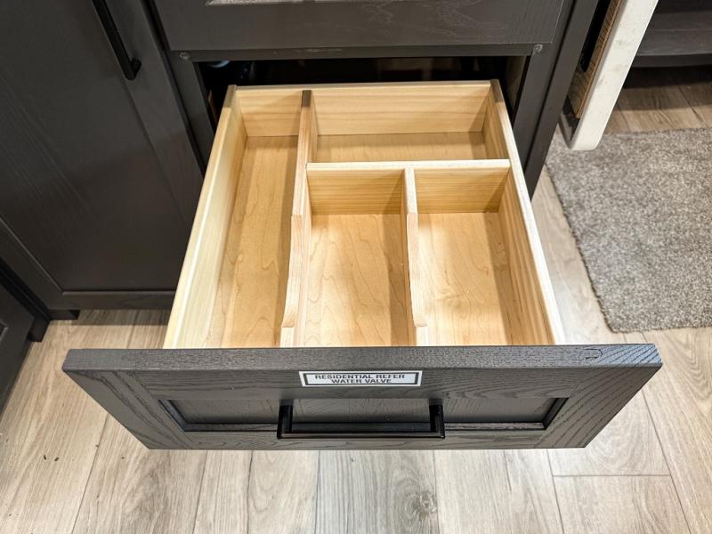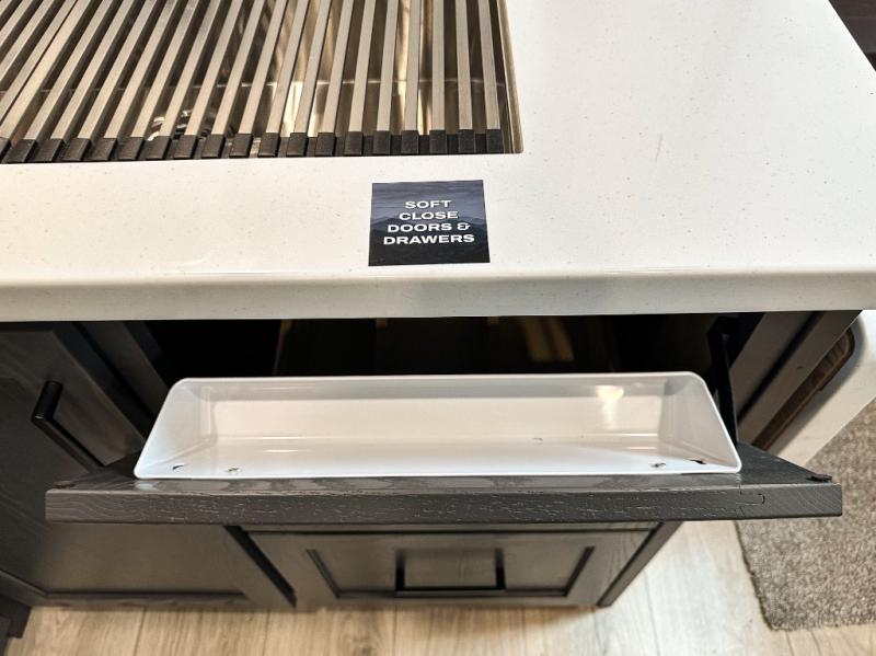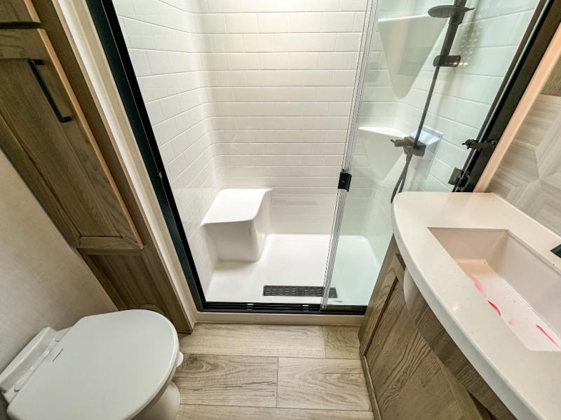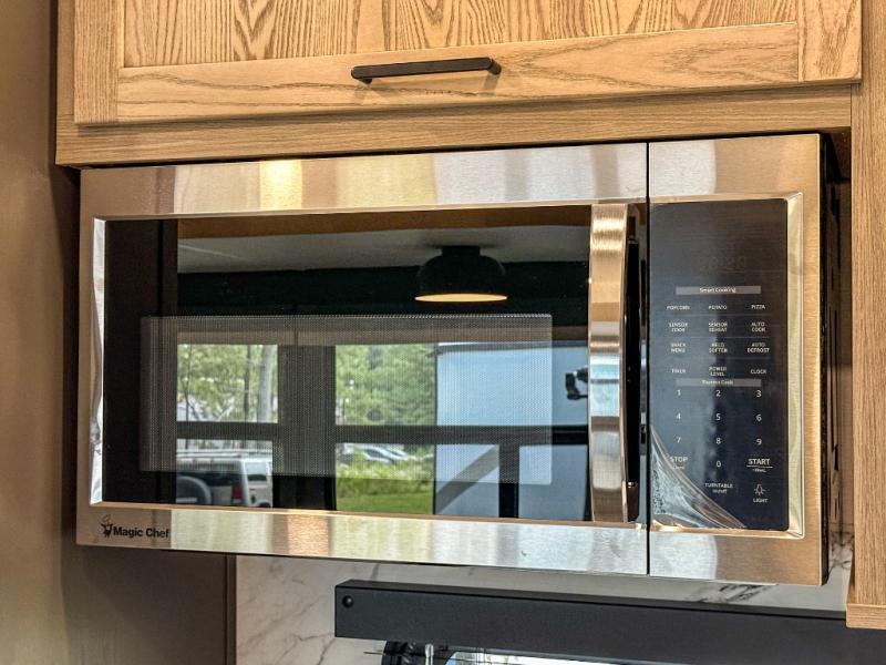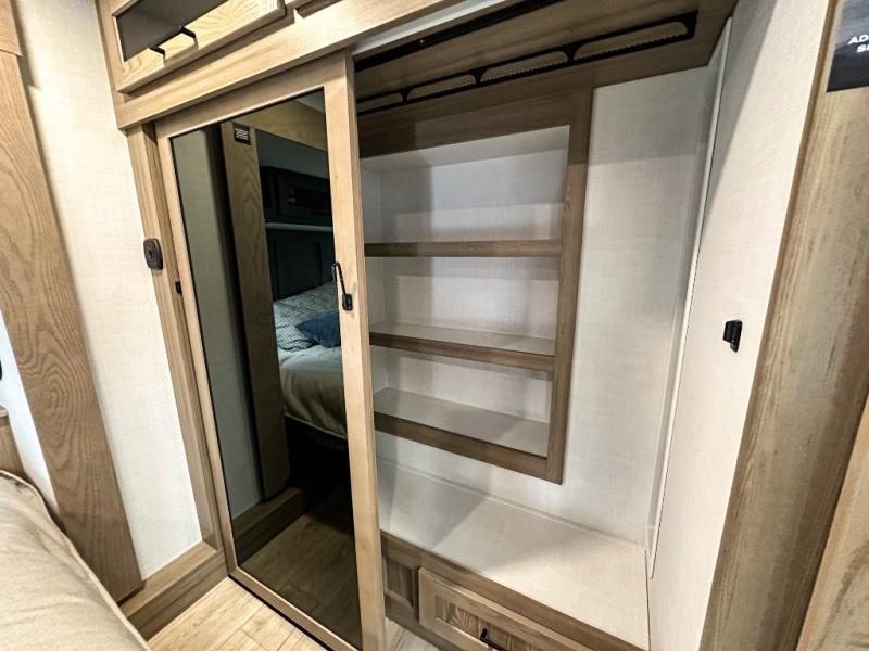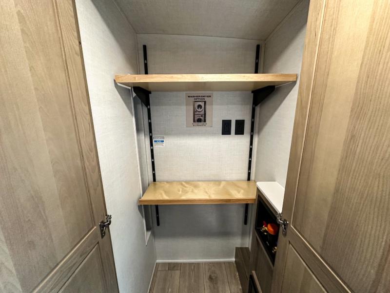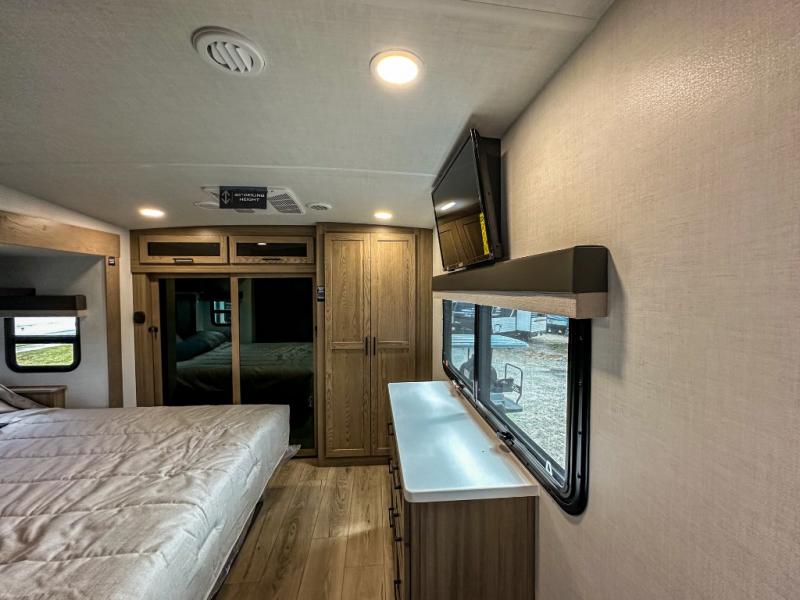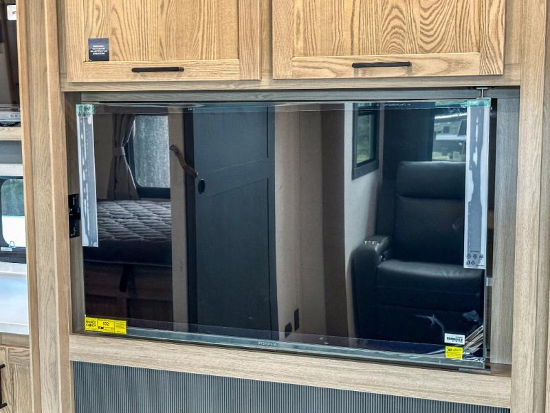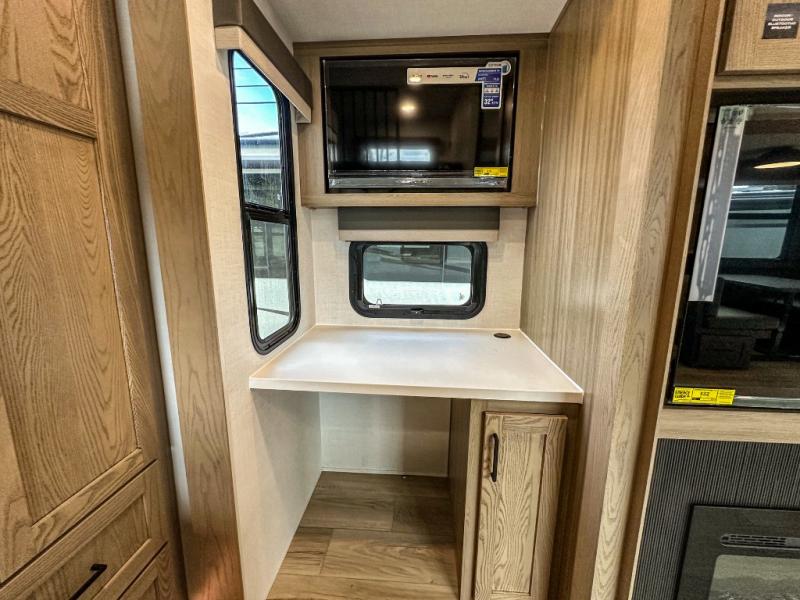 This is the perfect fifth wheel if you're camping with family or a group of friends. You'll have the front private bedroom with a king bed slide out all to yourselves, while your guests take the rear private bunkhouse. There is a 48" x 72" lower bunk with a 48" x 72" top bunk, a spacious wardrobe, and a desk with a chair within a slide out. This slide is also shared with the living room Smart TV and fireplace. Once breakfast has been made in the middle kitchen, you can dine at the 44" booth dinette, or just relax on the theater seat before heading out for the day. A full bath will be waiting for you when you return, and there are two power awnings outside so you can enjoy an evening under the LED lights!
