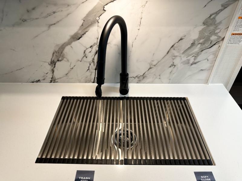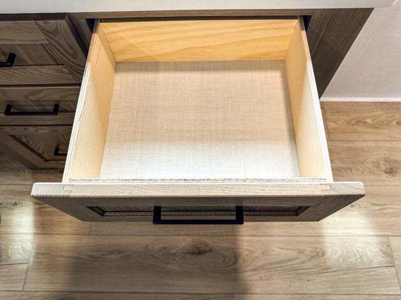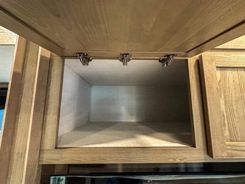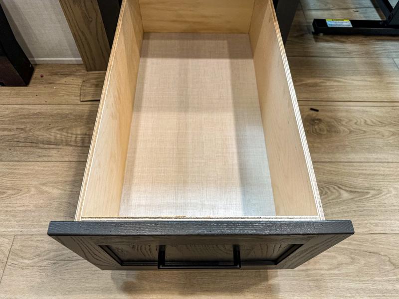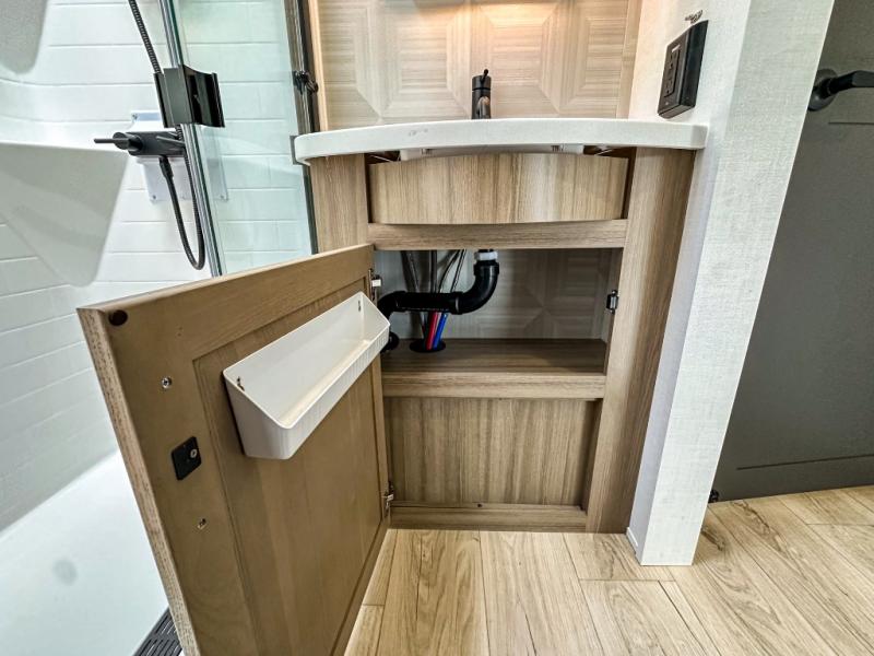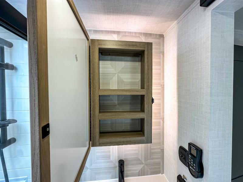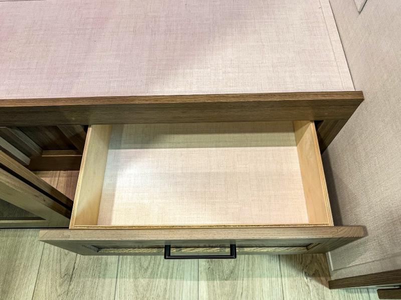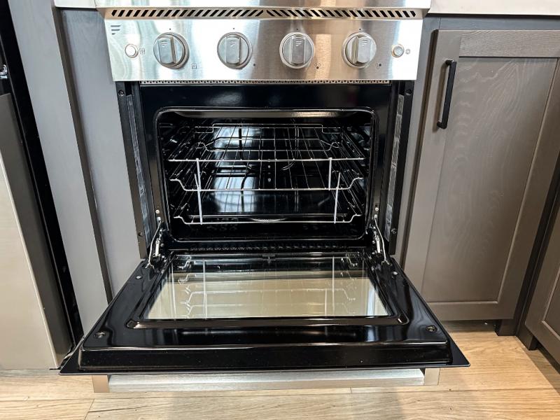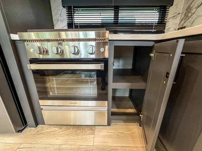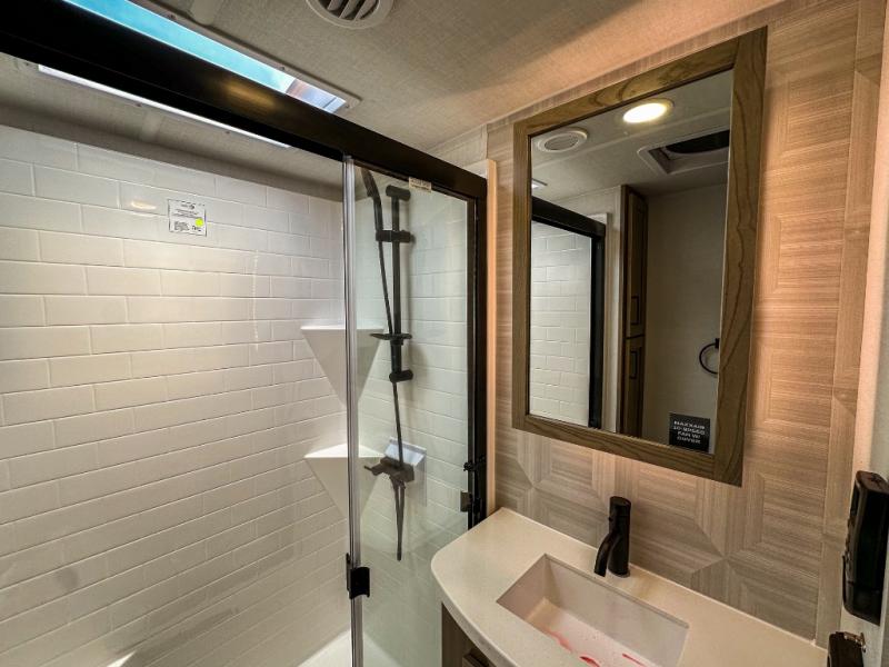 This is the perfect fifth wheel if you're camping with family or a group of friends. You'll have the front private bedroom with a king bed slide out all to yourselves, while your guests take the rear private bunkhouse. There is a 48" x 72" lower bunk with a 48" x 72" top bunk, a spacious wardrobe, and a desk with a chair within a slide out. This slide is also shared with the living room Smart TV and fireplace. Once breakfast has been made in the middle kitchen, you can dine at the 44" booth dinette, or just relax on the theater seat before heading out for the day. A full bath will be waiting for you when you return, and there are two power awnings outside so you can enjoy an evening under the LED lights!