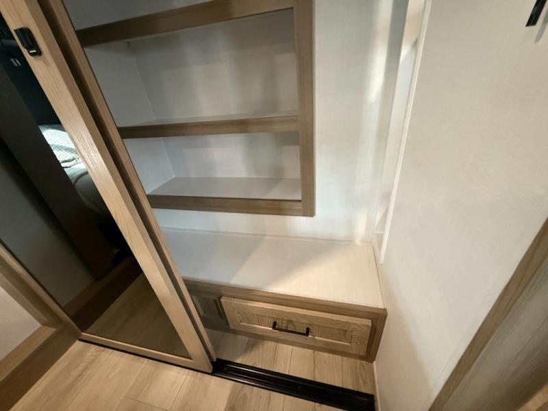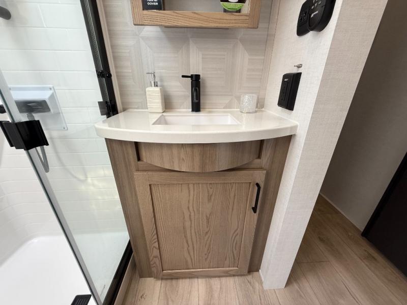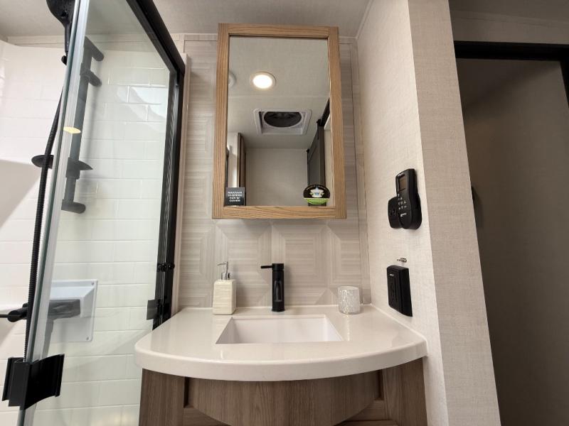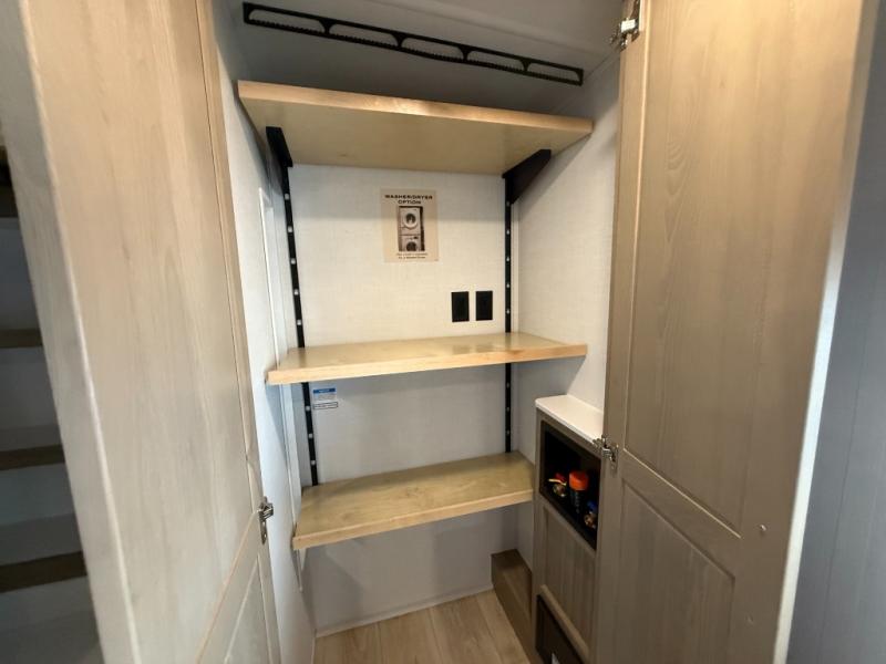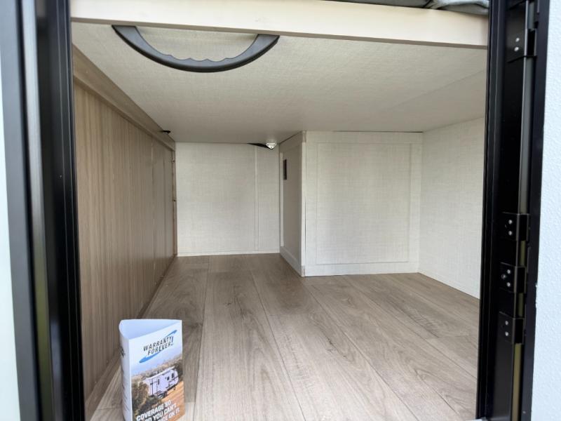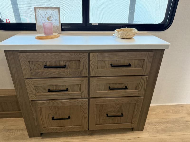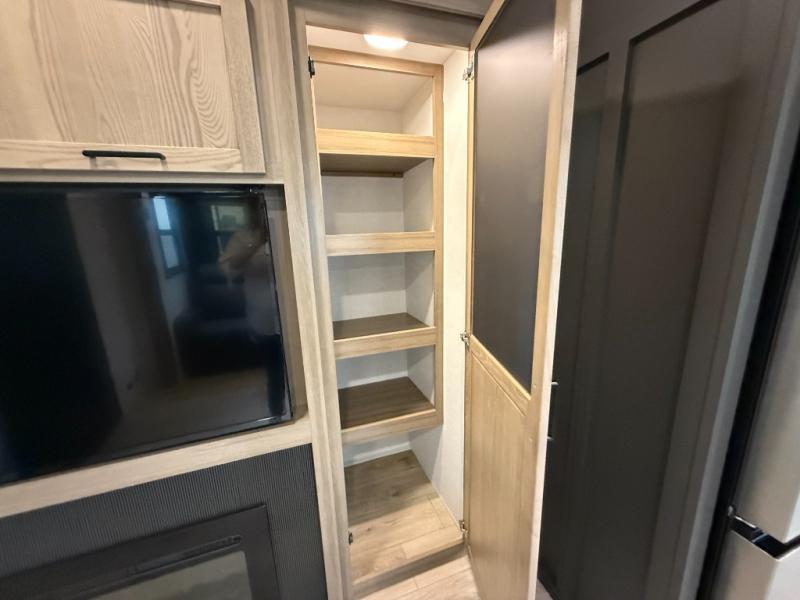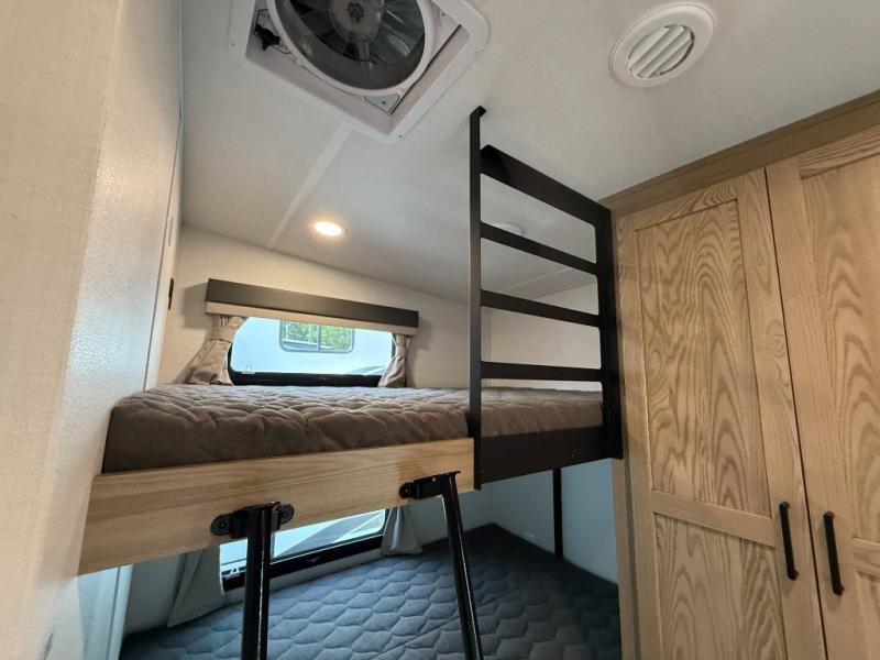 This is the perfect fifth wheel if you're camping with family or a group of friends. You'll have the front private bedroom with a king bed slide out all to yourselves, while your guests take the rear private bunkhouse. There is a 48" x 72" lower bunk with a 48" x 72" top bunk, a spacious wardrobe, and a desk with a chair within a slide out. This slide is also shared with the living room Smart TV and fireplace. Once breakfast has been made in the middle kitchen, you can dine at the 44" booth dinette, or just relax on the theater seat before heading out for the day. A full bath will be waiting for you when you return, and there are two power awnings outside so you can enjoy an evening under the LED lights!
