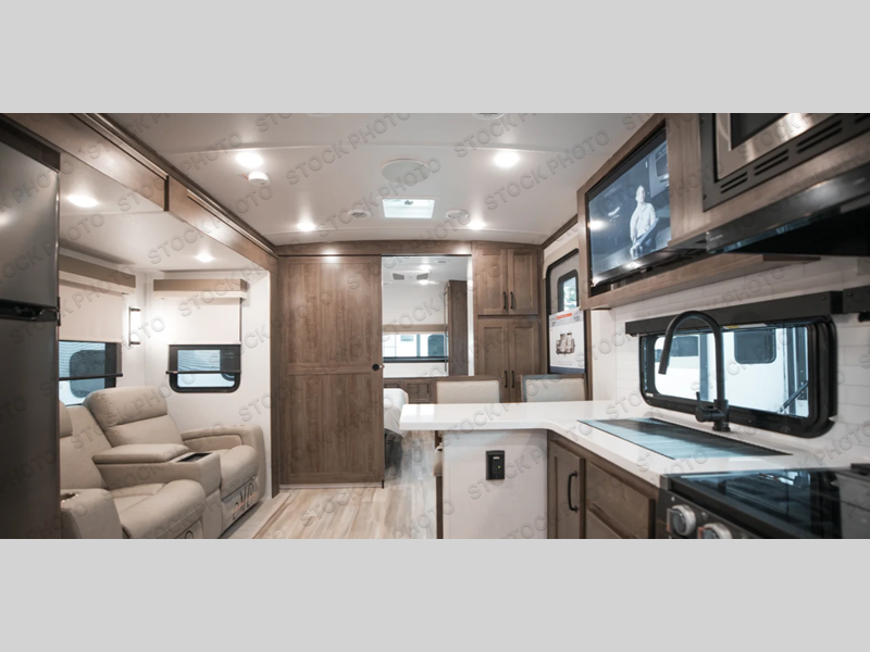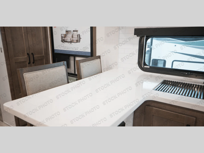 This travel trailer is the perfect couples coach to get away featuring dual slides for added interior space. The main entry leads into a combined kitchen and living room providing an L-shaped counter with two-person bar top seating! This is a great place to enjoy your meals and morning coffee inside. Your nights will be spent in true relaxation with the 67" theater seating to watch TV, and a king bed slide in the front bedroom for a great night's rest. The full rear bathroom features a shower with a seat plus linen storage for clean towels. You can also choose to cook outdoors when you have an outside kitchen with a pull-out griddle, plus a 22' awning. This creates a nice outdoor living area that is perfect both day and night!