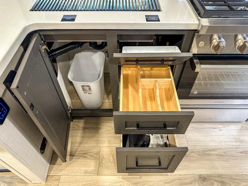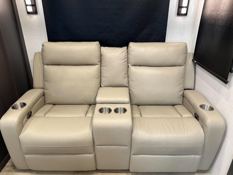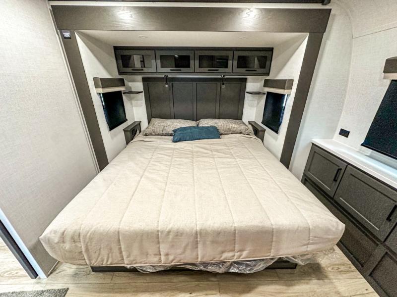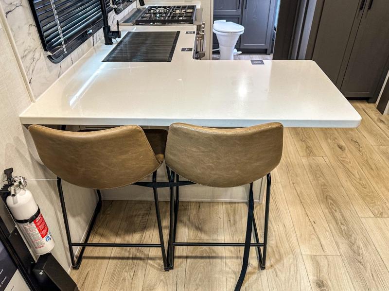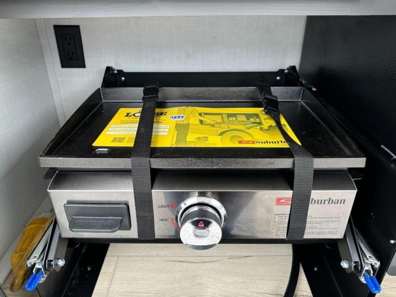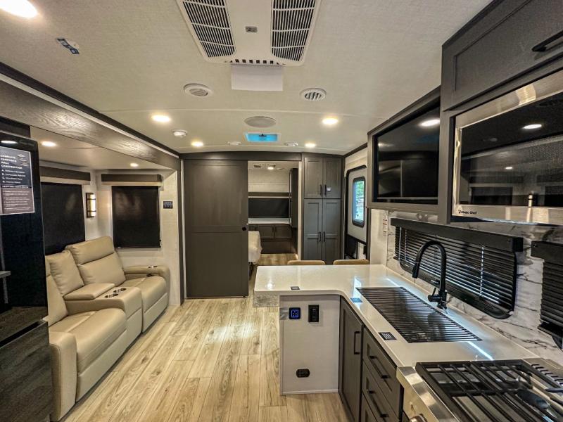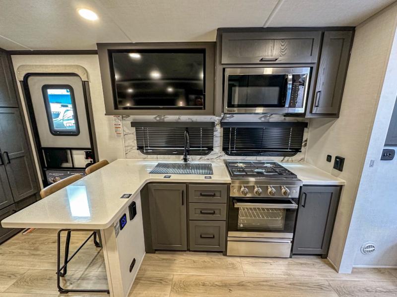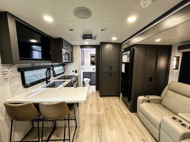 This travel trailer is the perfect couples coach to get away featuring dual slides for added interior space. The main entry leads into a combined kitchen and living room providing an L-shaped counter with two-person bar top seating! This is a great place to enjoy your meals and morning coffee inside. Your nights will be spent in true relaxation with the 67" theater seating to watch TV, and a king bed slide in the front bedroom for a great night's rest. The full rear bathroom features a shower with a seat plus linen storage for clean towels. You can also choose to cook outdoors when you have an outside kitchen with a pull-out griddle, plus a 22' awning. This creates a nice outdoor living area that is perfect both day and night!