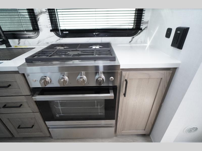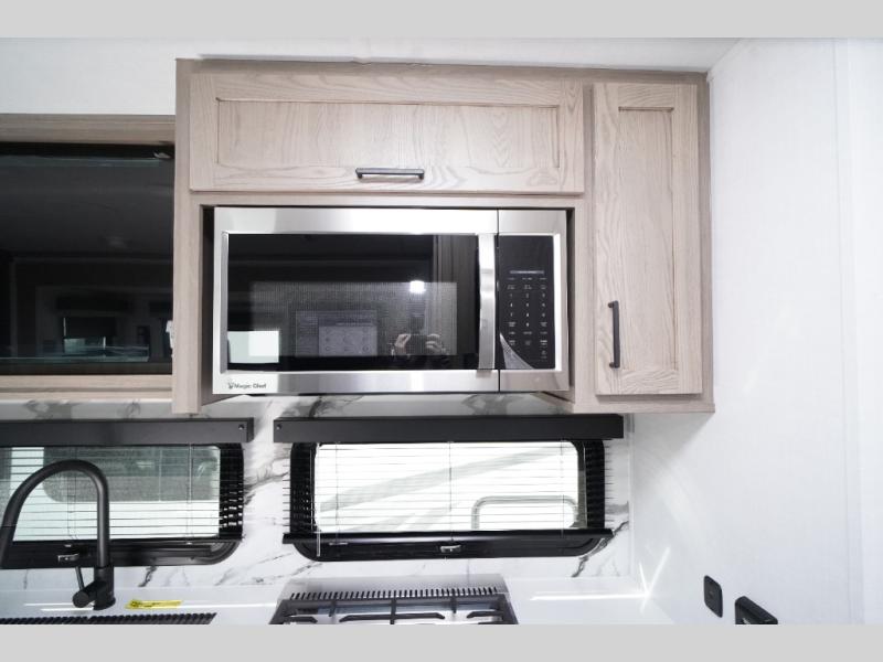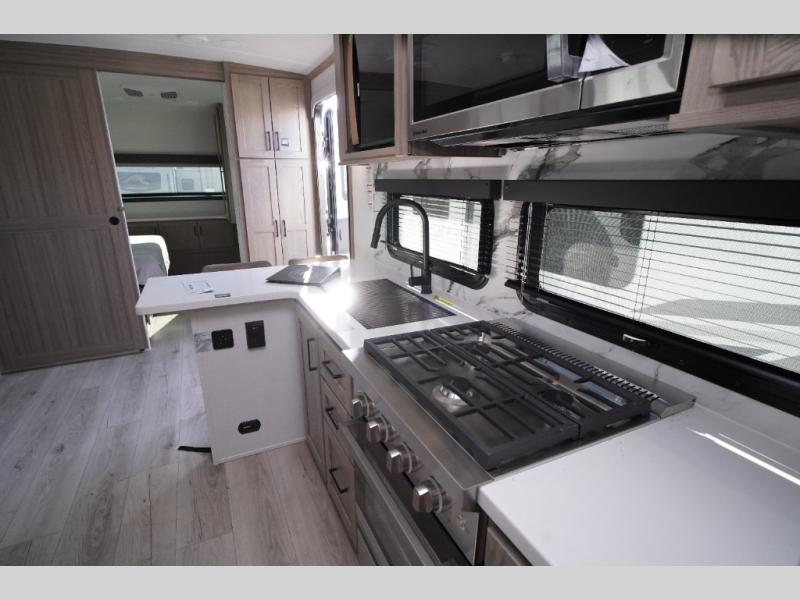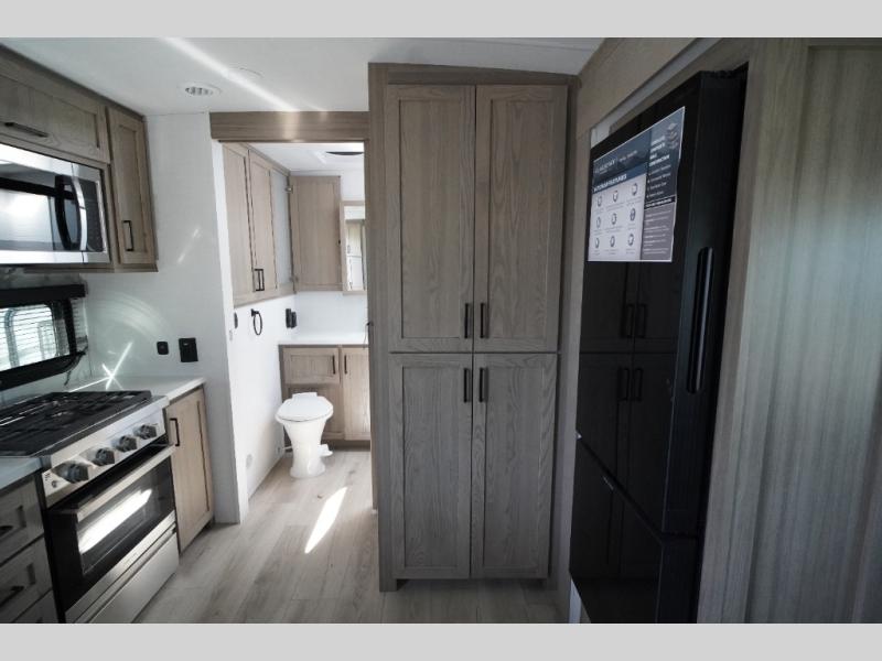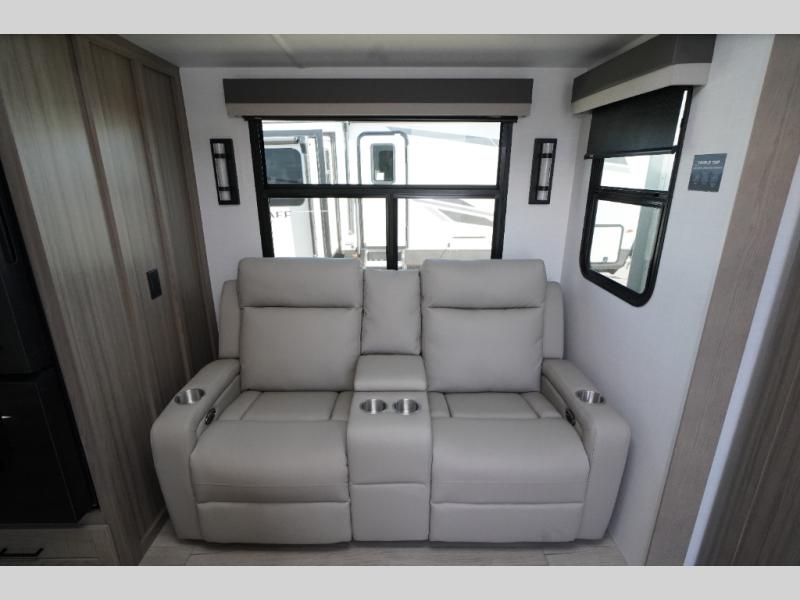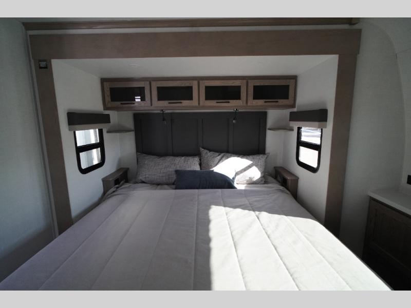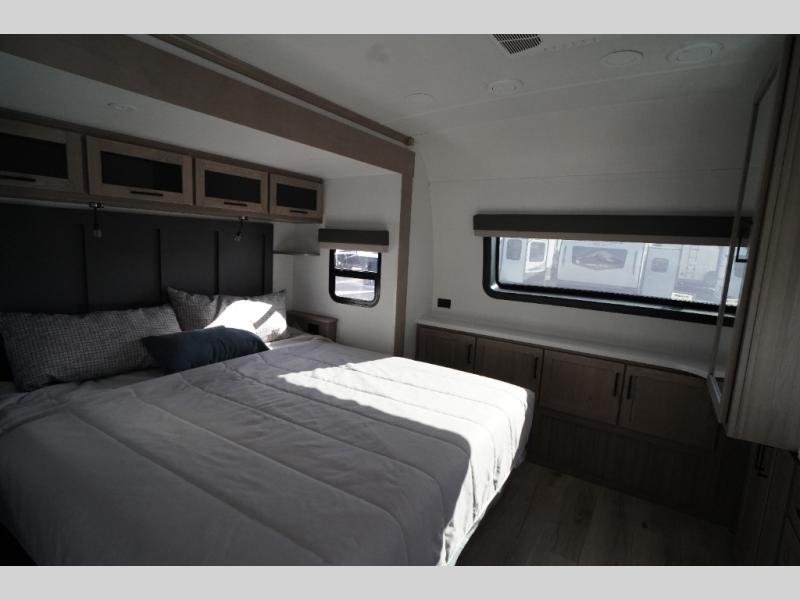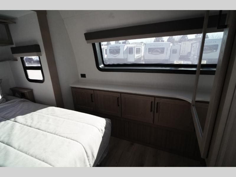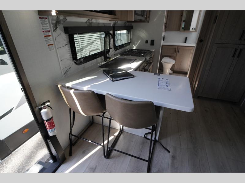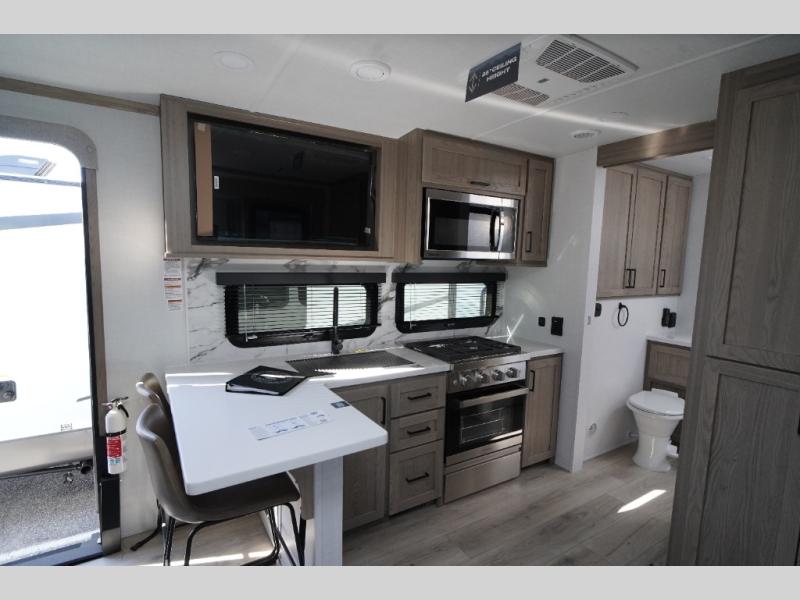 This travel trailer is the perfect couples coach to get away featuring dual slides for added interior space. The main entry leads into a combined kitchen and living room providing an L-shaped counter with two-person bar top seating! This is a great place to enjoy your meals and morning coffee inside. Your nights will be spent in true relaxation with the 67" theater seating to watch TV, and a king bed slide in the front bedroom for a great night's rest. The full rear bathroom features a shower with a seat plus linen storage for clean towels. You can also choose to cook outdoors when you have an outside kitchen with a pull-out griddle, plus a 22' awning. This creates a nice outdoor living area that is perfect both day and night!