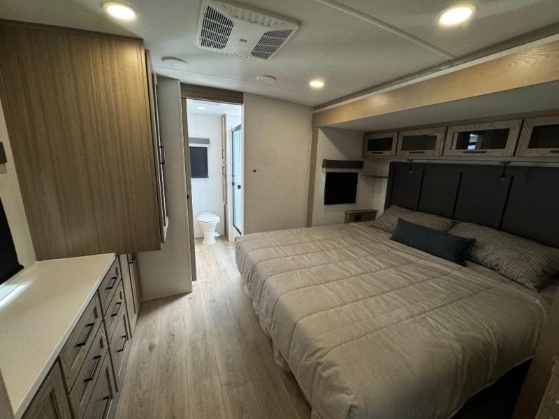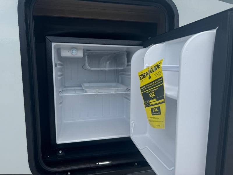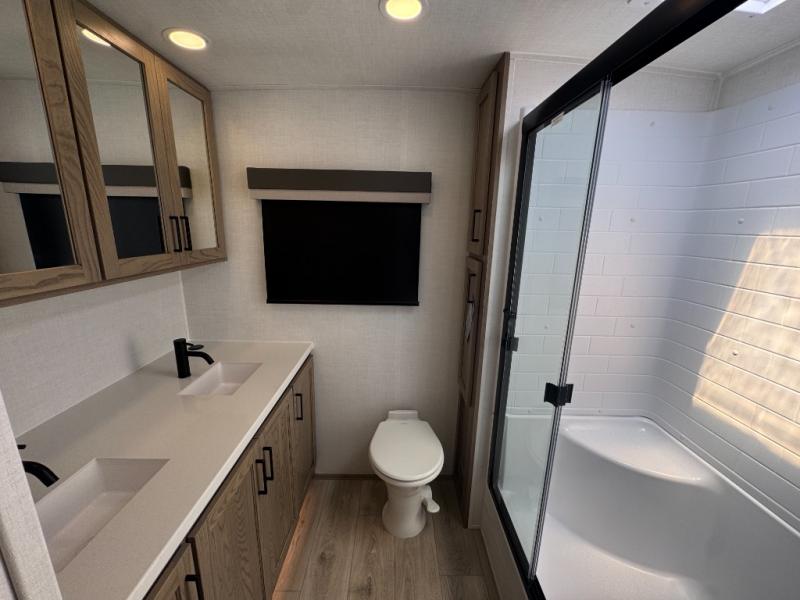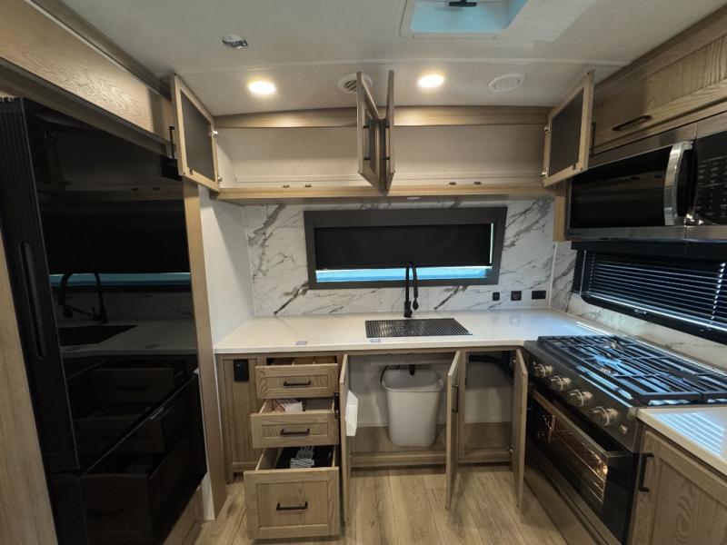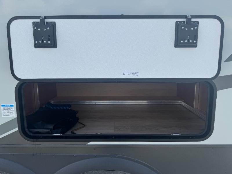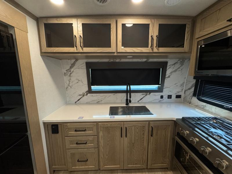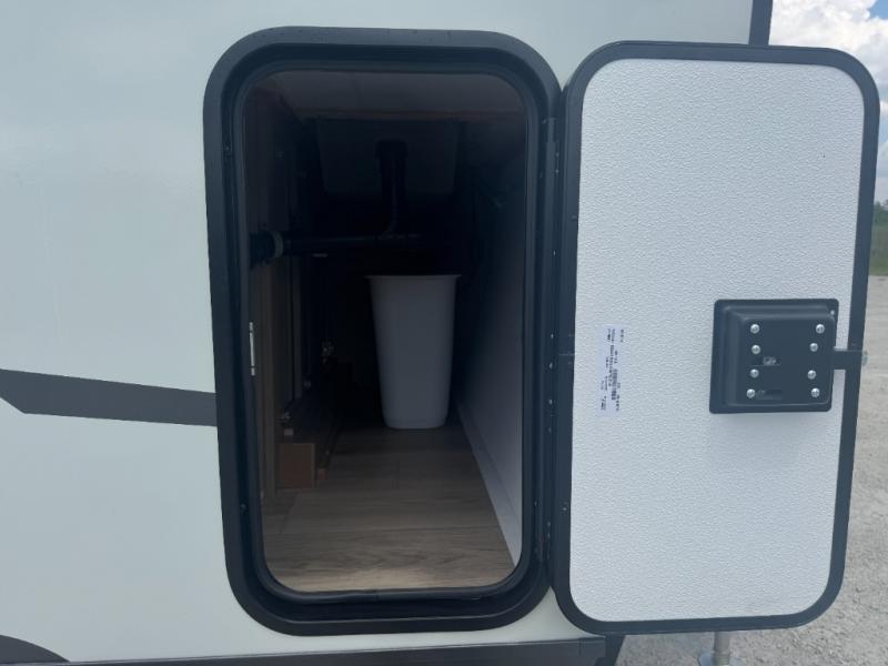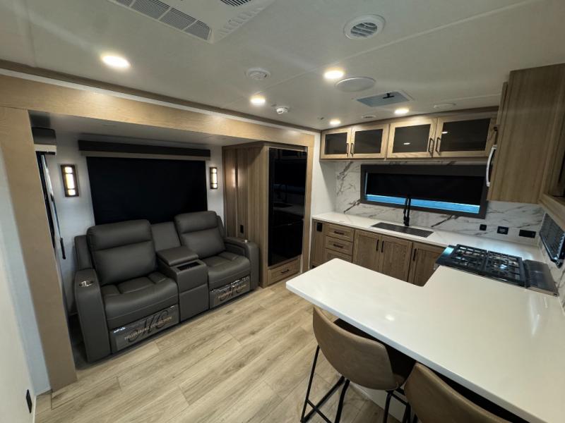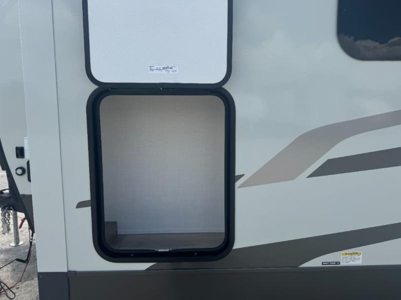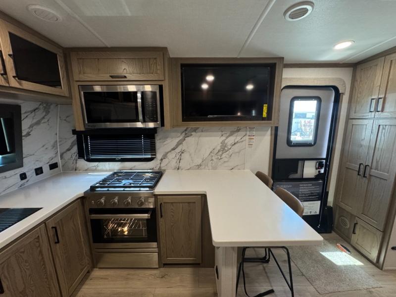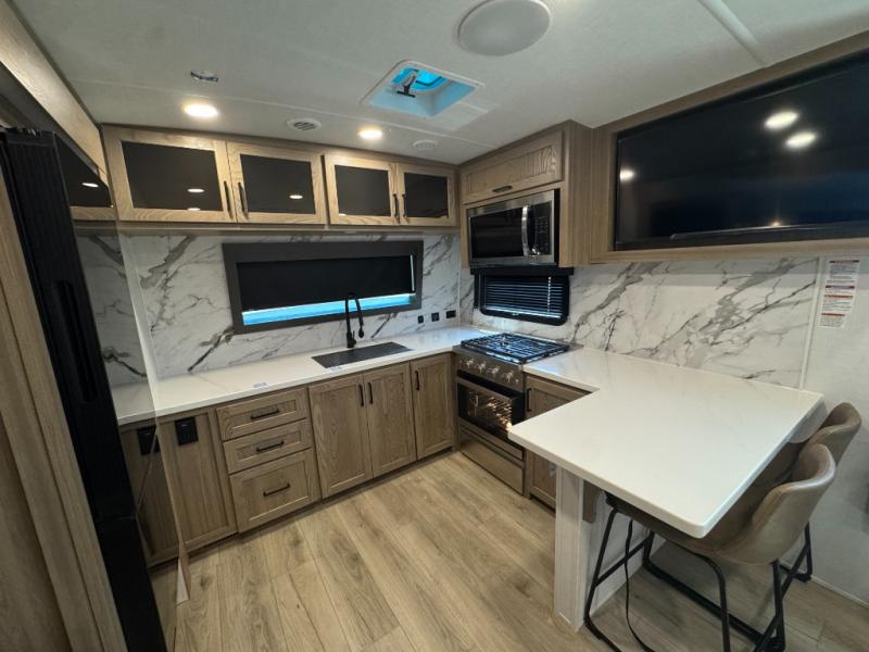 You will love how open this travel trailer will feel with the large front window that you can look out from the two-person bar top seating! The front kitchen has plenty of countertop space for you to prepare your best meals. Your nights will be spent in true relaxation with a 67" theater seating and king bed slide in the bedroom for a great night's rest. The full rear bathroom has a shower with a seat to take a nice, hot shower before bed, and a dual-sink vanity for two to get ready at once in the mornings!