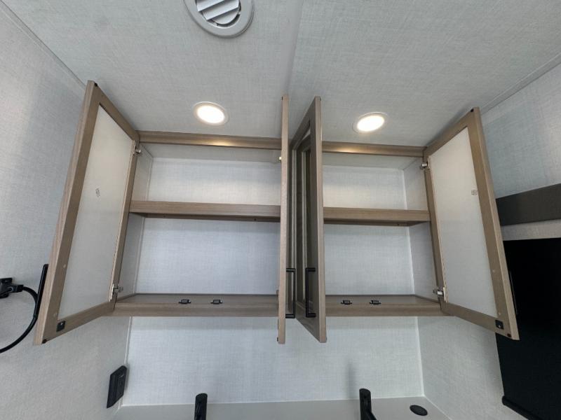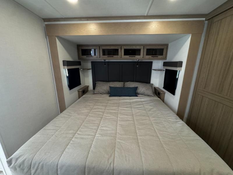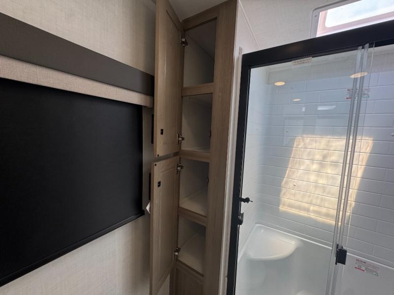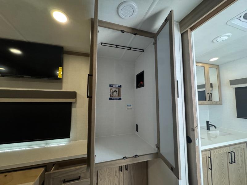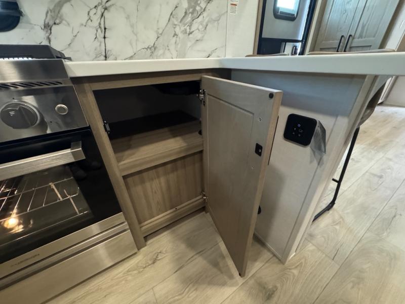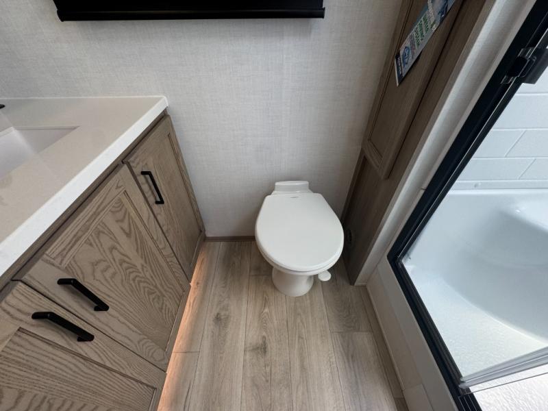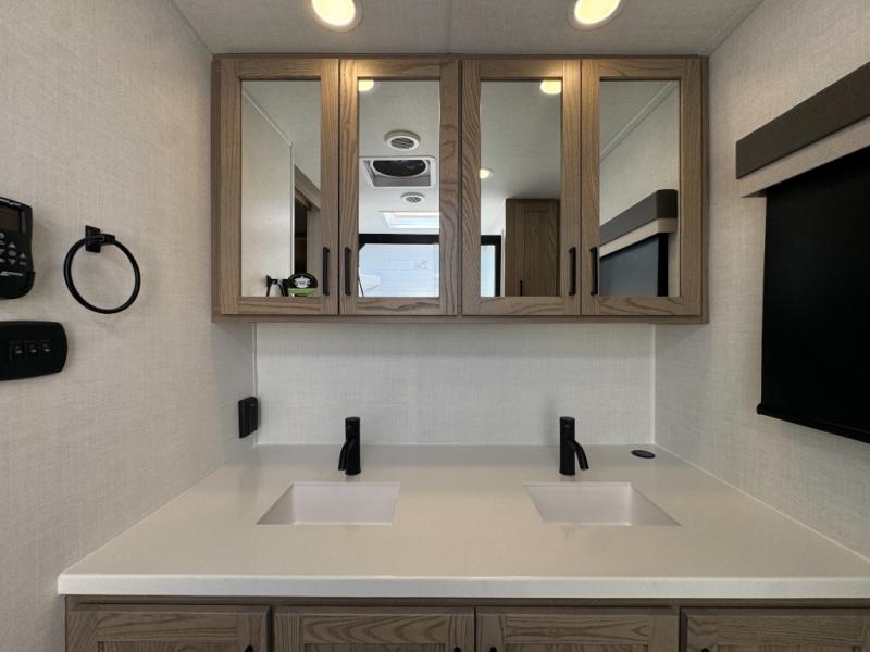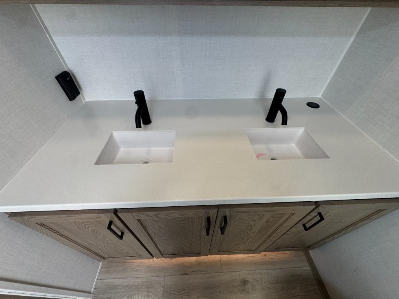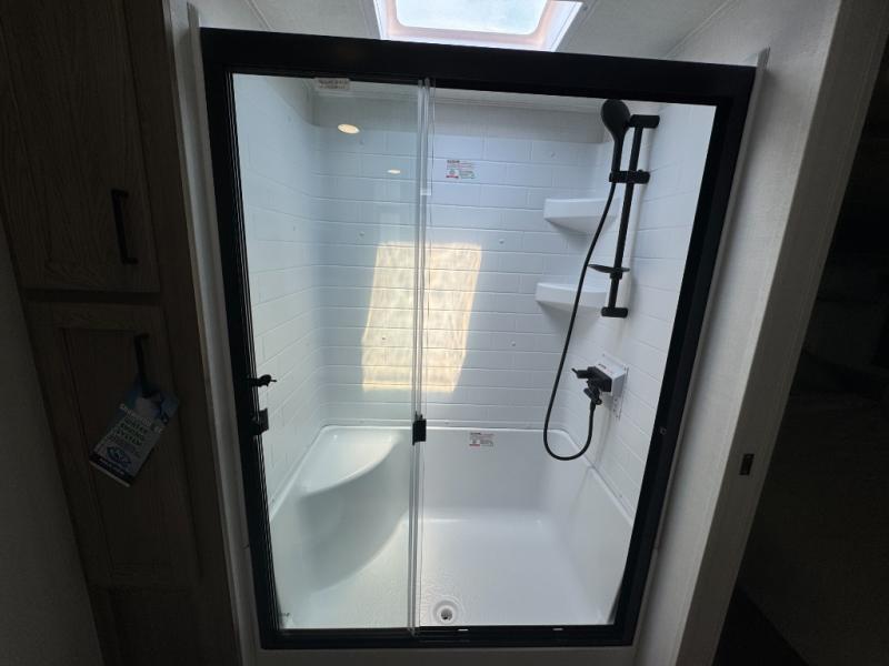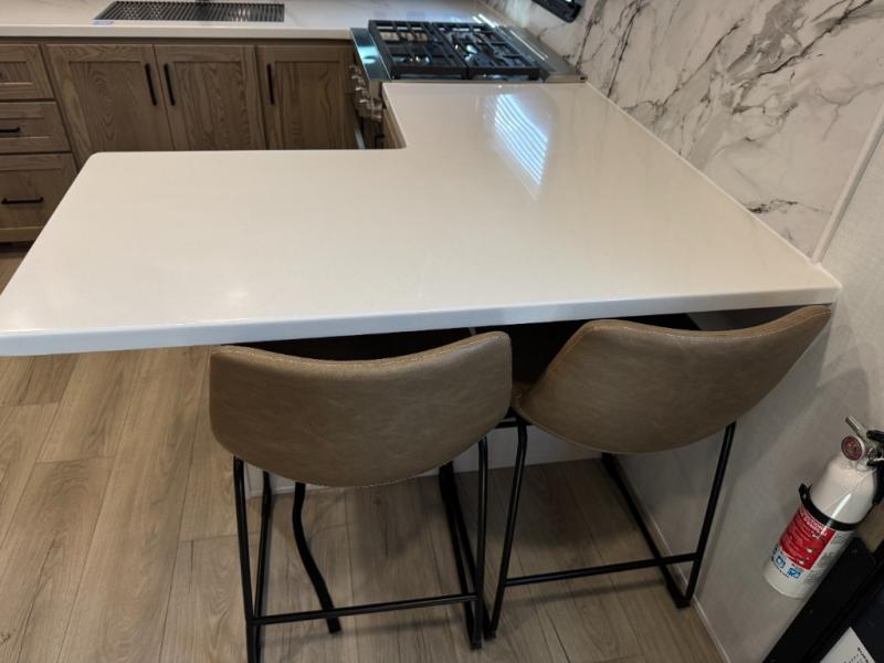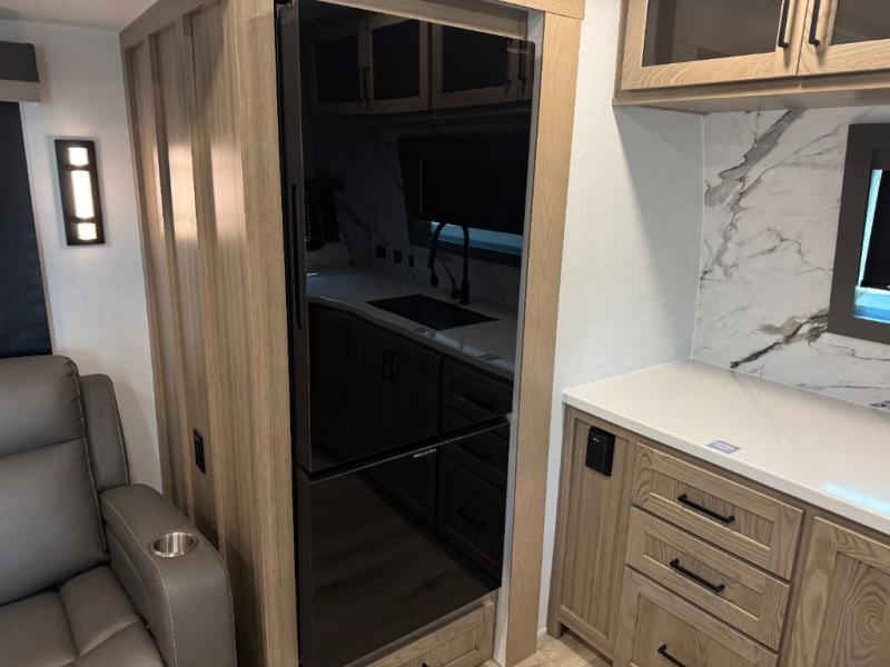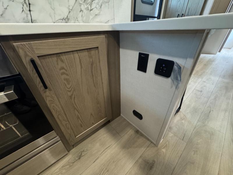 You will love how open this travel trailer will feel with the large front window that you can look out from the two-person bar top seating! The front kitchen has plenty of countertop space for you to prepare your best meals. Your nights will be spent in true relaxation with a 67" theater seating and king bed slide in the bedroom for a great night's rest. The full rear bathroom has a shower with a seat to take a nice, hot shower before bed, and a dual-sink vanity for two to get ready at once in the mornings!